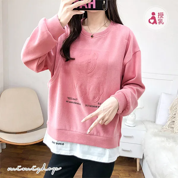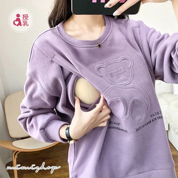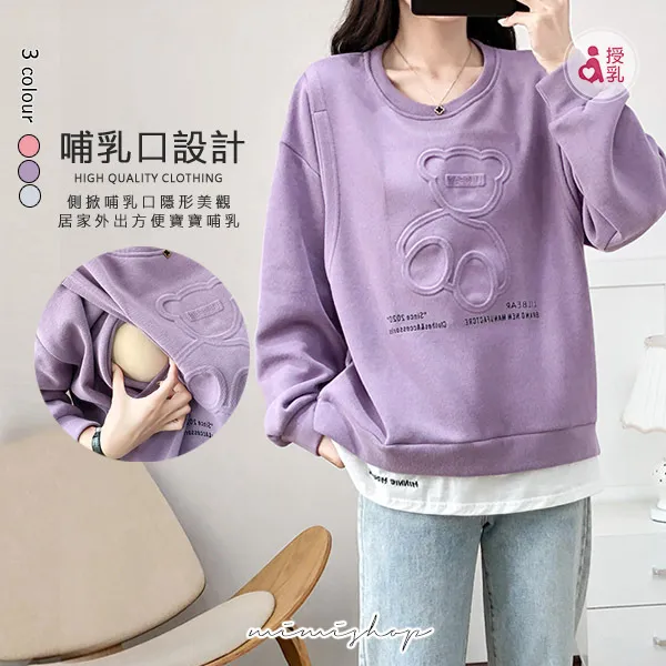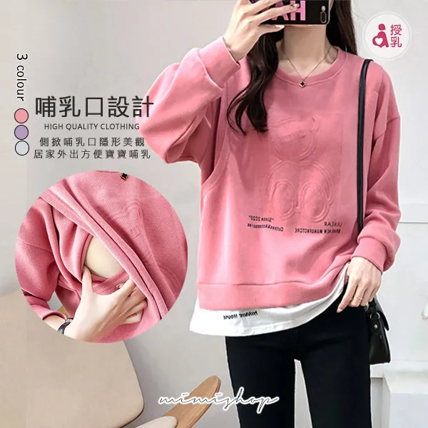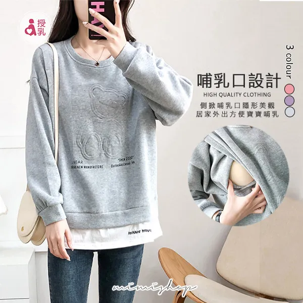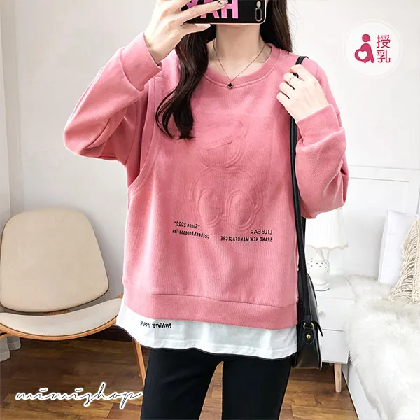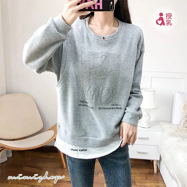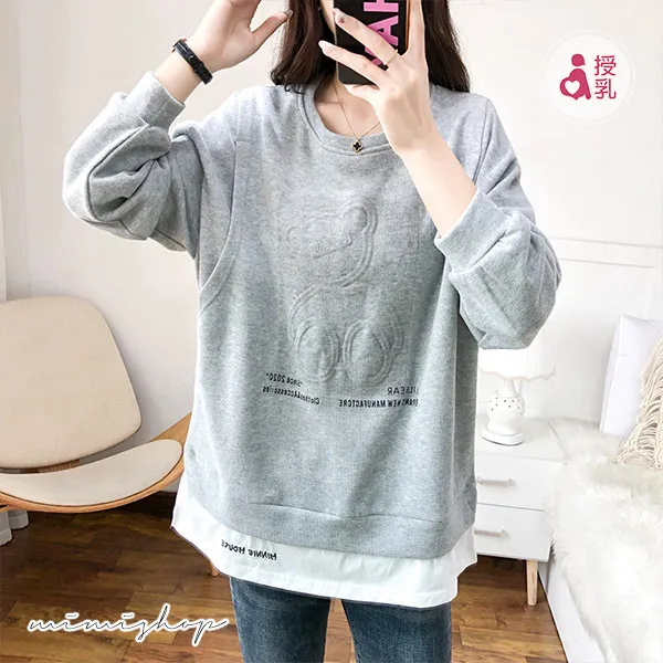 【P12384】百搭假兩件 優質棉小熊長袖哺乳衣 坐月子 孕哺兩用
