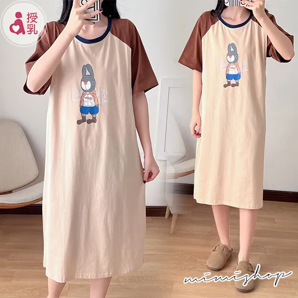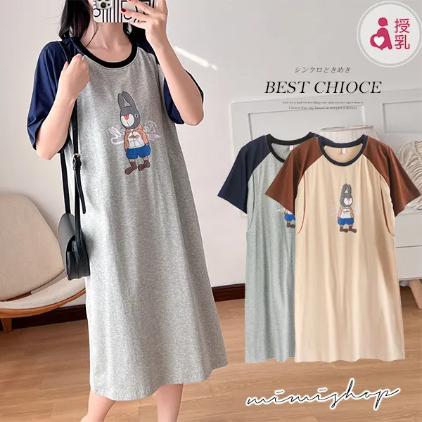【P12398】單穿就舒適 小兔先生撞色哺乳衣 孕婦裙 孕哺兩用