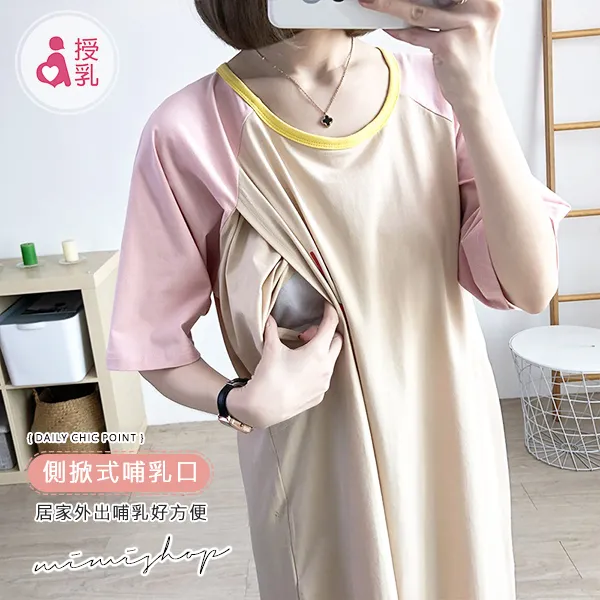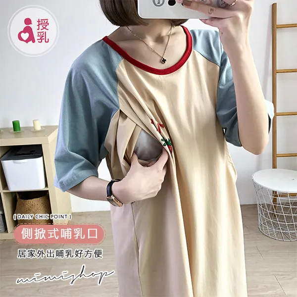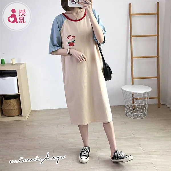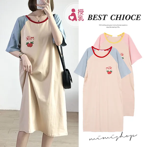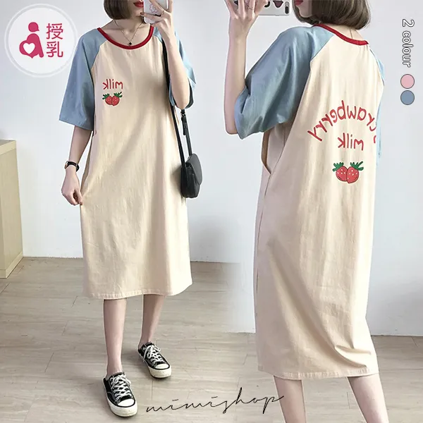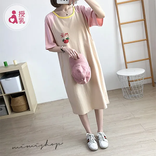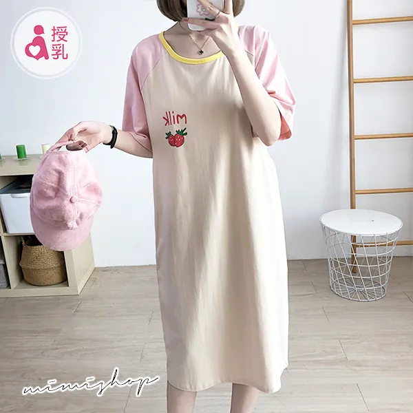 【P12463】Cute草莓 短袖高棉質哺乳裙 哺乳衣 孕婦裙 坐月子
