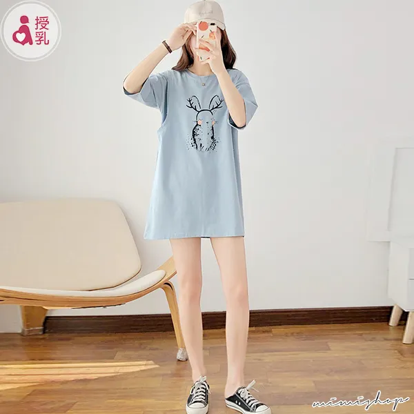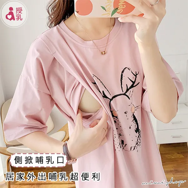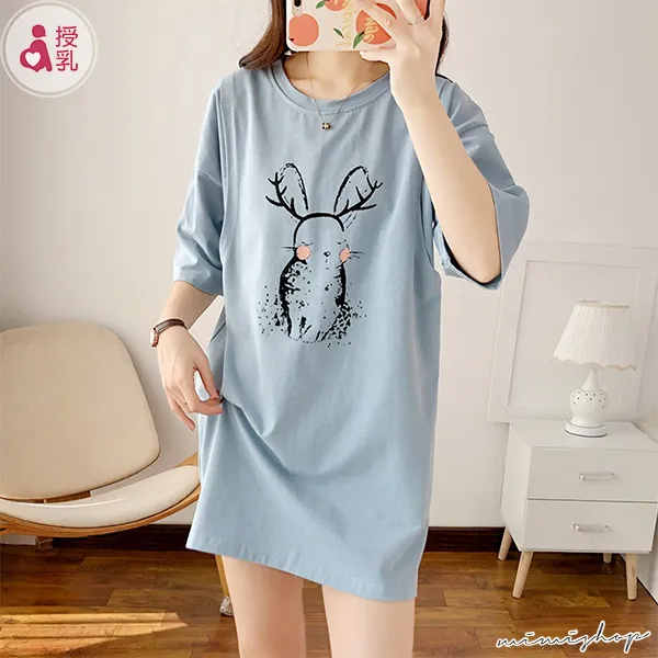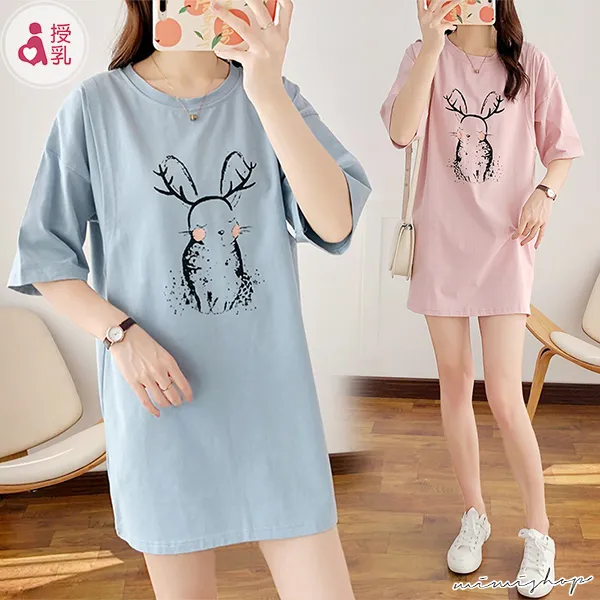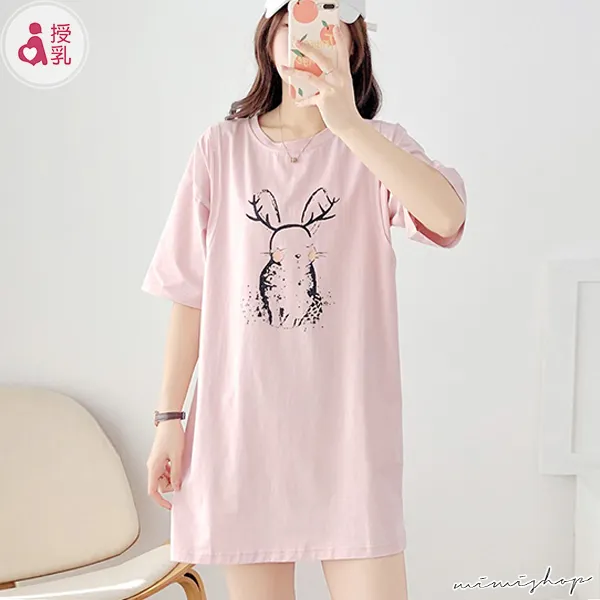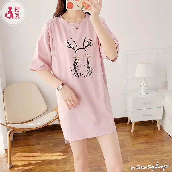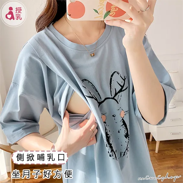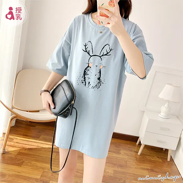 【P12464】 塗鴉小兔 短袖高棉質哺乳衣 孕哺兩用 坐月子