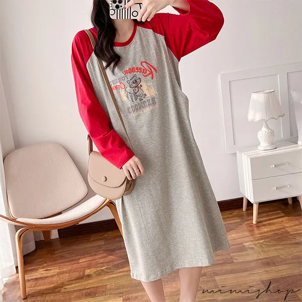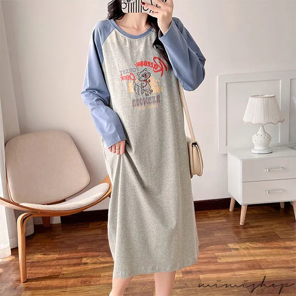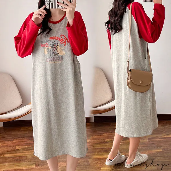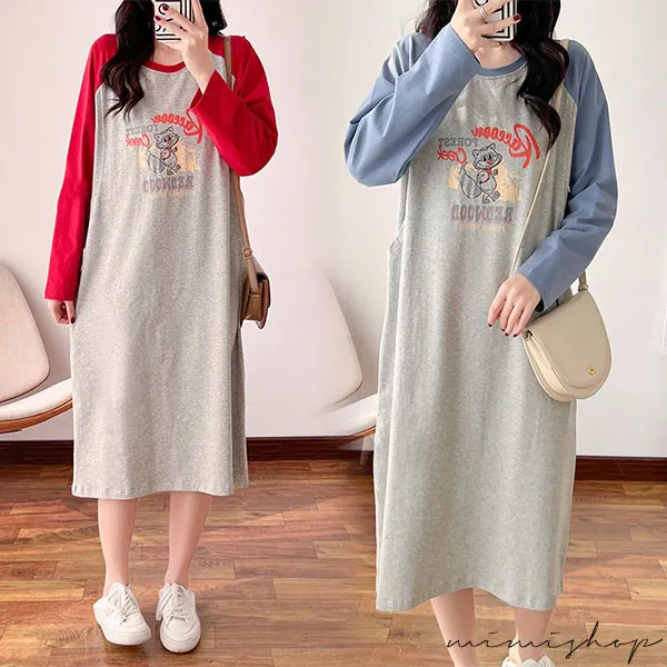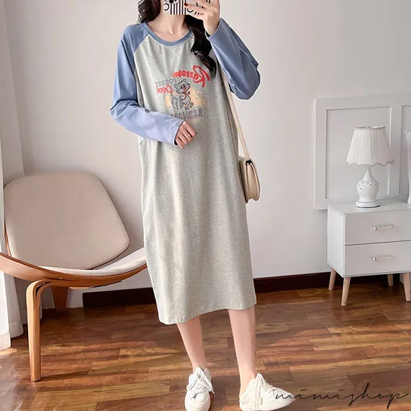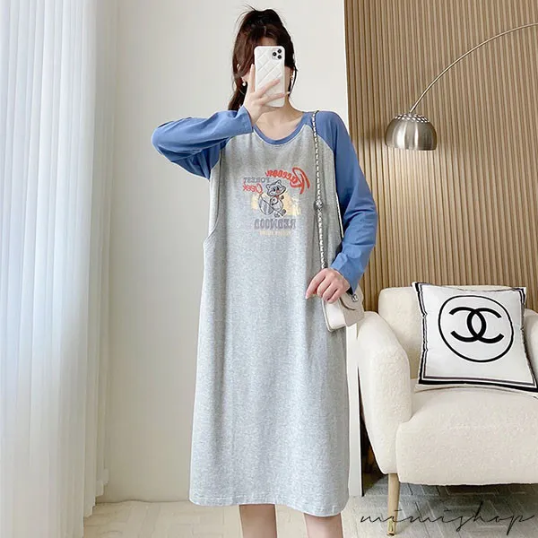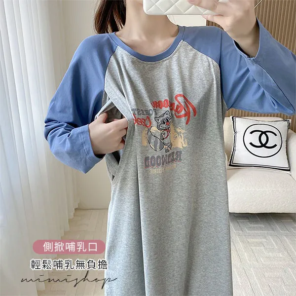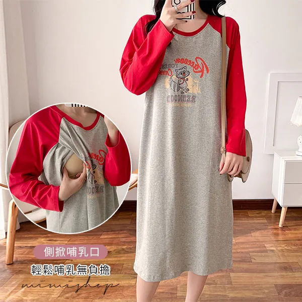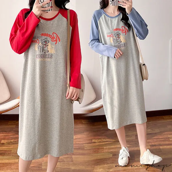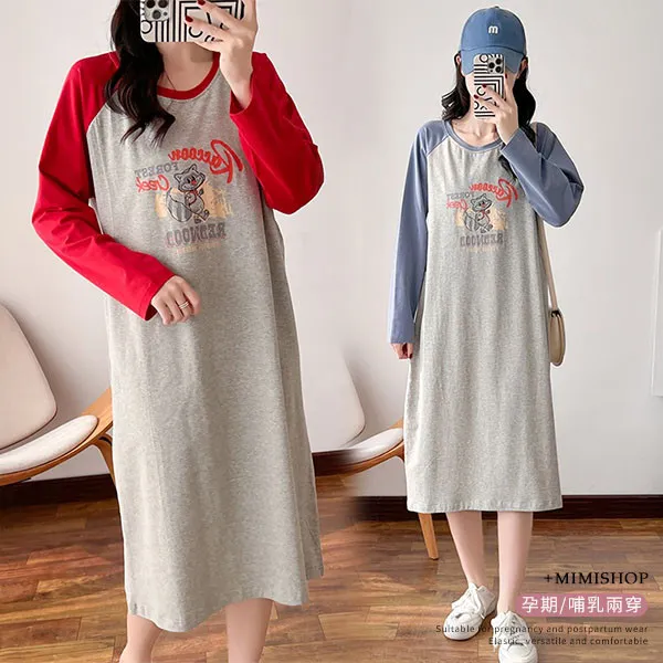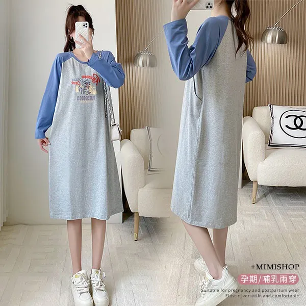【P12467】孕哺兩用 高棉質長袖撞色卡通哺乳衣 哺乳裙 孕婦洋裝