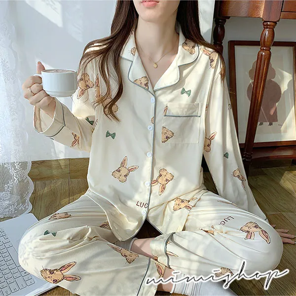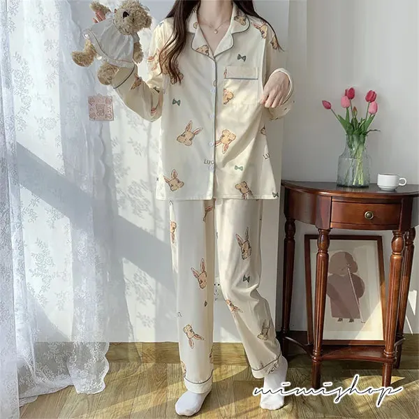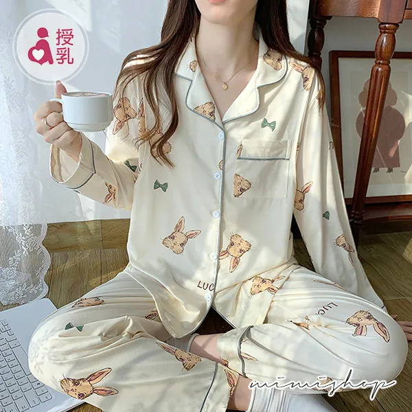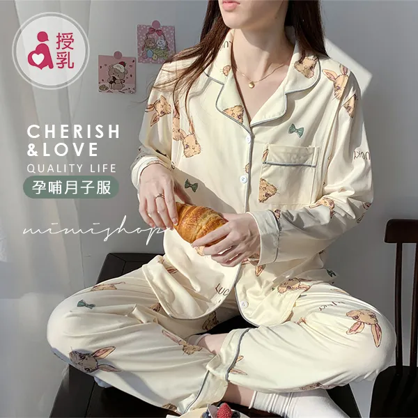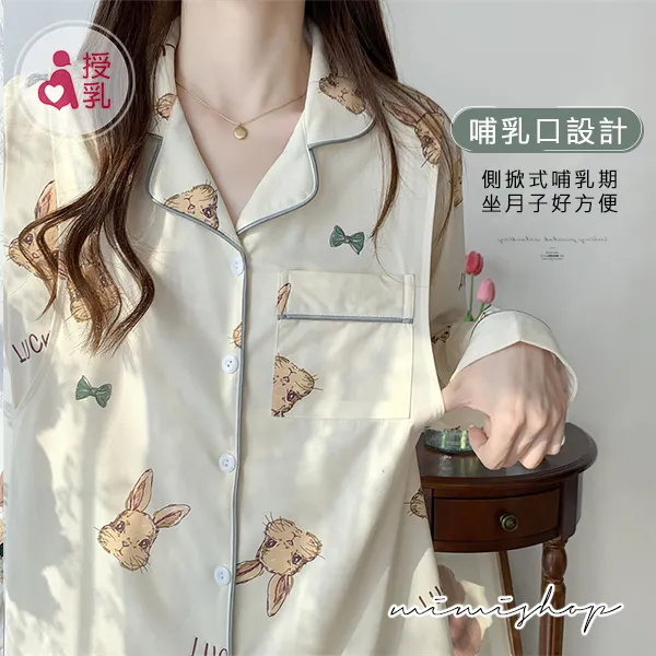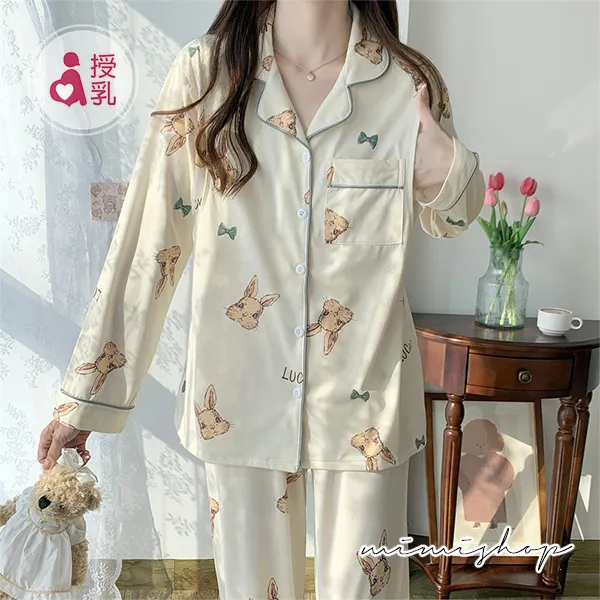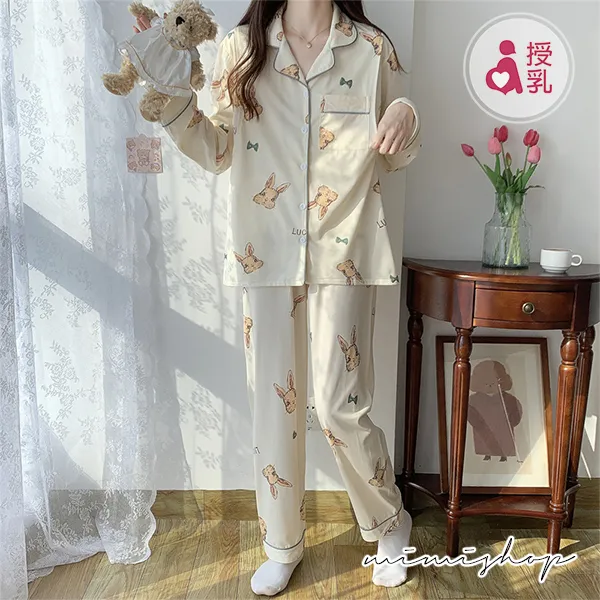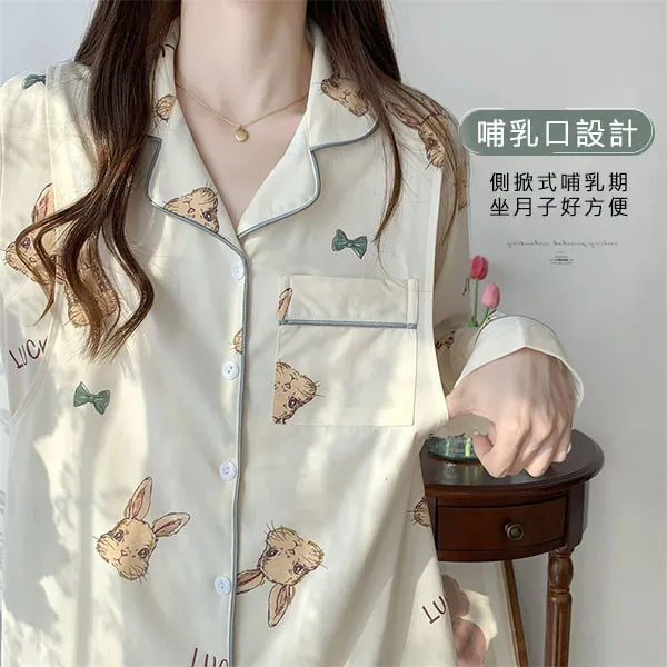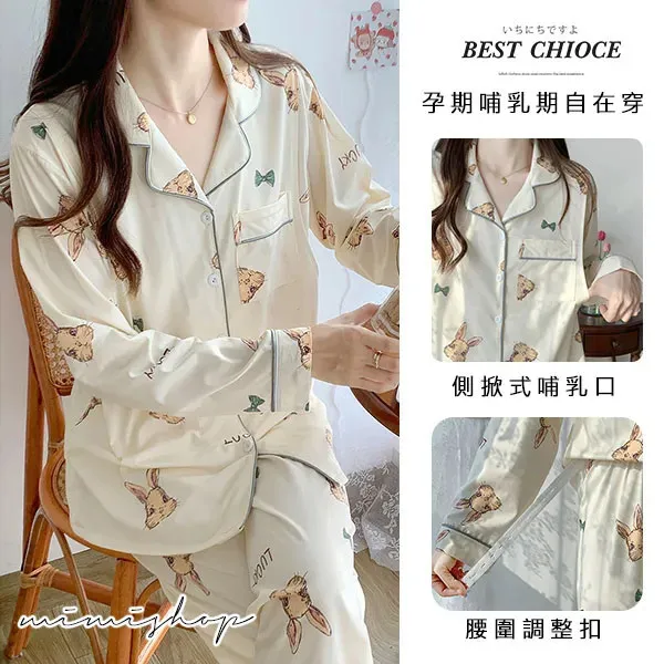 【P21347】香甜夢境 手繪小兔舒適棉哺乳衣+長褲 哺乳睡衣 居家坐月子
