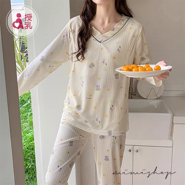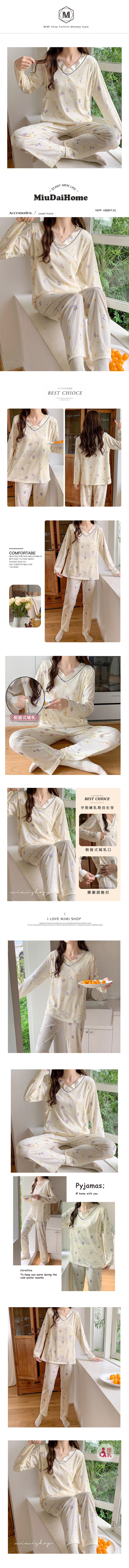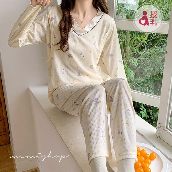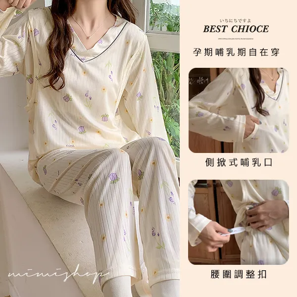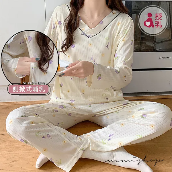 【P21355】浪漫紫花 針織紋透氣哺乳衣+長褲 哺乳睡衣 居家坐月子