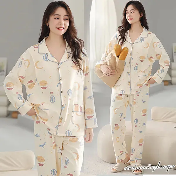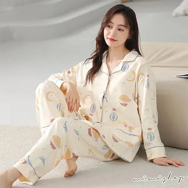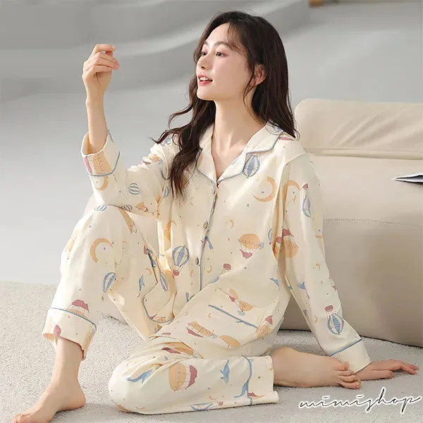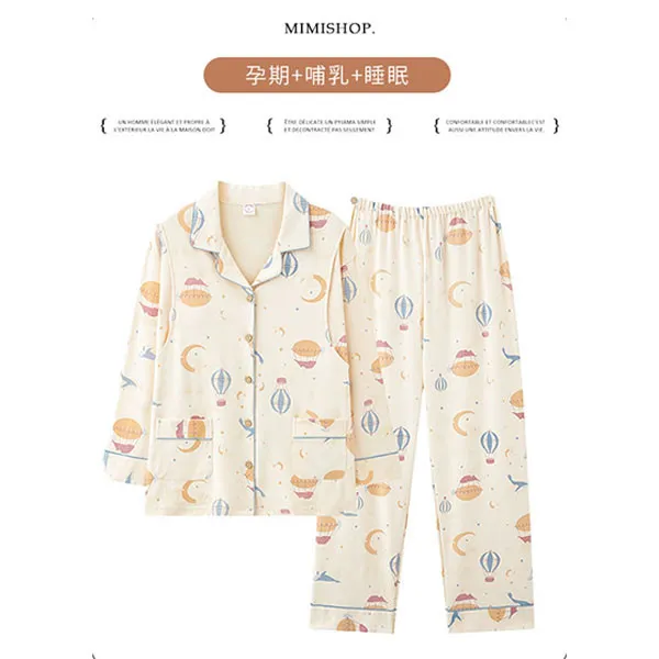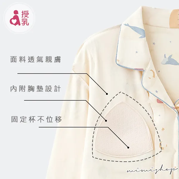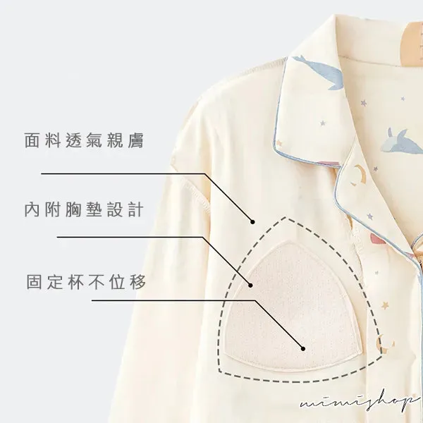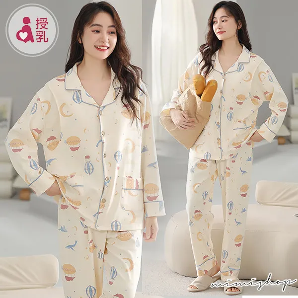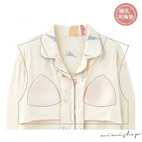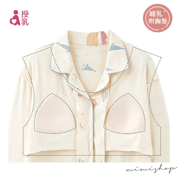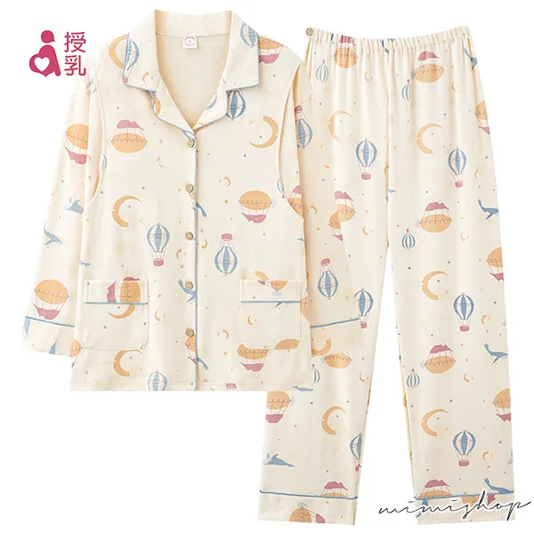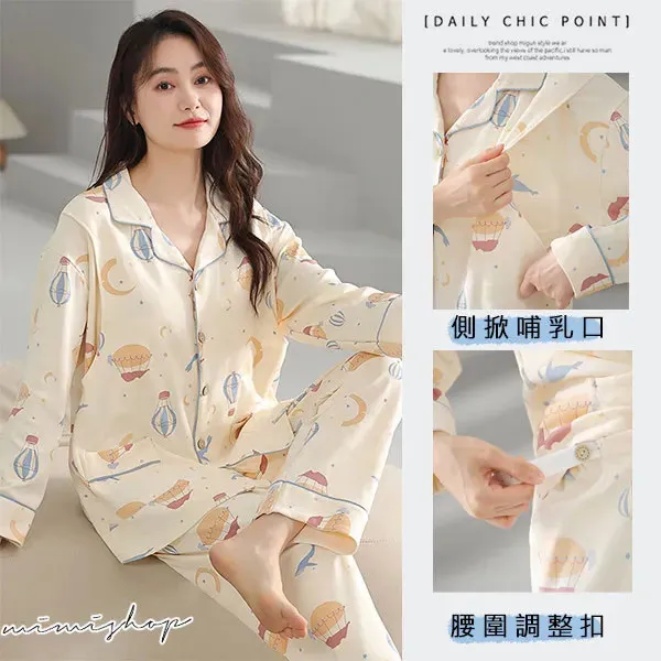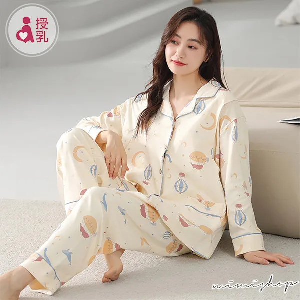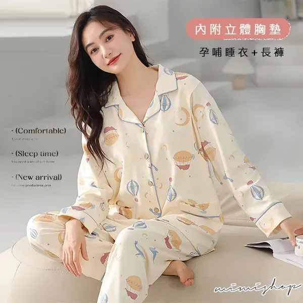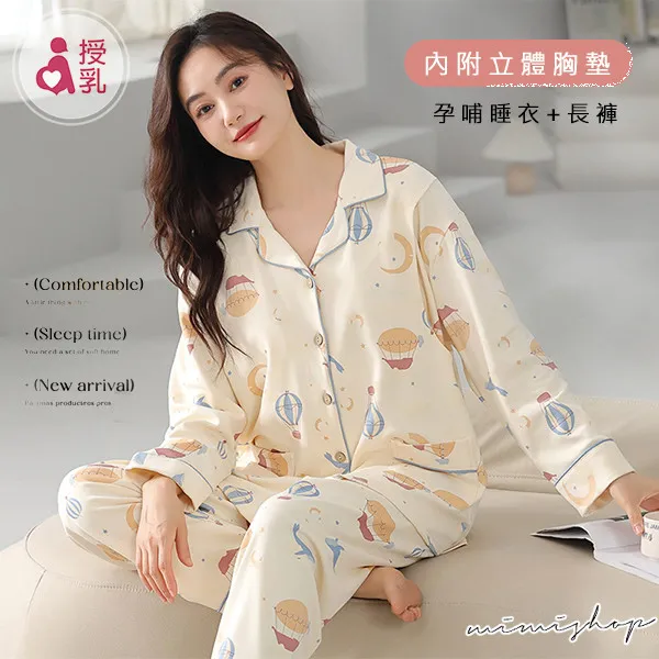 【P21421】夢幻熱氣球 舒適柔棉胸墊哺乳衣+長褲 哺乳睡衣 居家坐月子