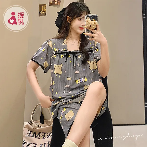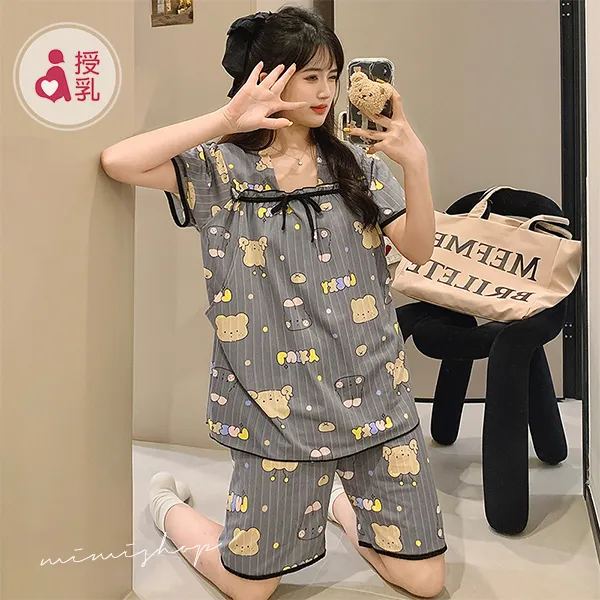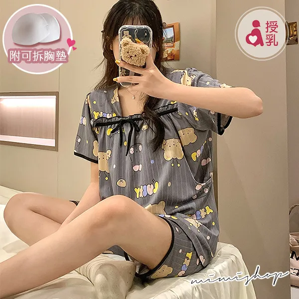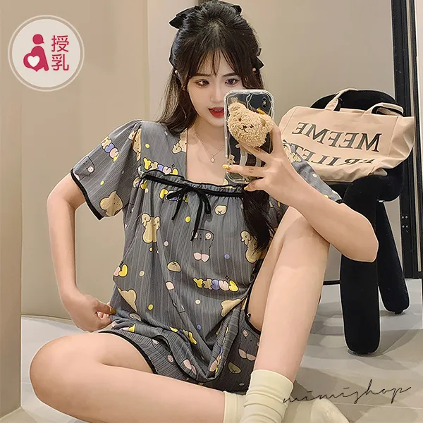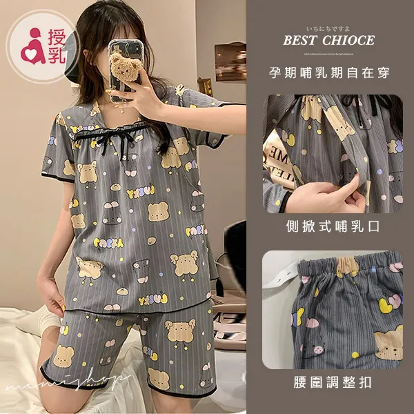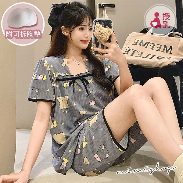 【P21439】舒適日常 繽紛熊兔附胸墊哺乳衣+短褲 哺乳睡衣 居家坐月子