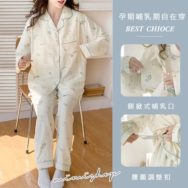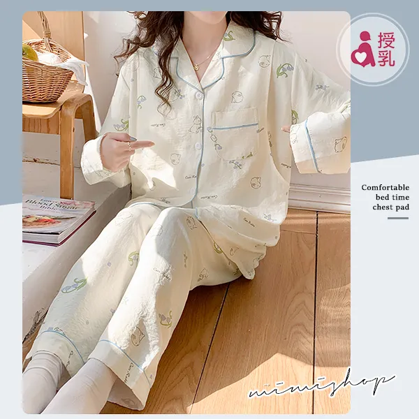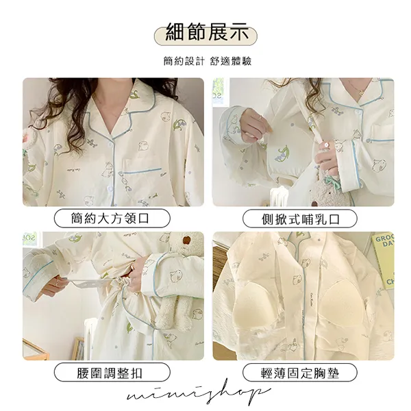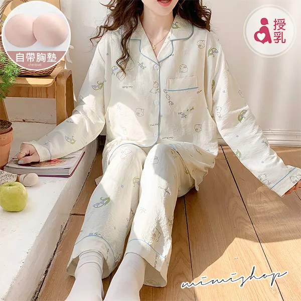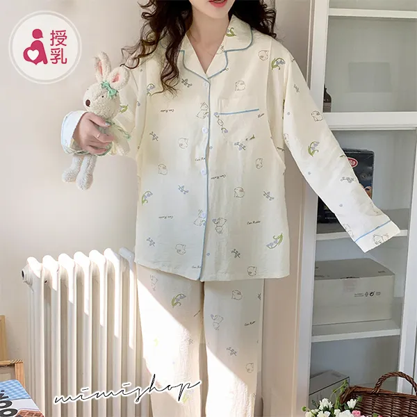 【P21446】附胸墊 萌萌小兔 療癒系棉質哺乳衣+長褲 哺乳睡衣 居家坐月子