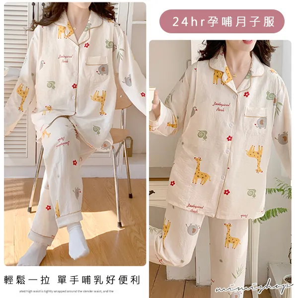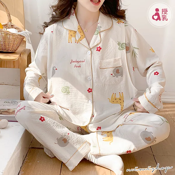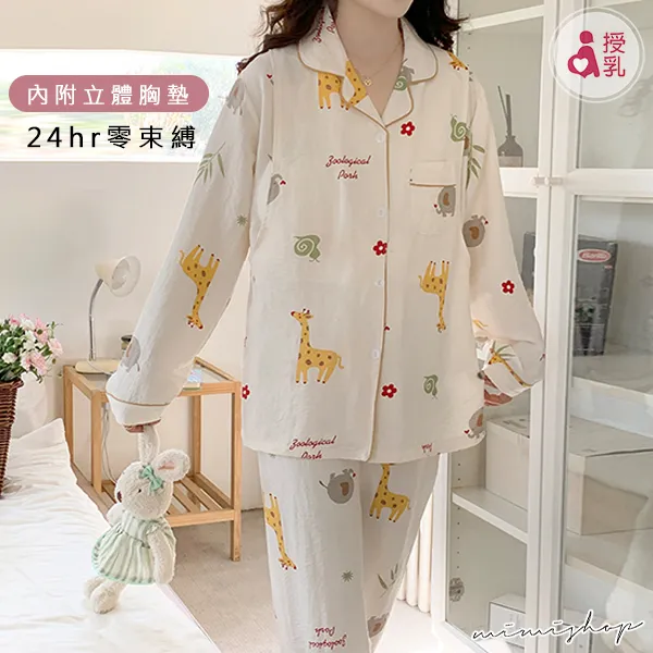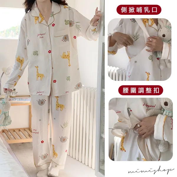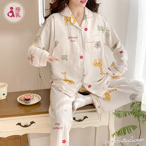【P21448】附胸墊 奇幻動物園 療癒系棉質哺乳衣+長褲 哺乳睡衣 居家坐月子