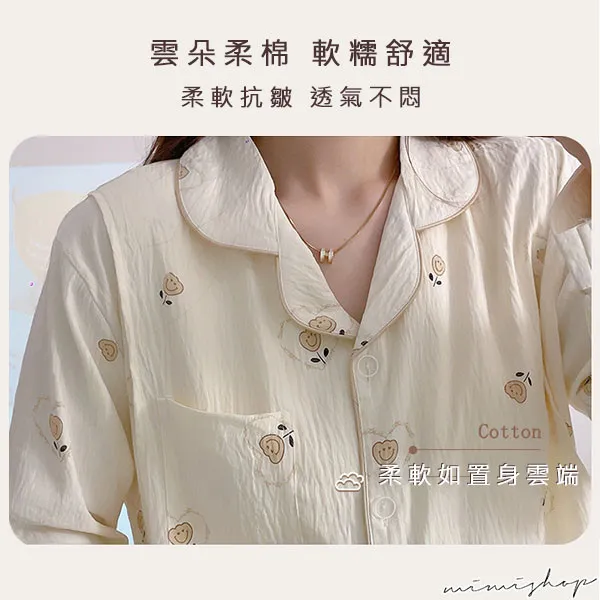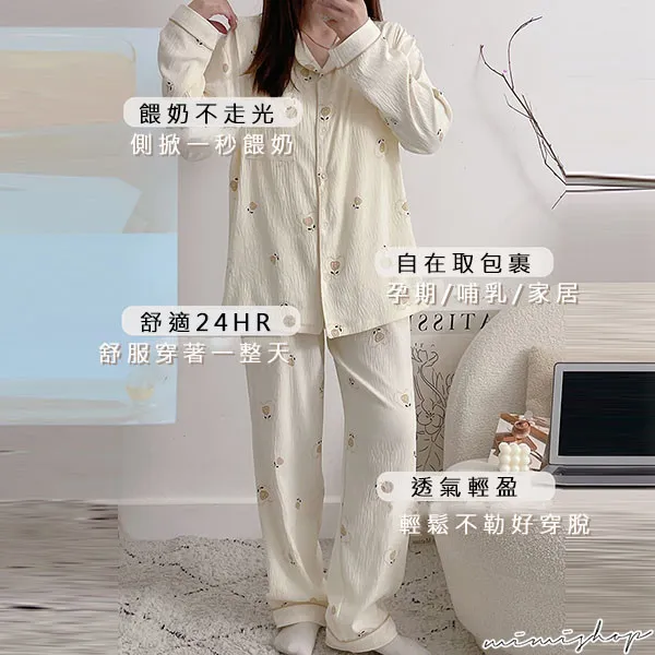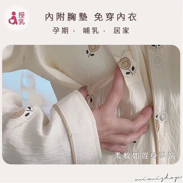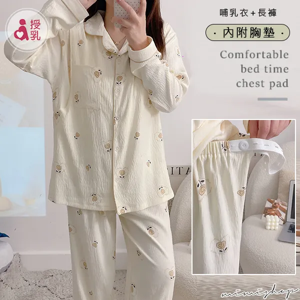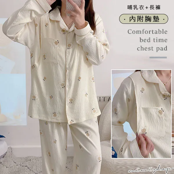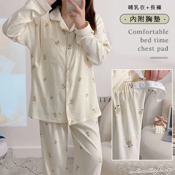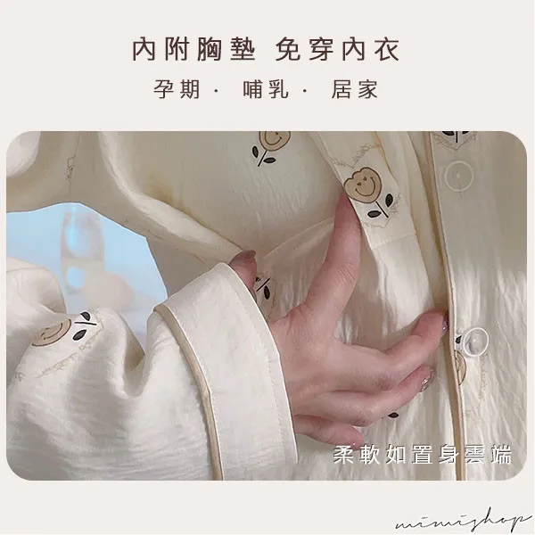 【P21452】附胸墊 微笑鬱金香紋理棉質哺乳衣+長褲 哺乳睡衣 居家坐月子