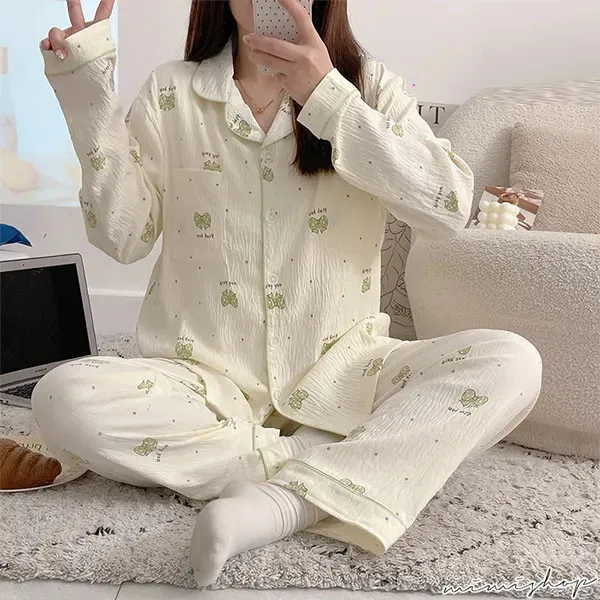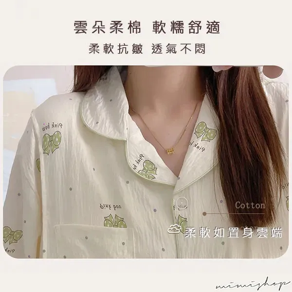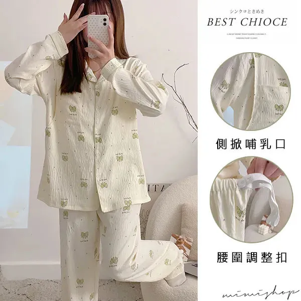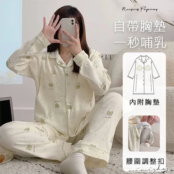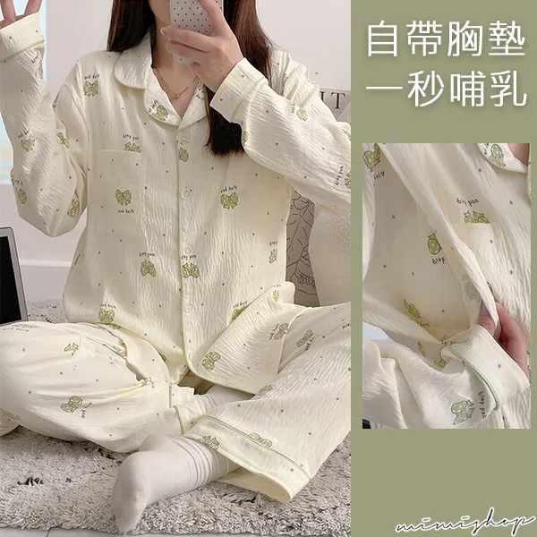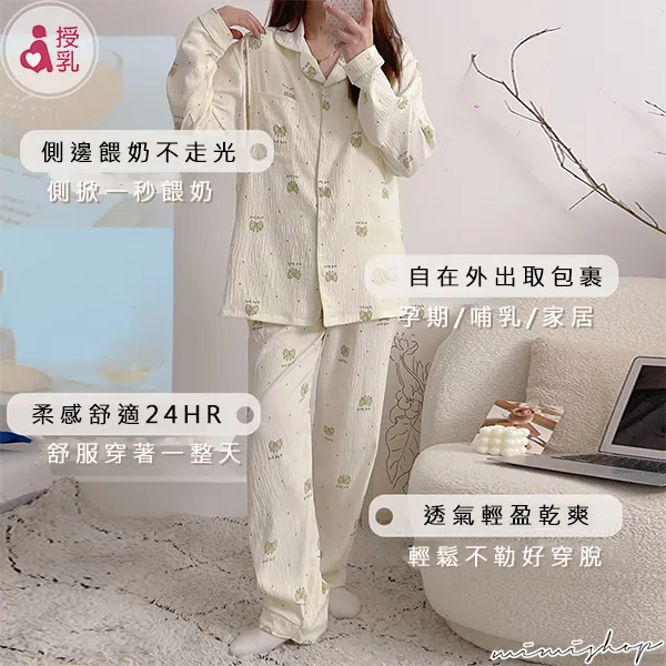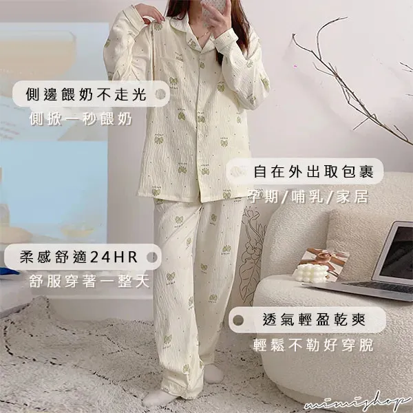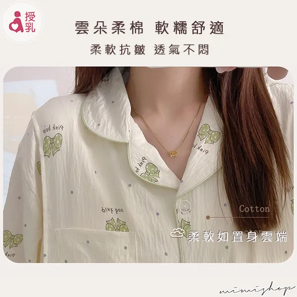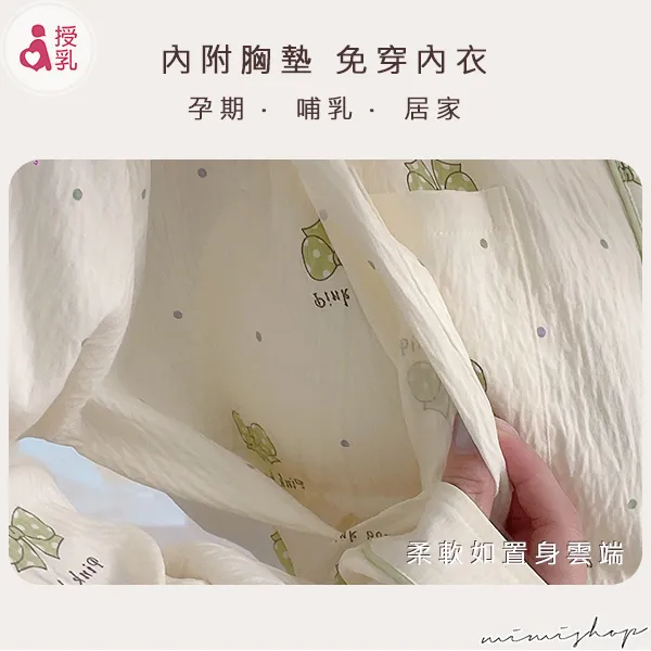 【P21453】附胸墊 果綠蝴蝶結紋理棉質哺乳衣+長褲 哺乳睡衣 居家坐月子