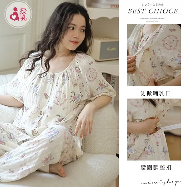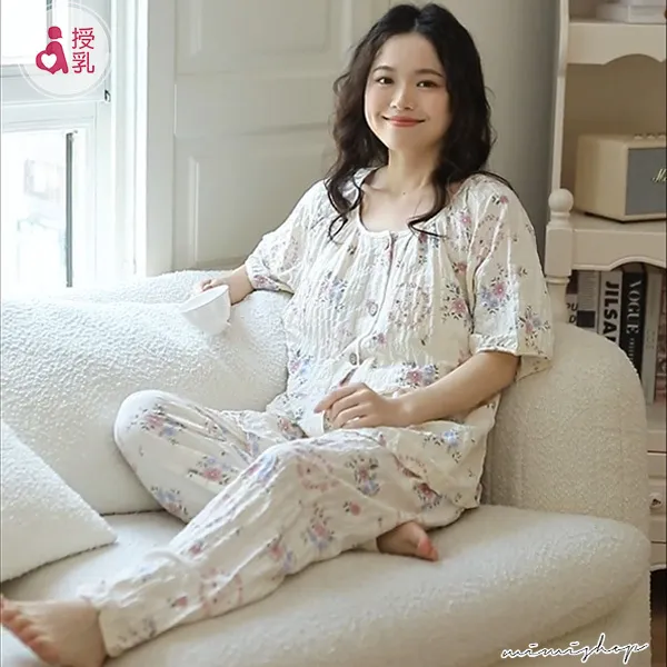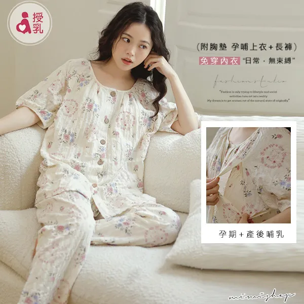【P21460】附胸墊 浪漫小花紋理棉質哺乳衣+長褲 哺乳睡衣 居家坐月子