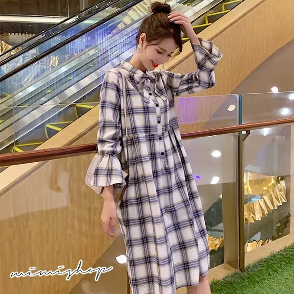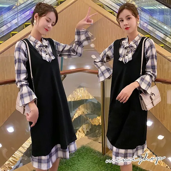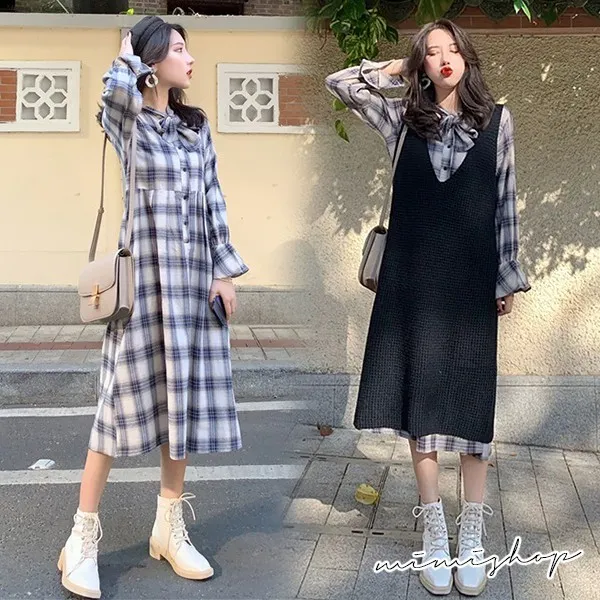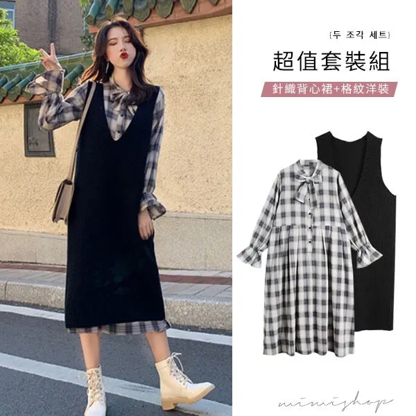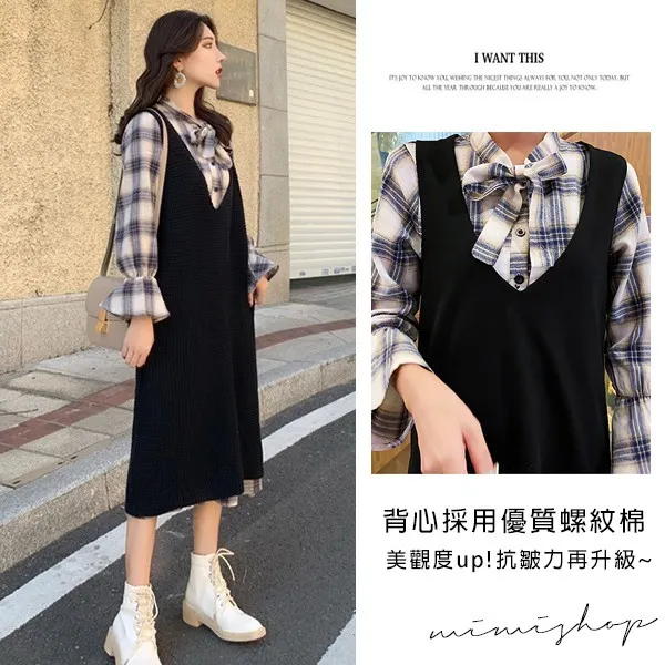 【P31366】英倫的浪漫邂逅 兩件式 螺紋背心裙+格紋連身裙 孕婦洋裝 長裙
