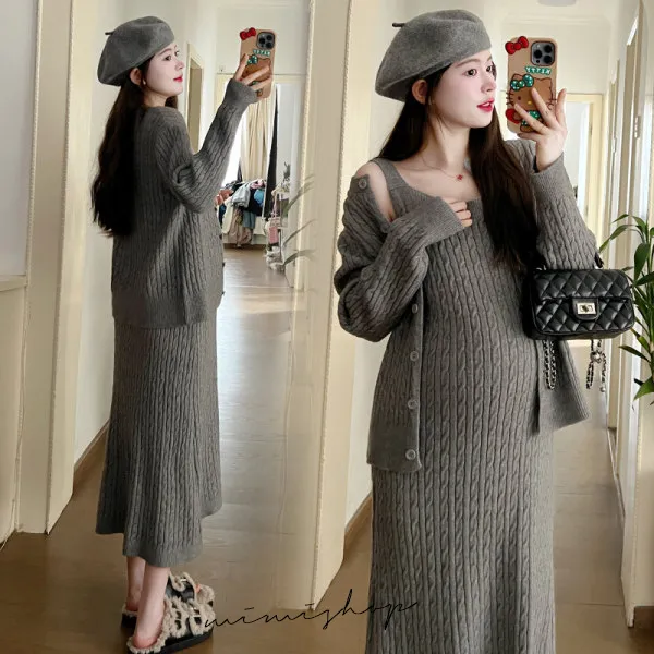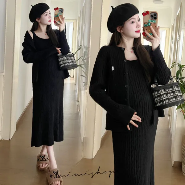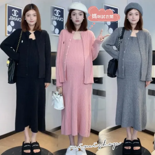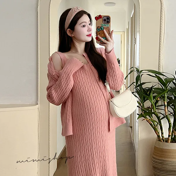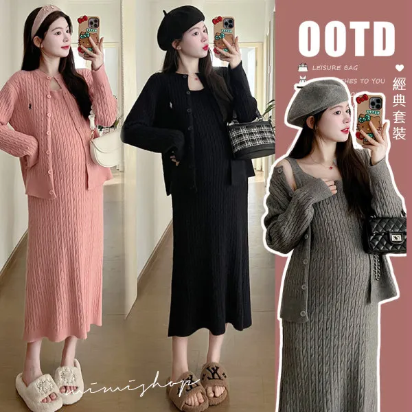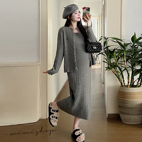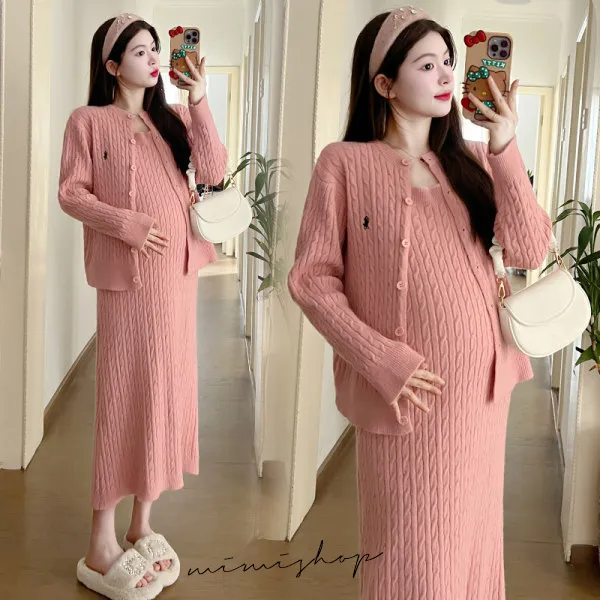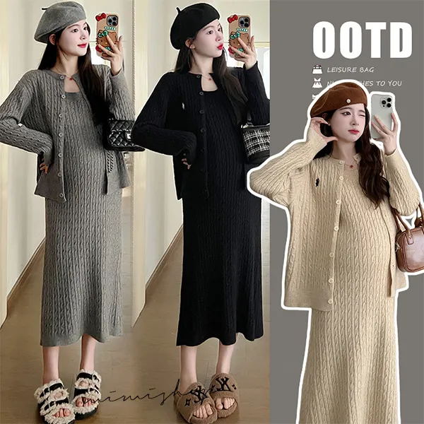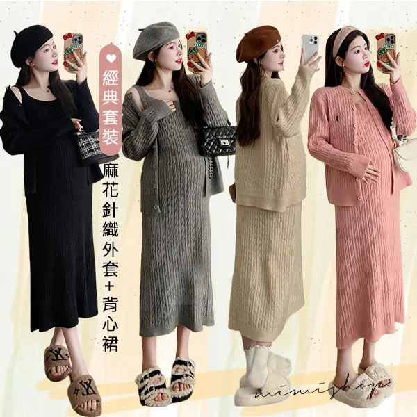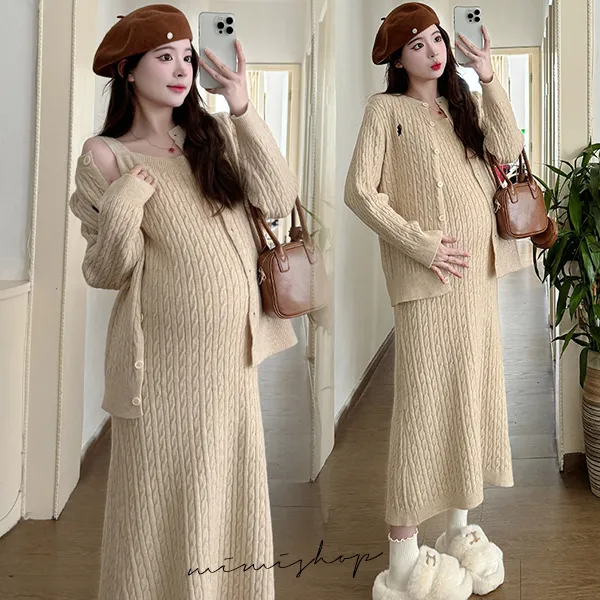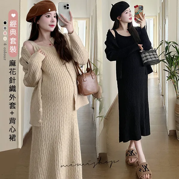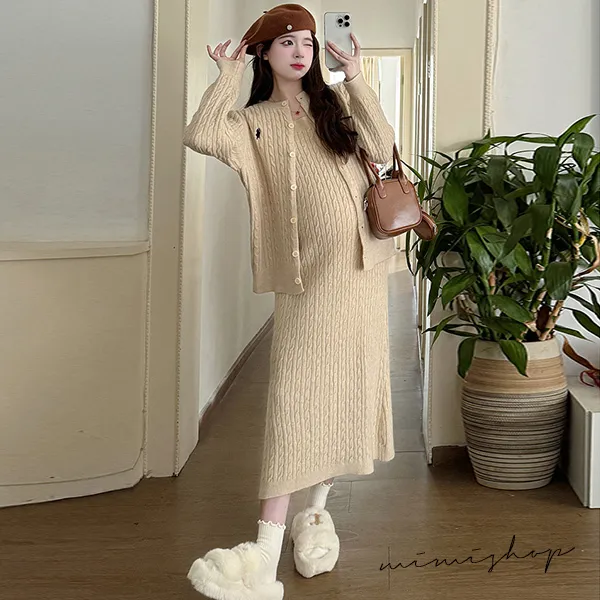 【P31652】經典兩件式 暖感麻花針織外套+針織裙 孕婦套裝