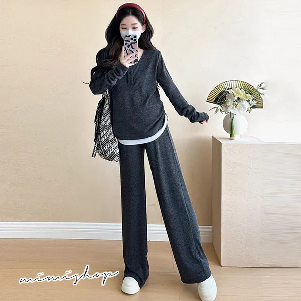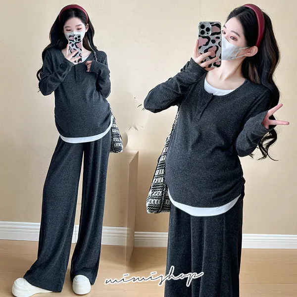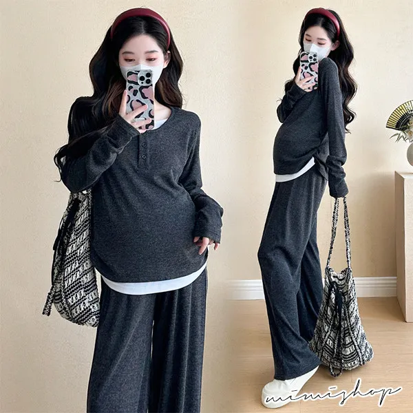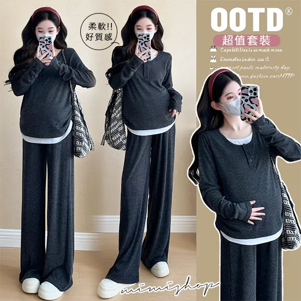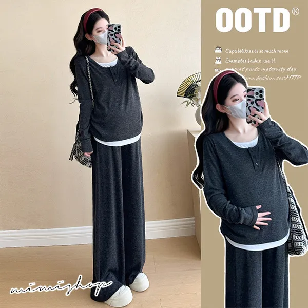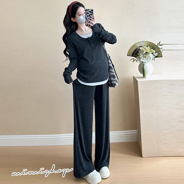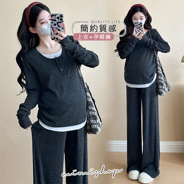 【P31656】簡約好質感 超值套裝 假兩件上衣+孕婦寬褲 休閒舒適