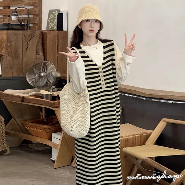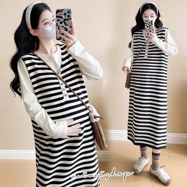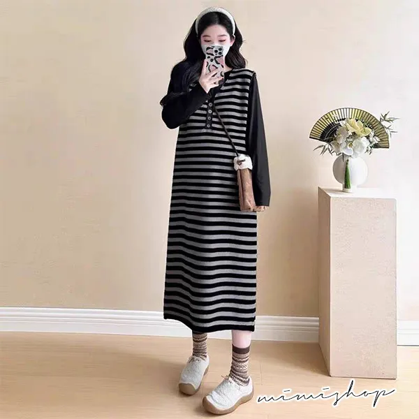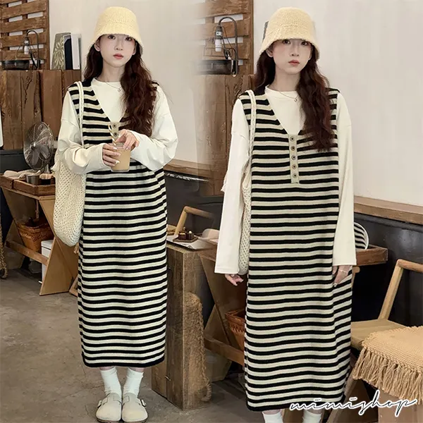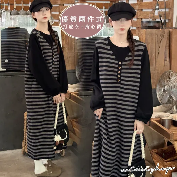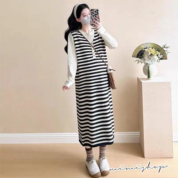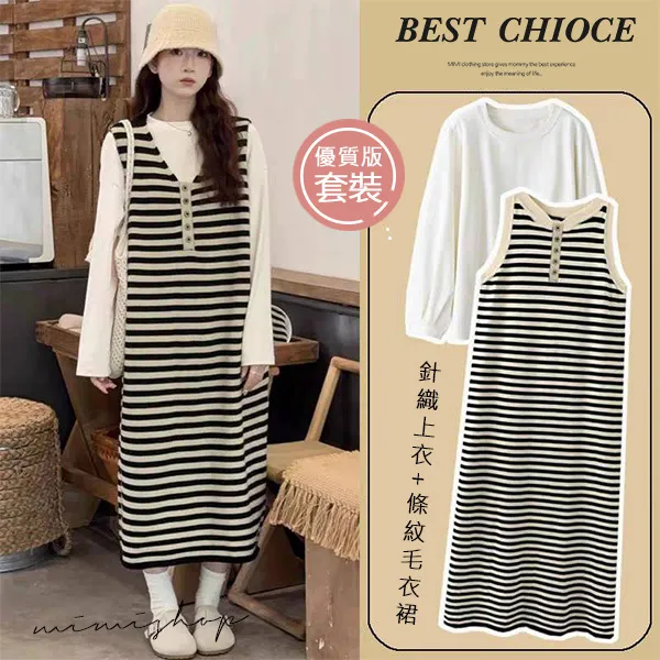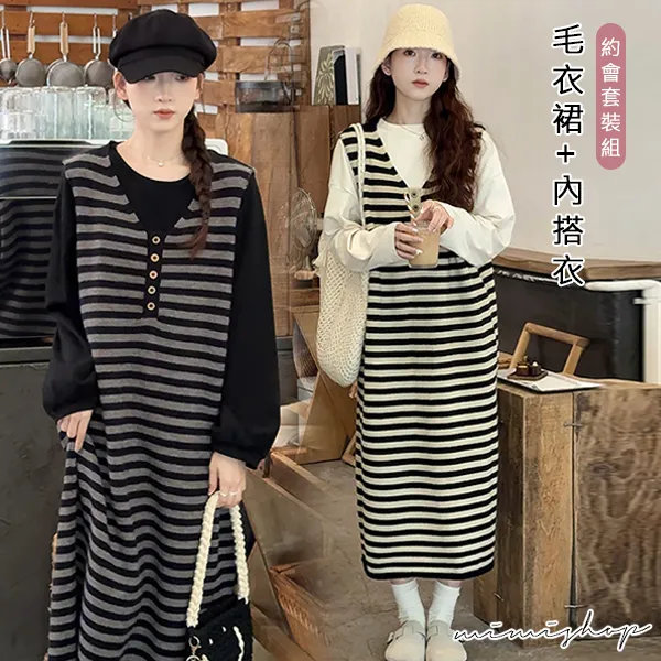 【P31659】溫暖午茶約 優質版 兩件式套裝 條紋毛衣裙+內搭衣 孕婦套裝