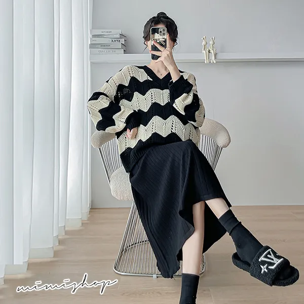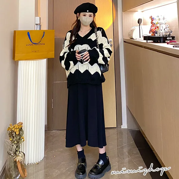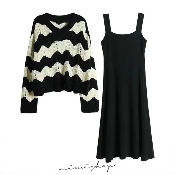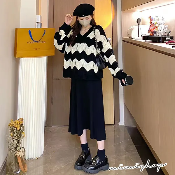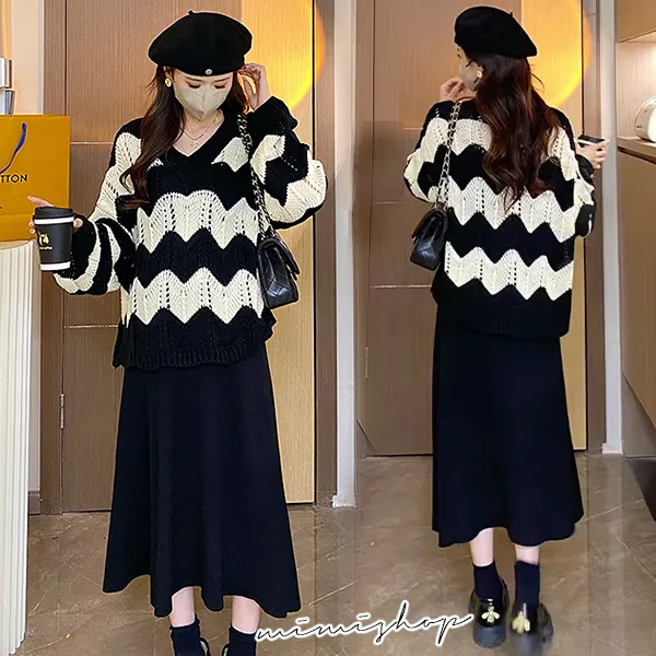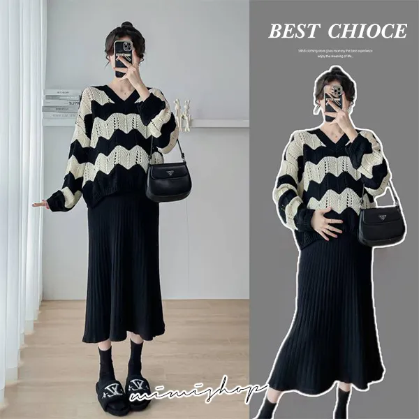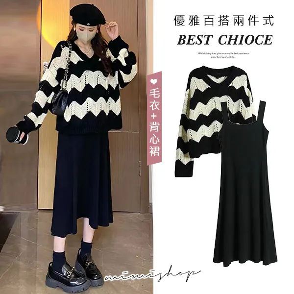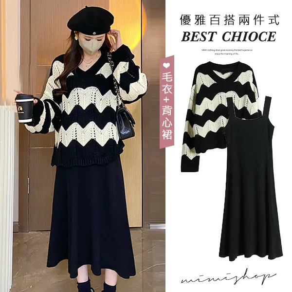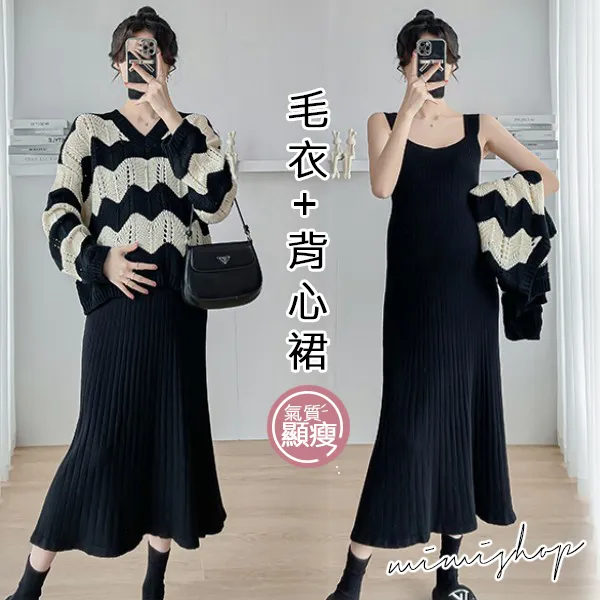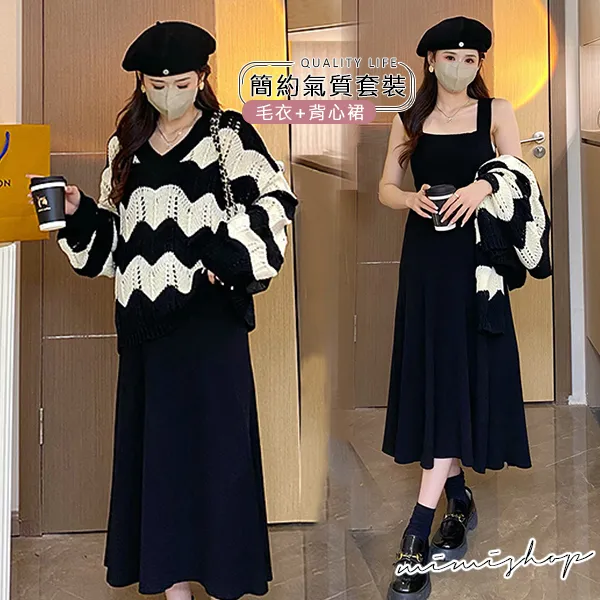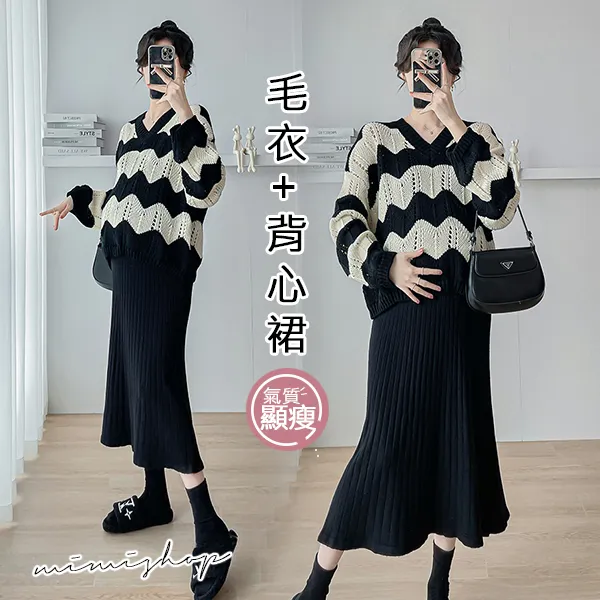 【P31680】優雅隨行 兩件式 鏤空針織毛衣+背心裙 孕婦洋裝 套裝