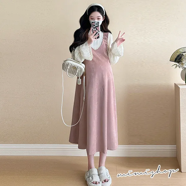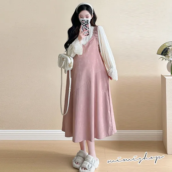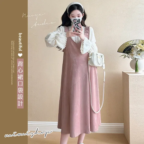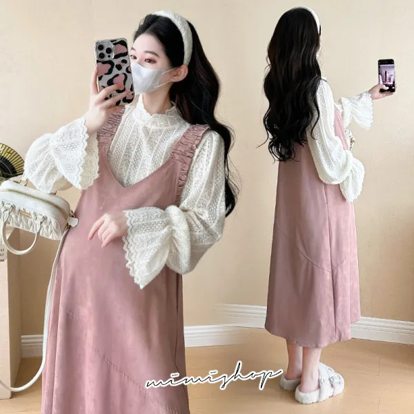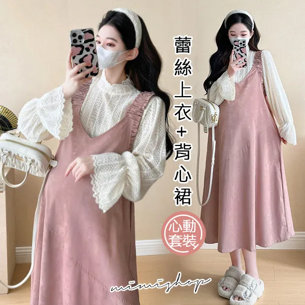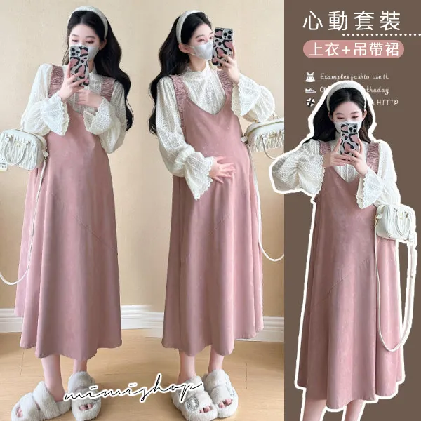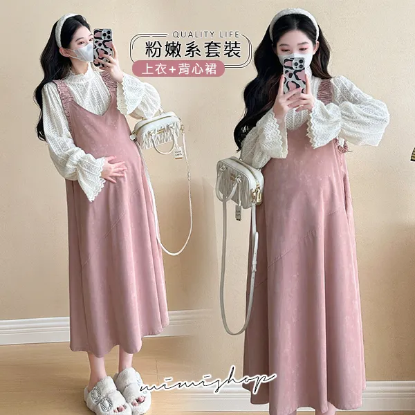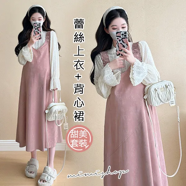 【P31682】約好幸福 兩件式 磨毛蕾絲上衣+背帶裙 孕婦洋裝 套裝