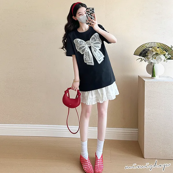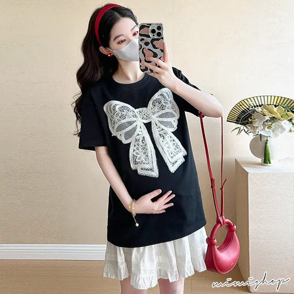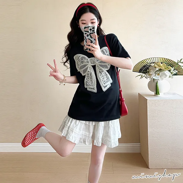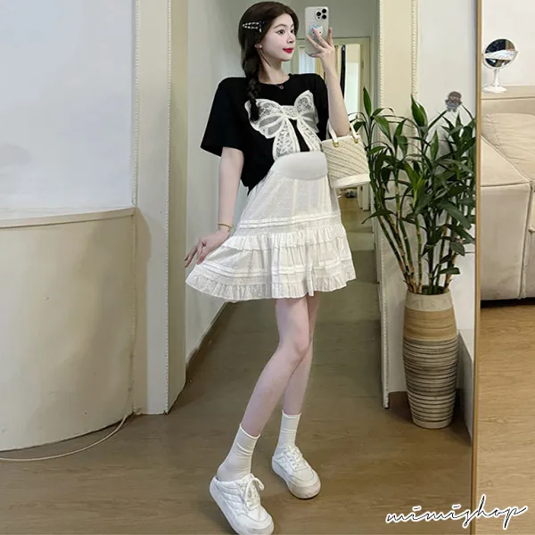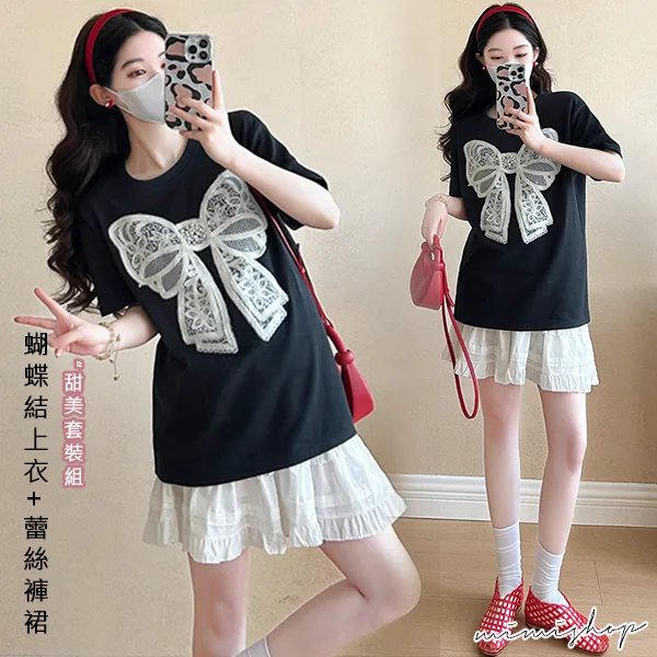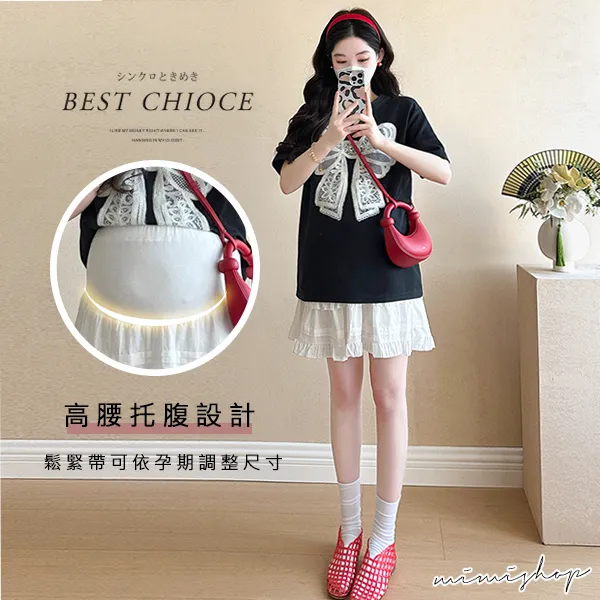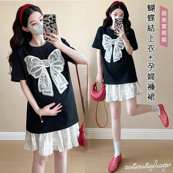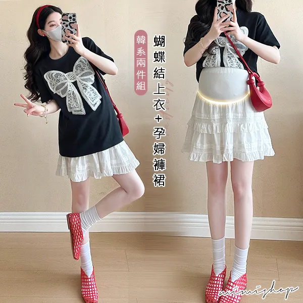 【P31685】韓范美搭 兩件式 蝴蝶結上衣+孕婦褲裙 孕婦套裝