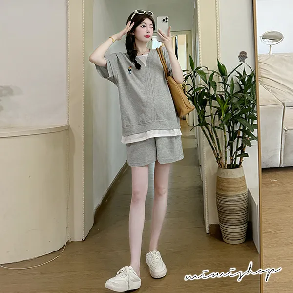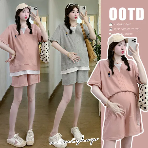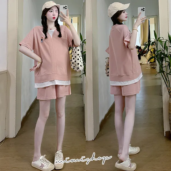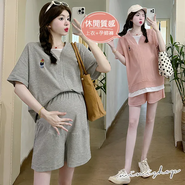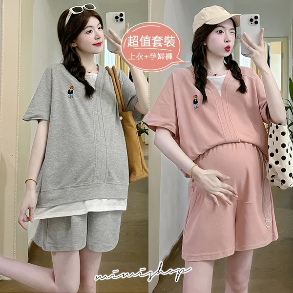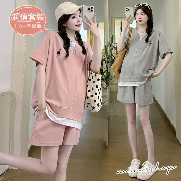 【P31686】休閒質感 兩件式 寬版刺繡上衣+孕婦短褲 孕婦套裝