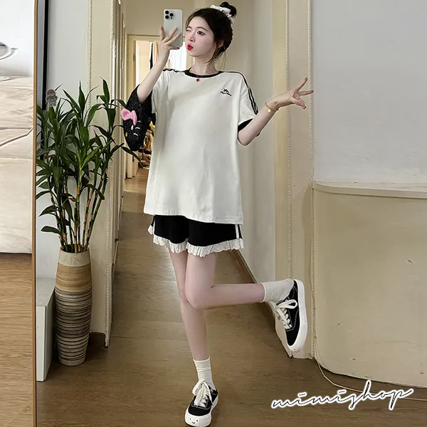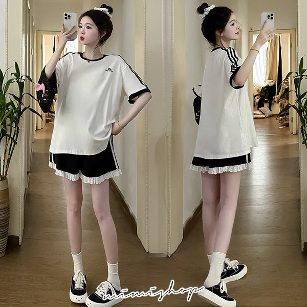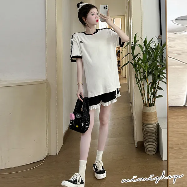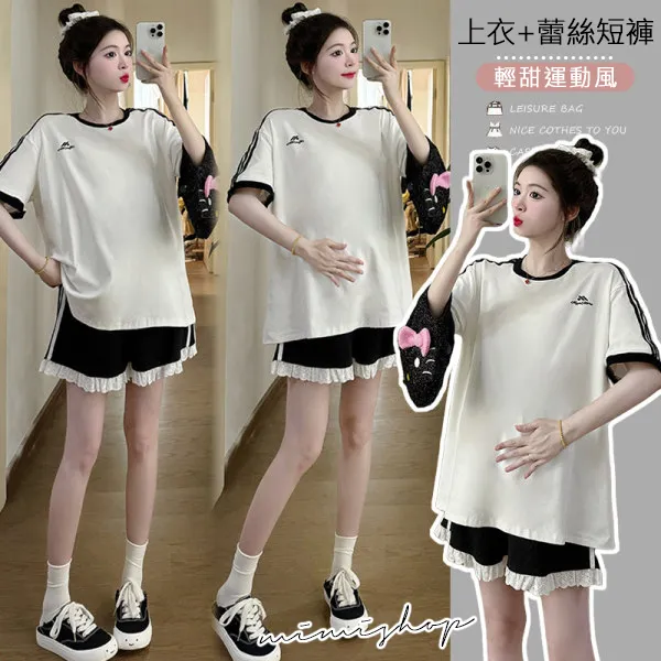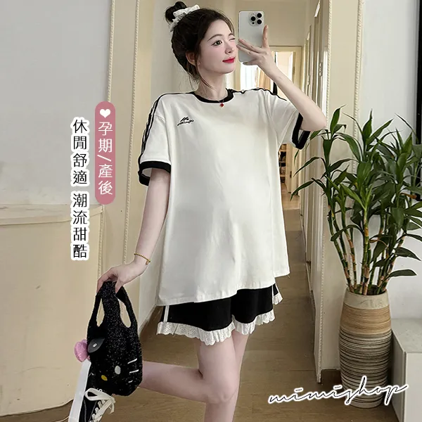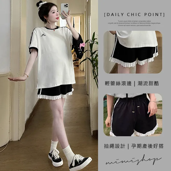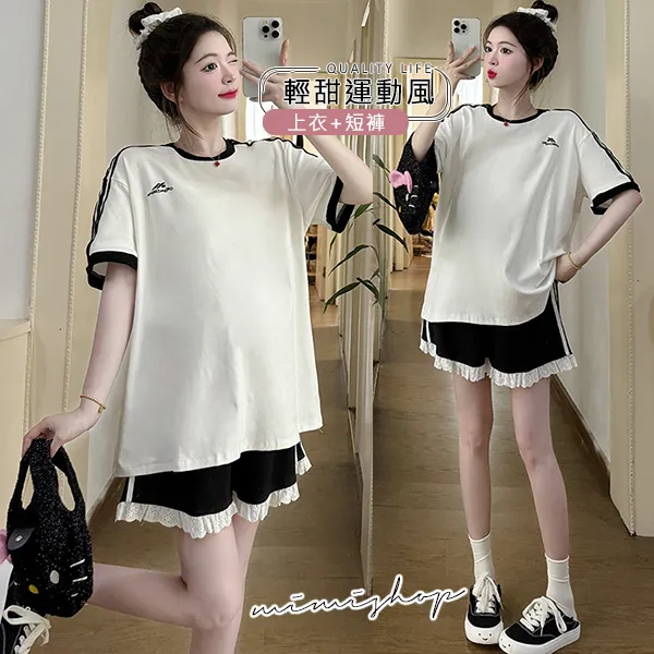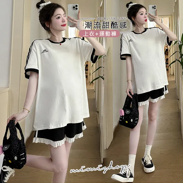 【P31687】輕甜運動風 兩件式 條槓寬上衣+孕婦短褲 孕婦套裝