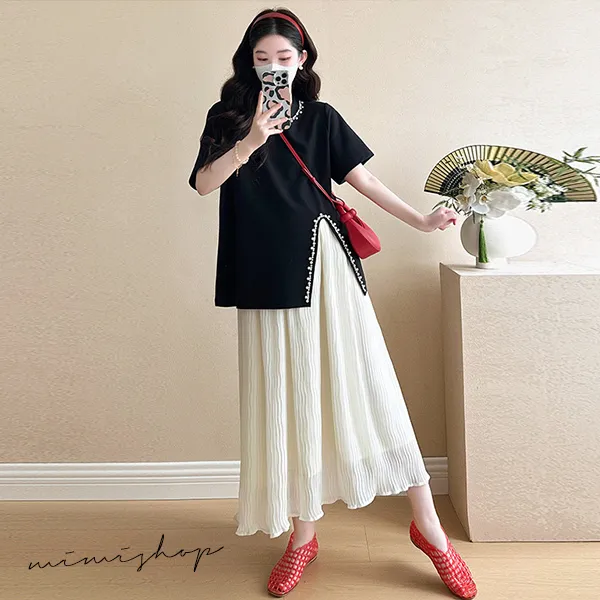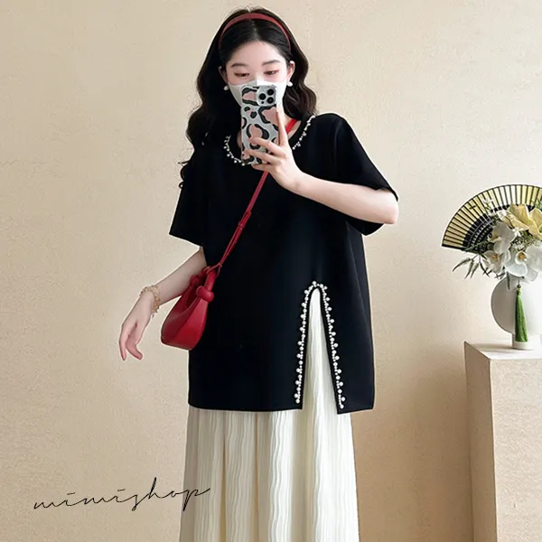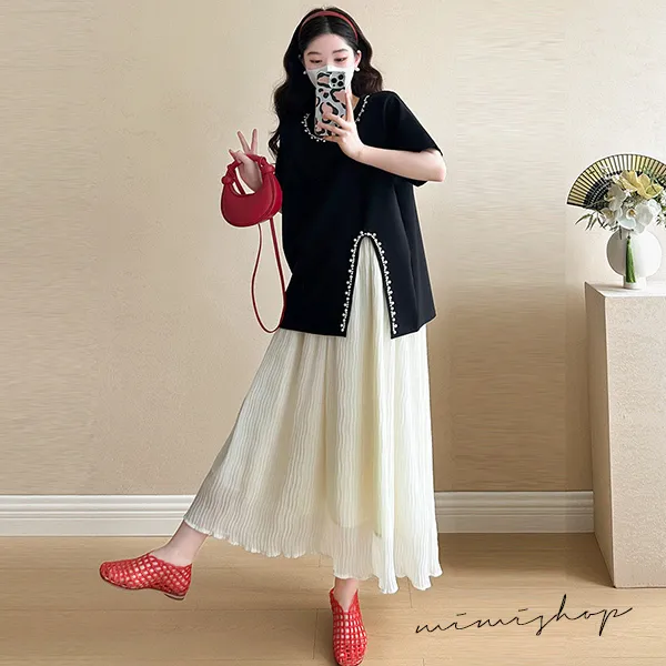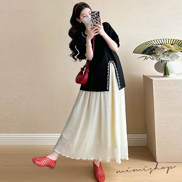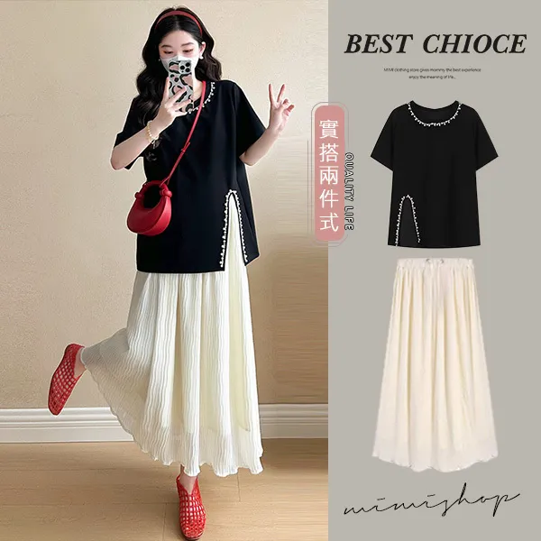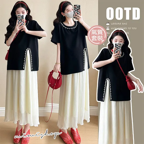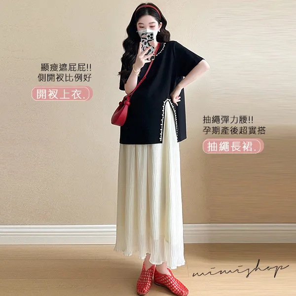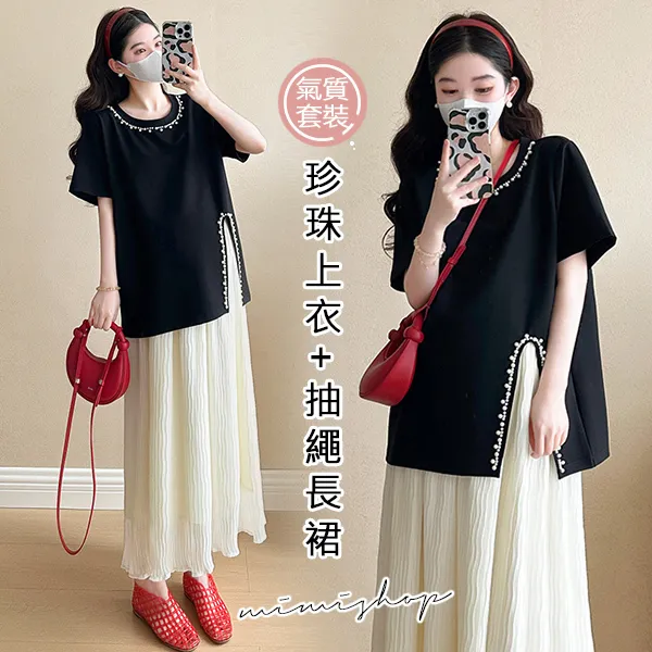 【P31703】實搭推薦 兩件式 寬版珍珠上衣+抽繩長裙 孕婦套裝