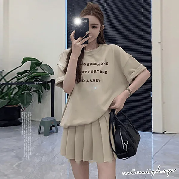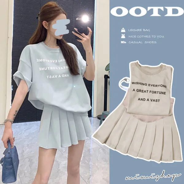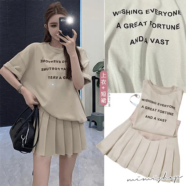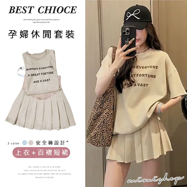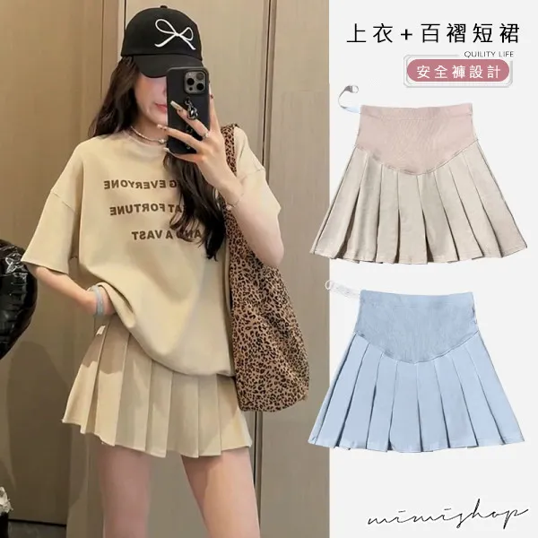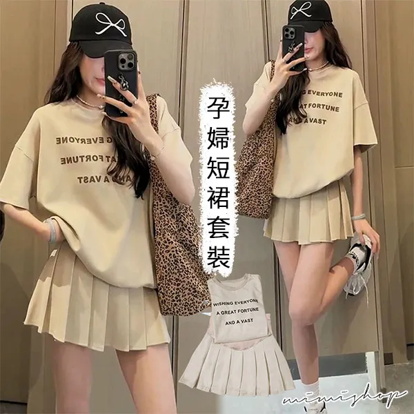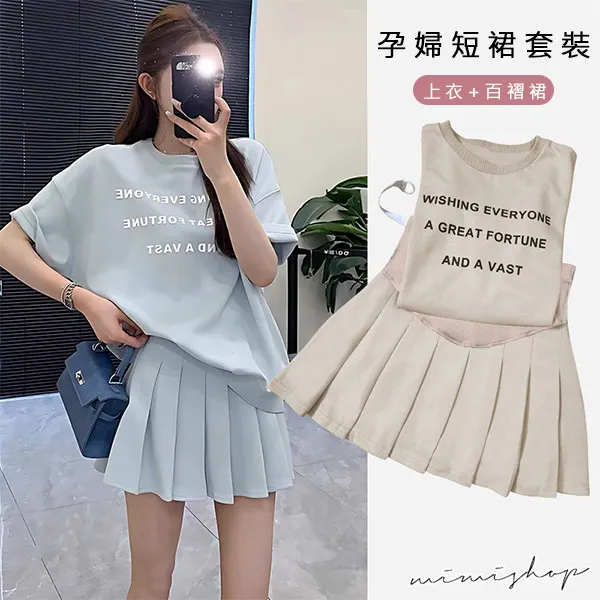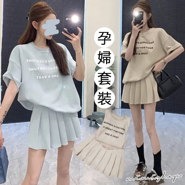 【P31707】 日系學院風 兩件式 字母上衣+百褶短裙 孕婦套裝