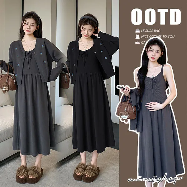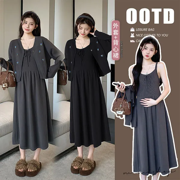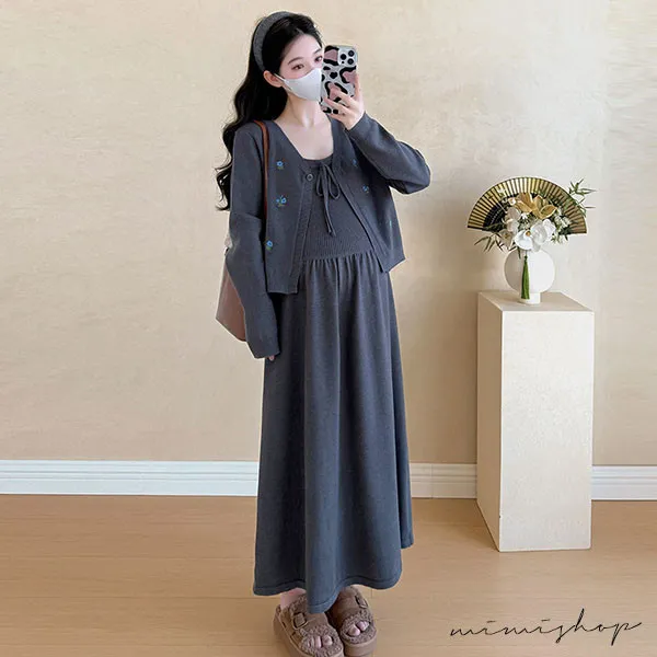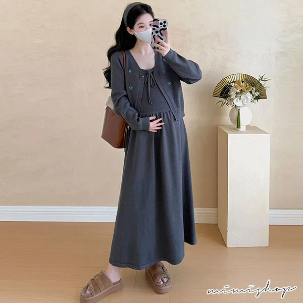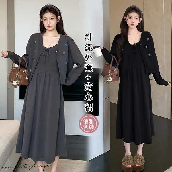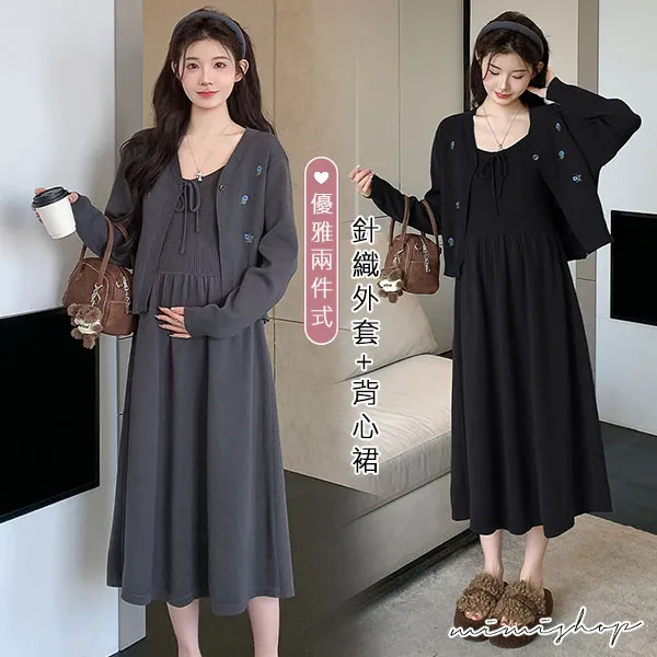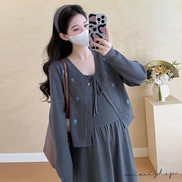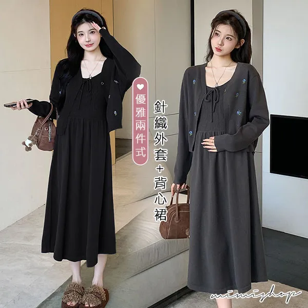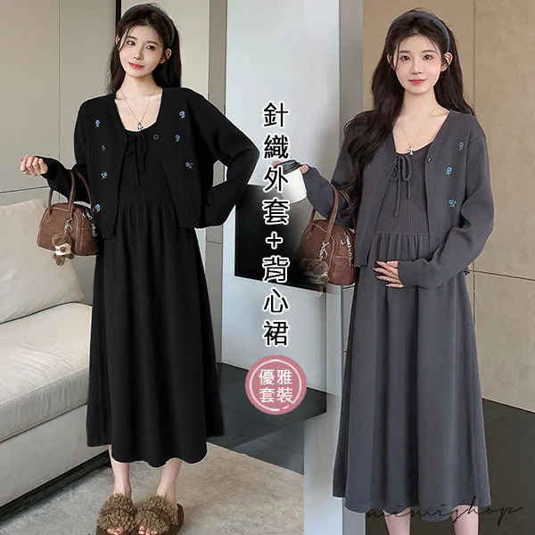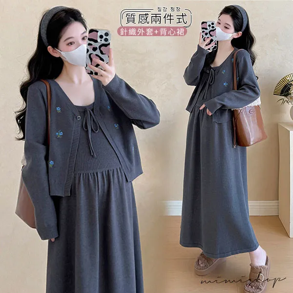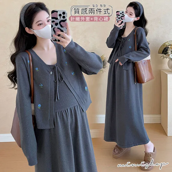 【P31730】溫暖優雅 質感兩件式 刺繡小花針織外套+背心裙 孕婦套裝
