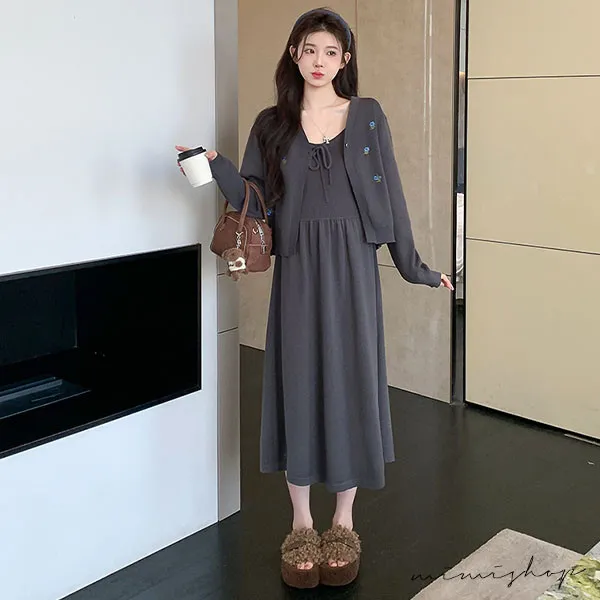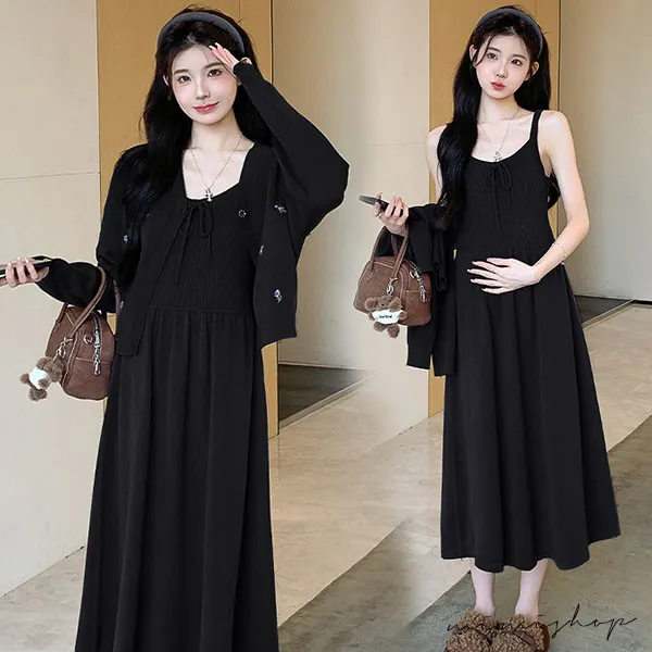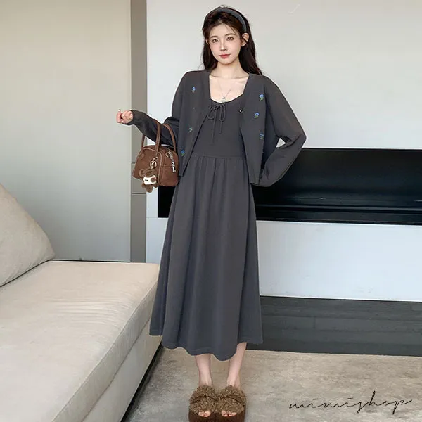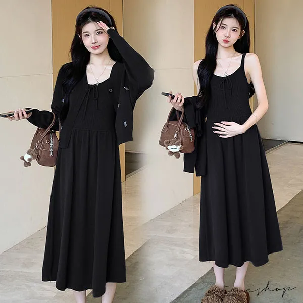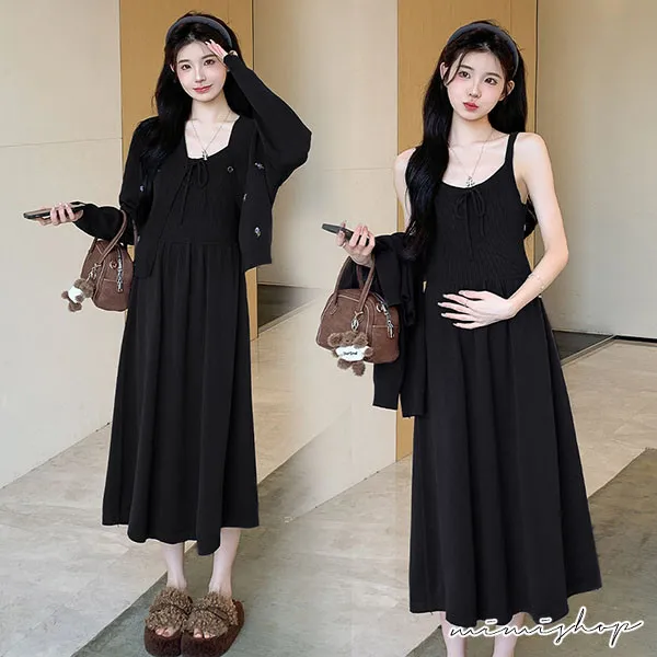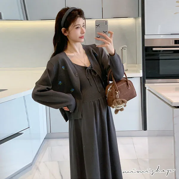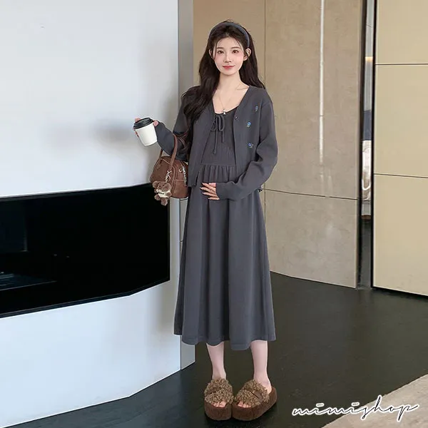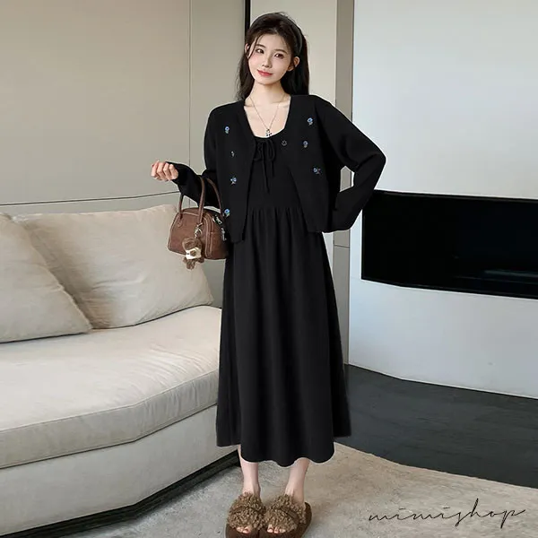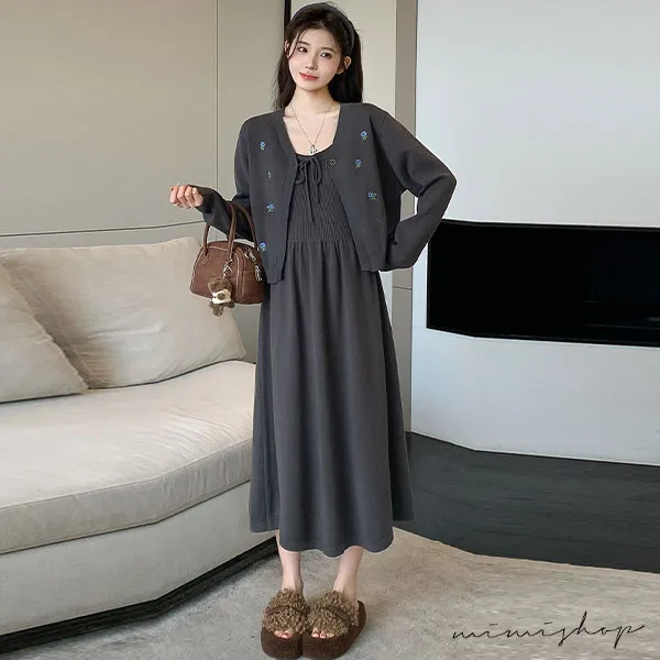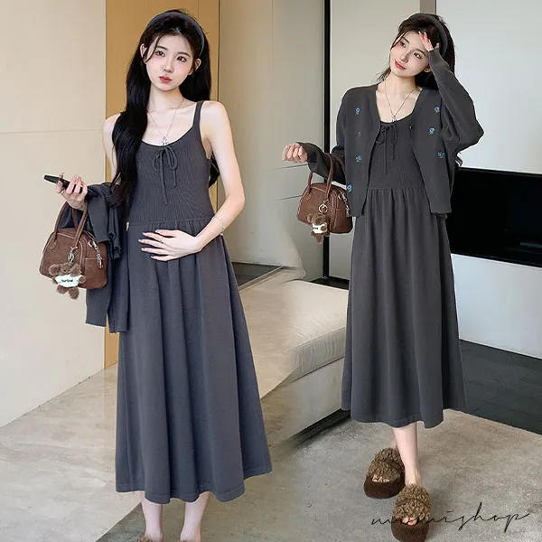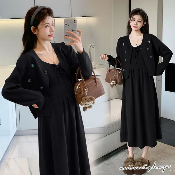 【P31730】溫暖優雅 質感兩件式 刺繡小花針織外套+背心裙 孕婦套裝
