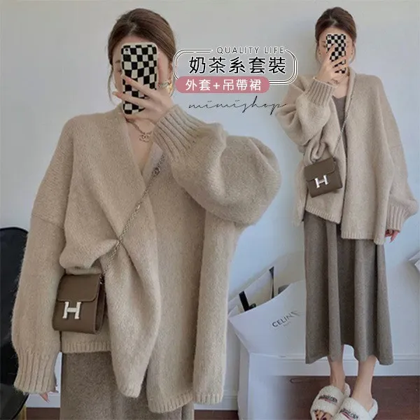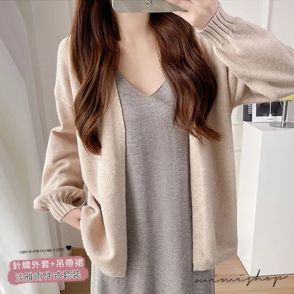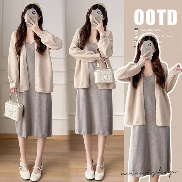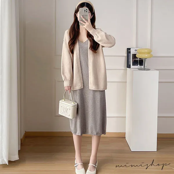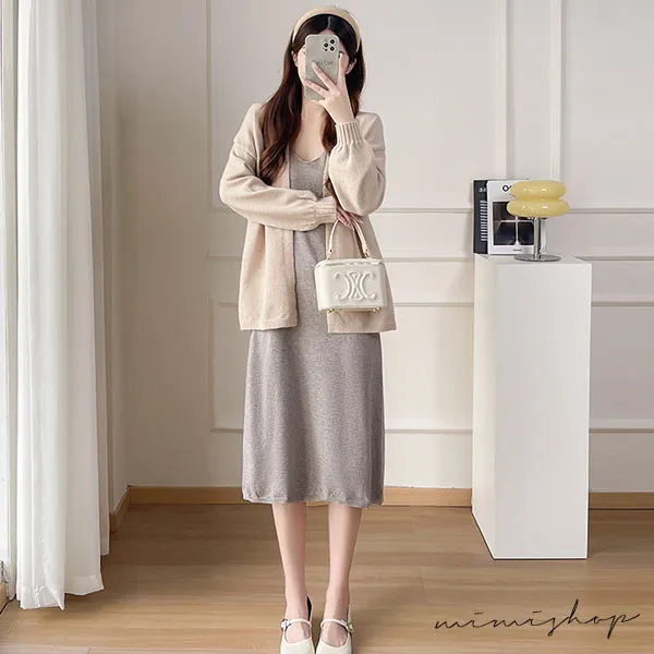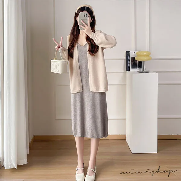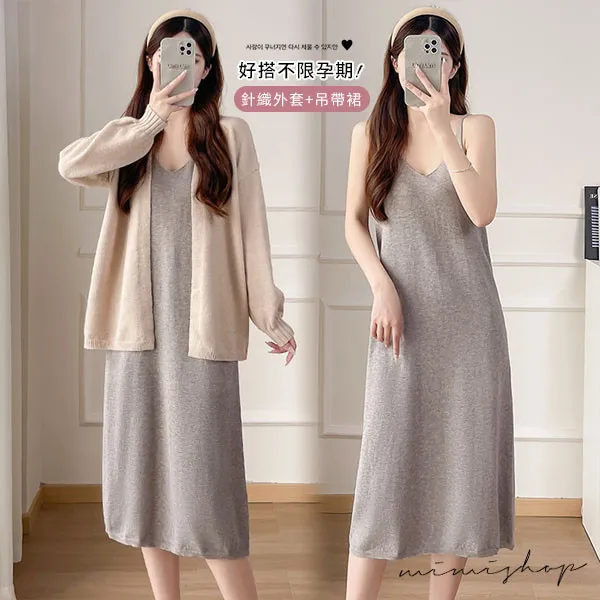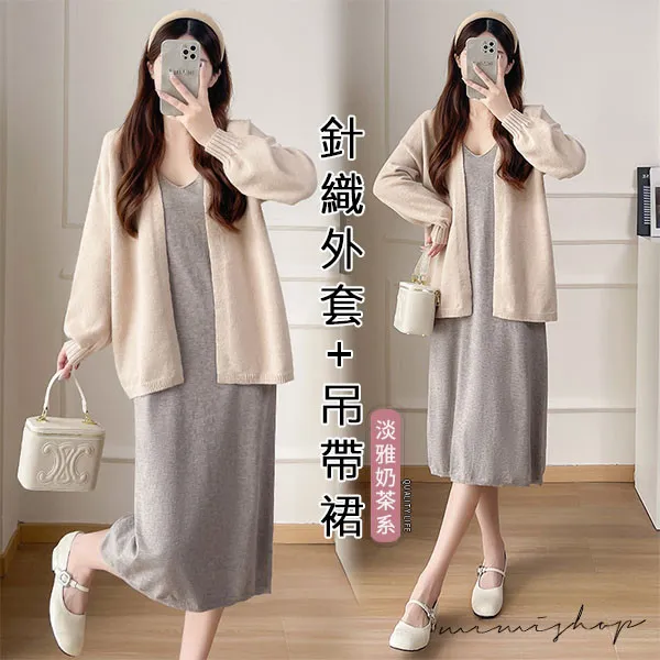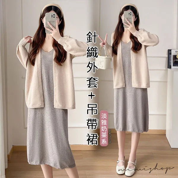 【P31734】淡雅奶茶系 兩件式 針織外套+吊帶裙 孕婦洋裝 套裝