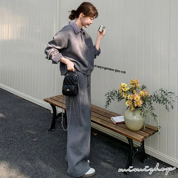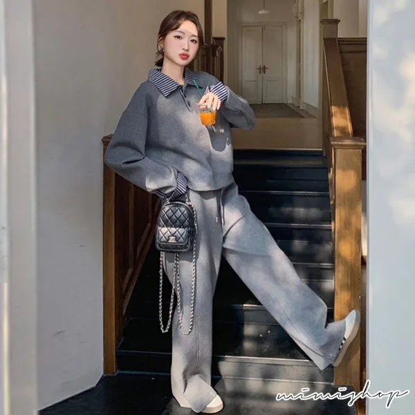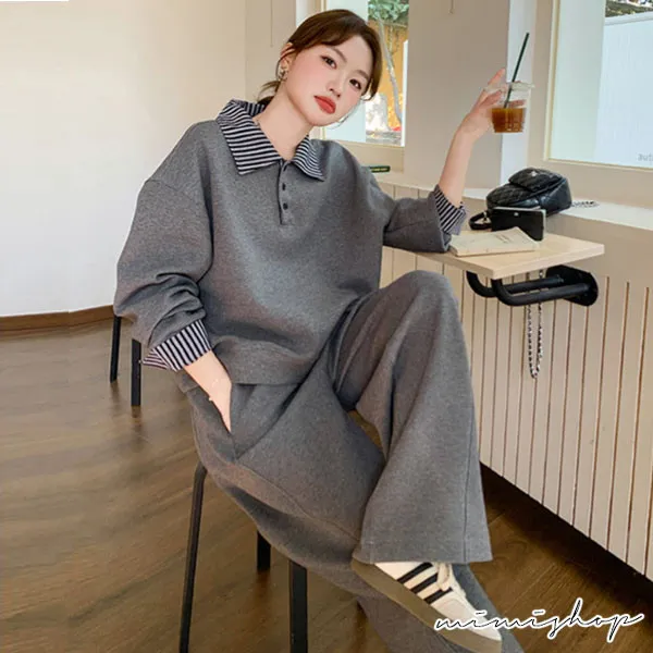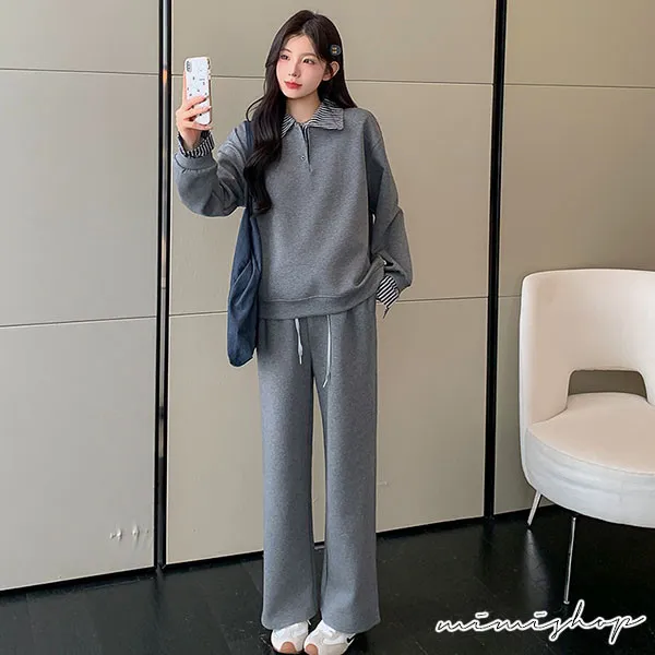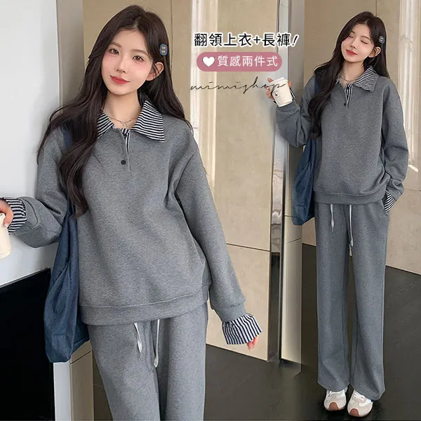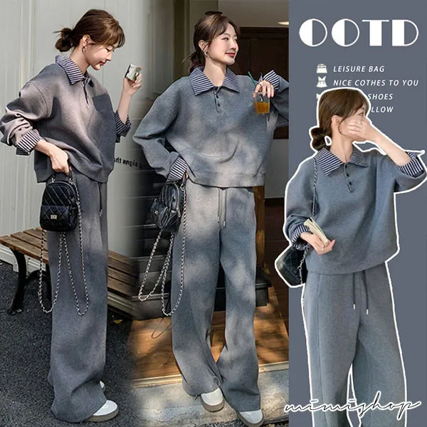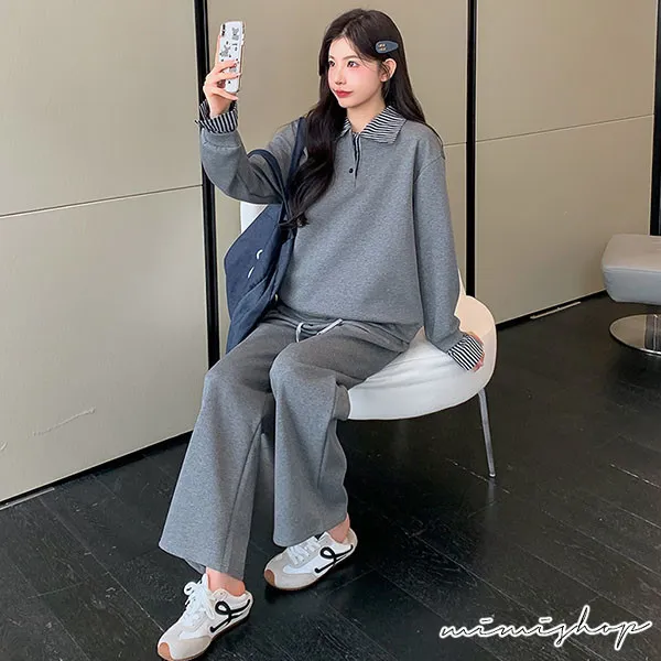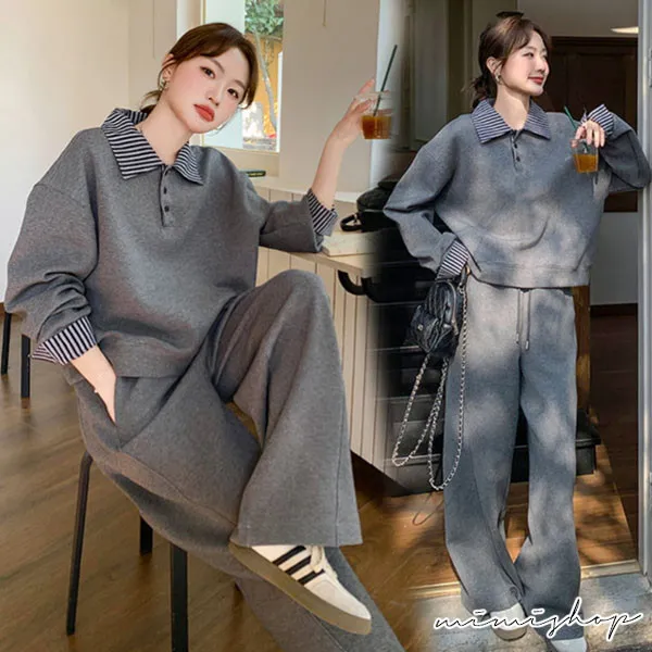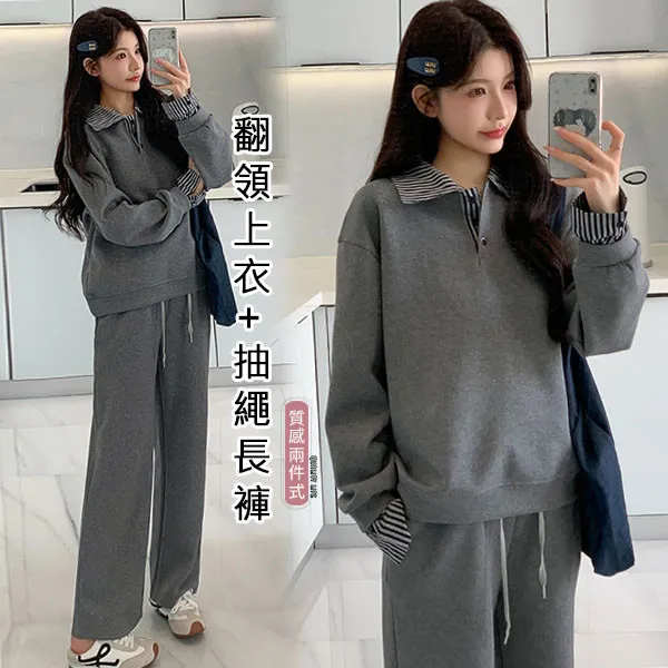【P31735】質感polo套裝 寬鬆兩件式 翻領上衣+長褲 孕婦套裝