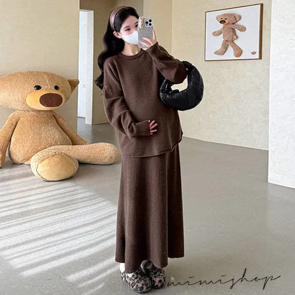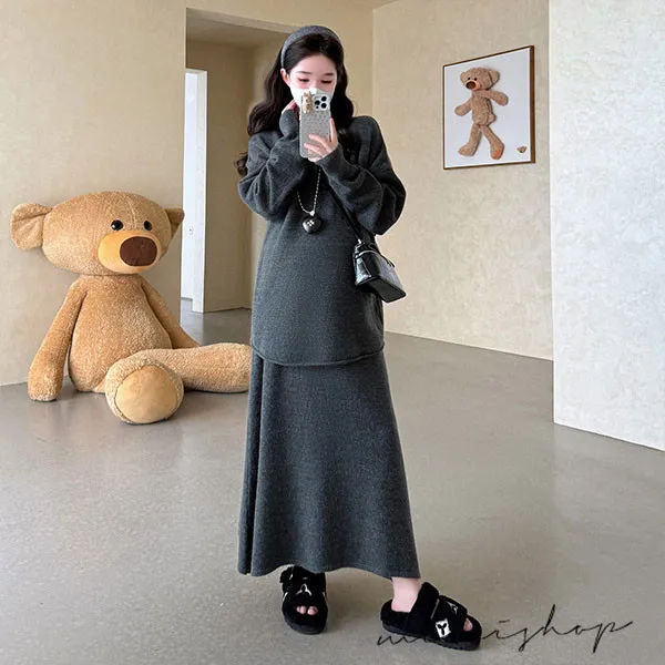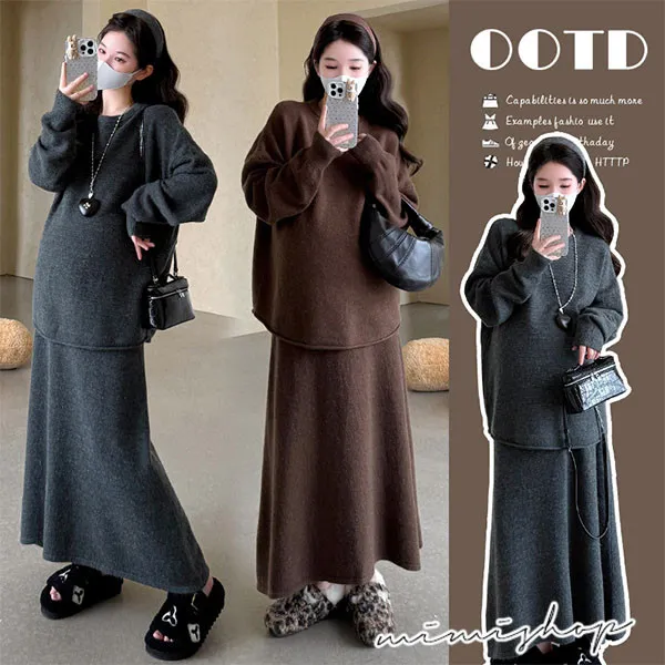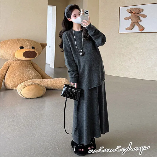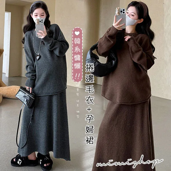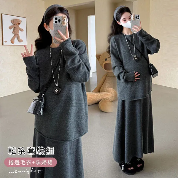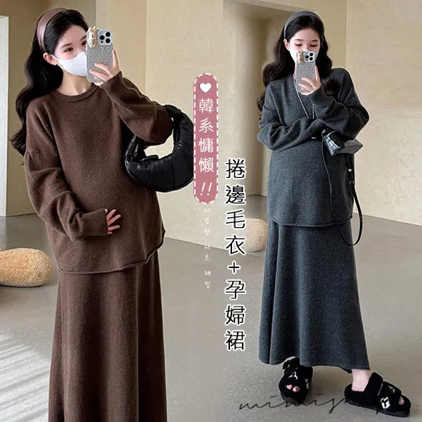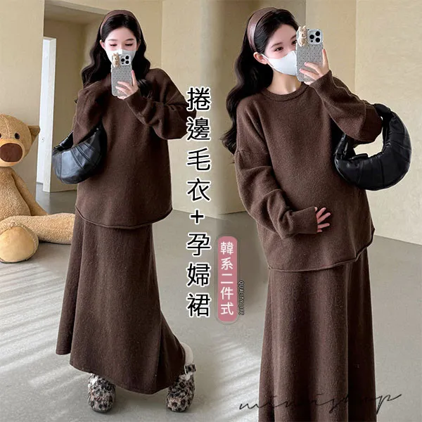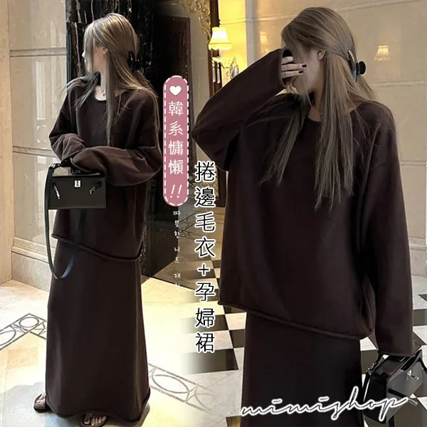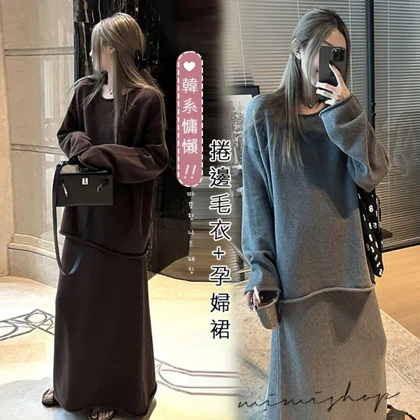 【P31741】韓系慵懶 超值二件式 寬鬆捲邊毛衣+孕婦裙 針織套裝