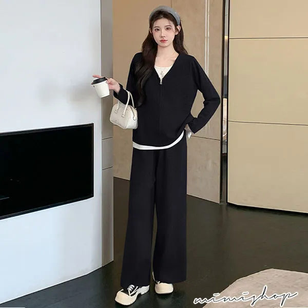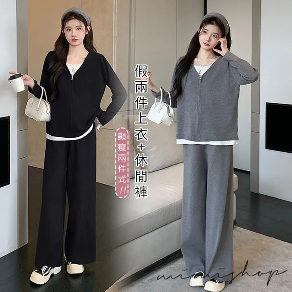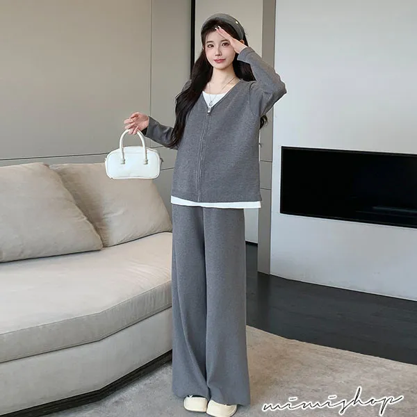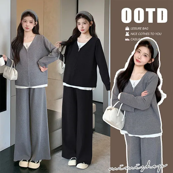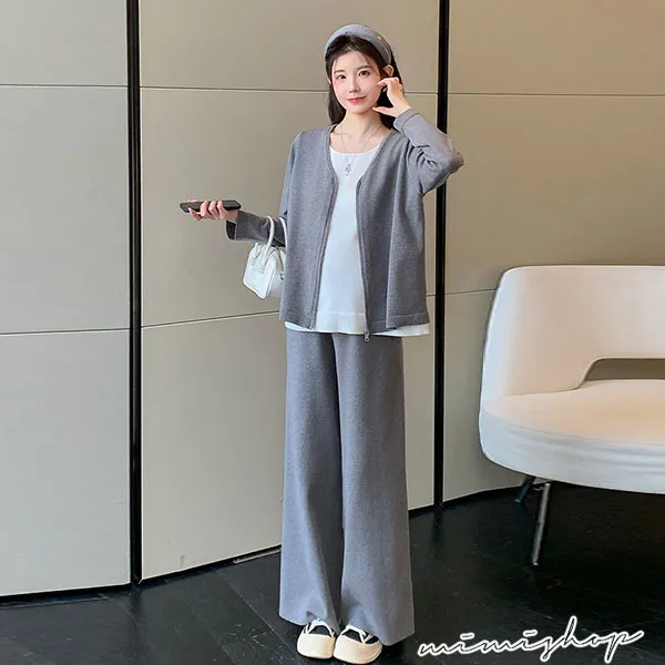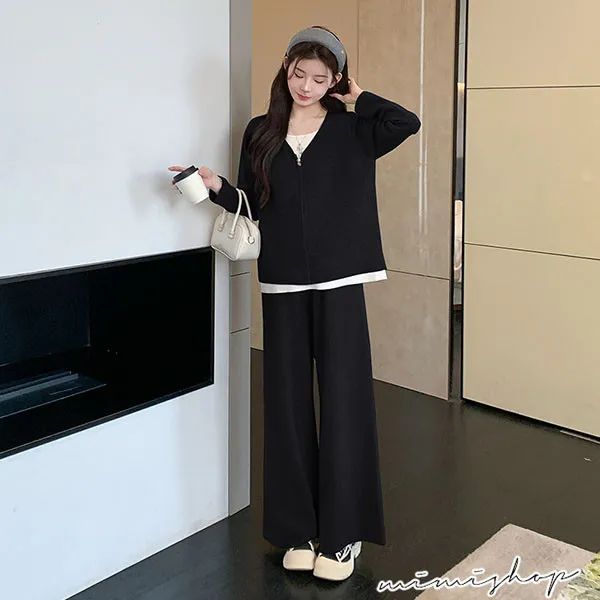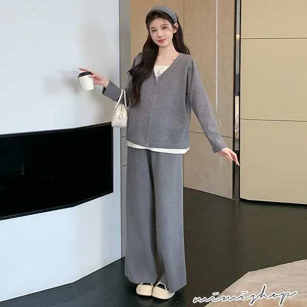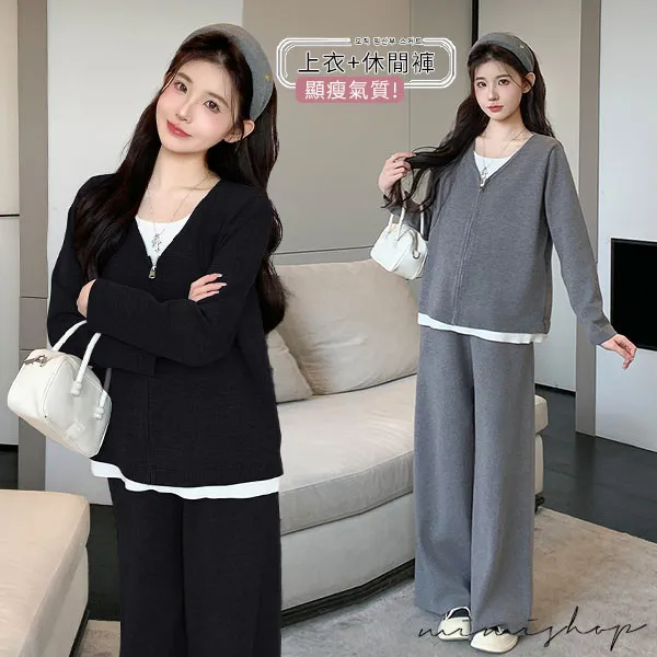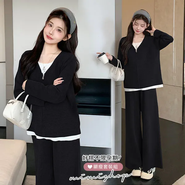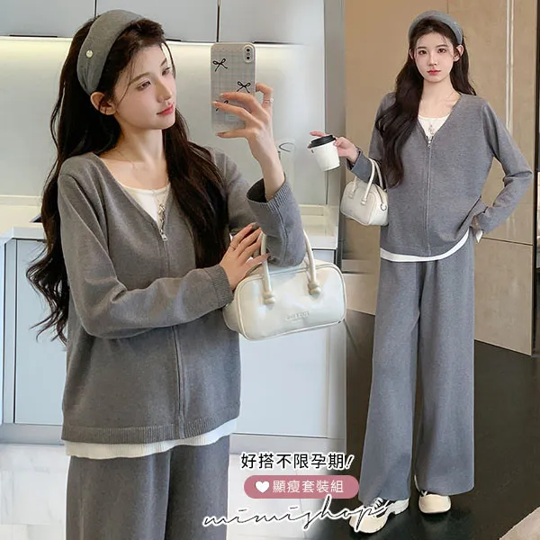 【P31743】顯瘦氣質 超值套裝 保暖假兩件拉鍊針織衣+休閒褲 孕婦套裝