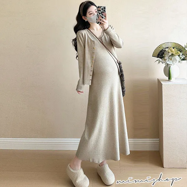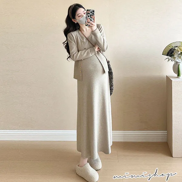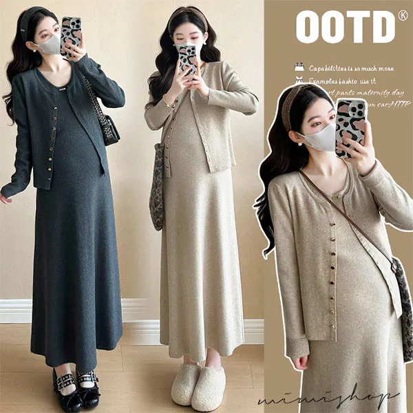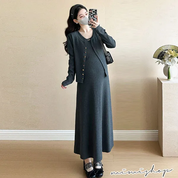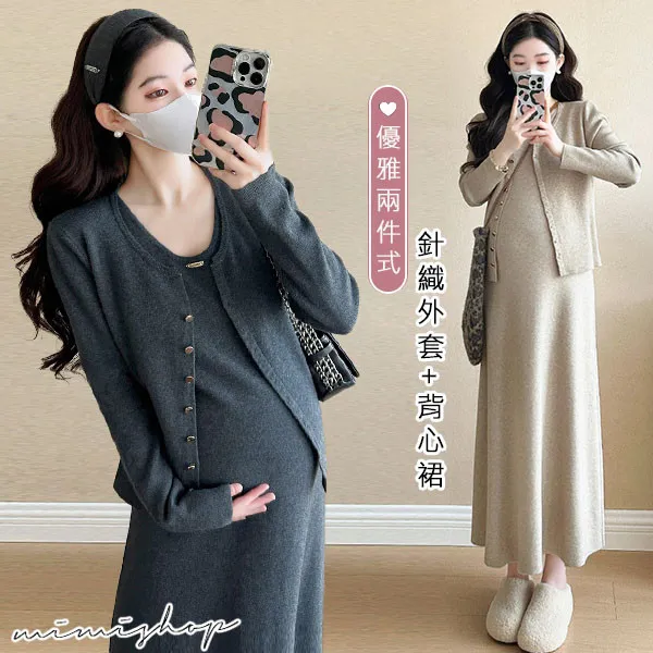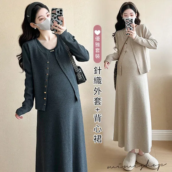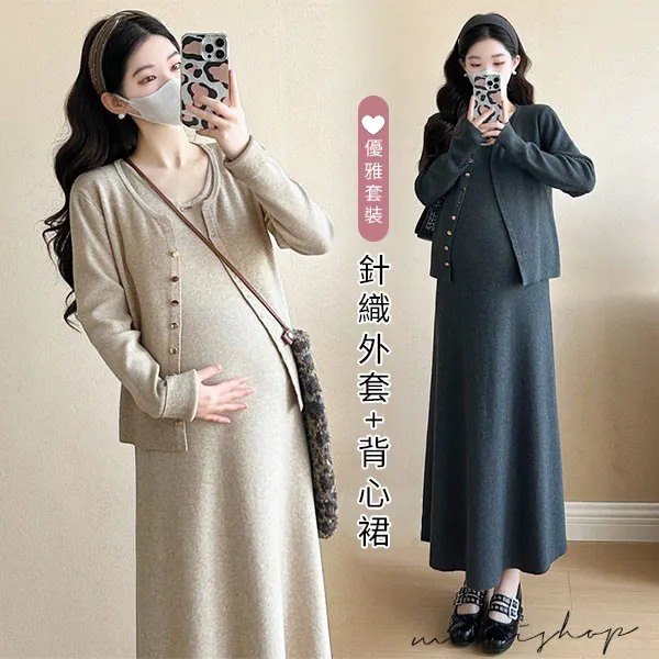 【P31746】溫暖優雅 兩件式 針織外套+背心裙 孕婦洋裝 套裝