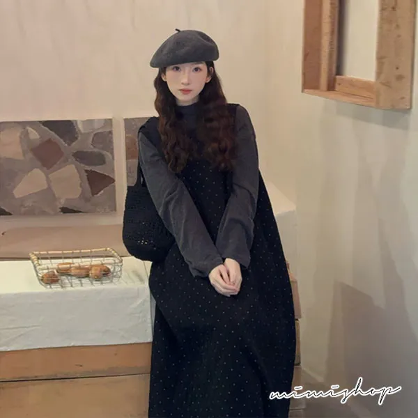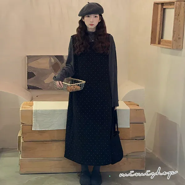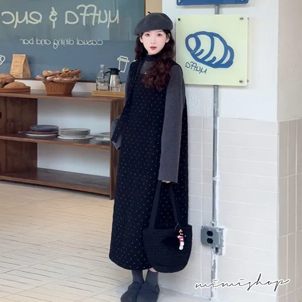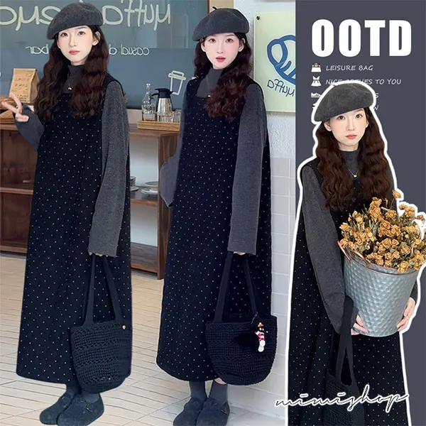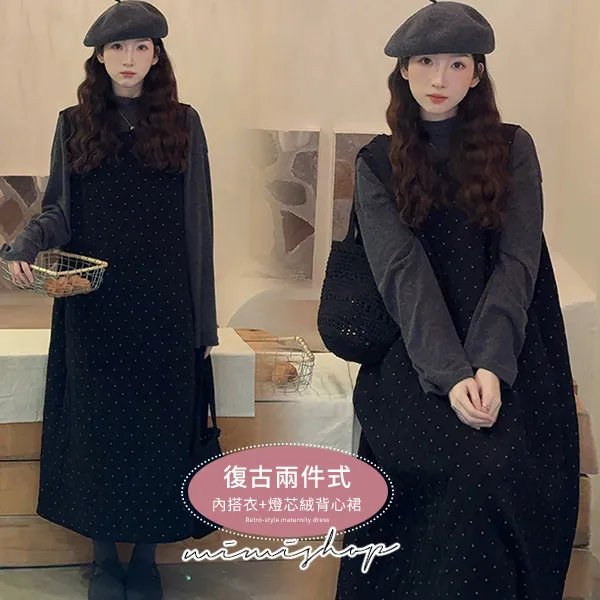 【P31754】復古美學 兩件式 針織內搭衣+燈芯絨背心裙 孕婦洋裝 套裝