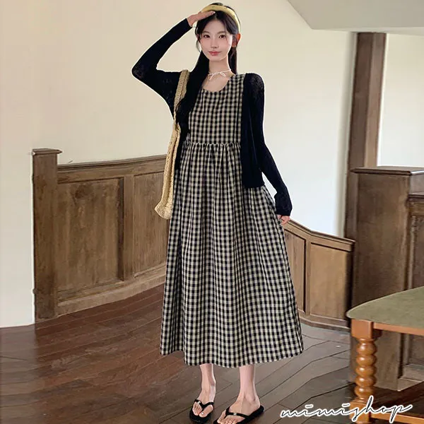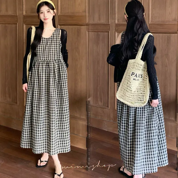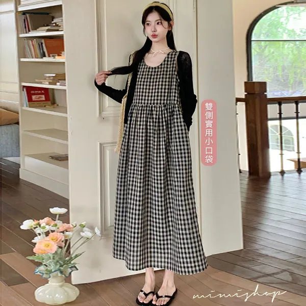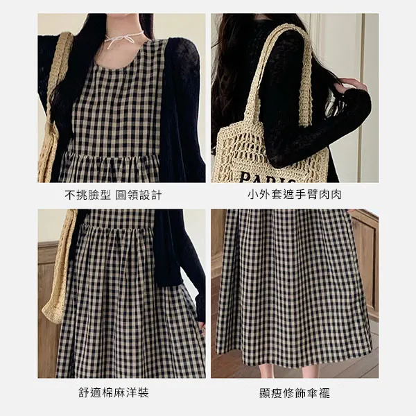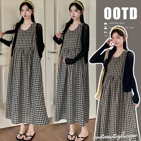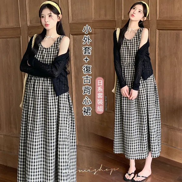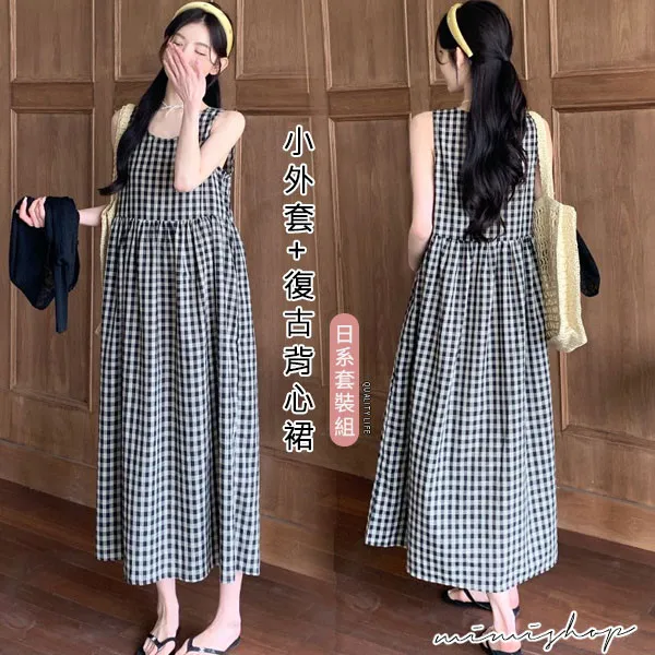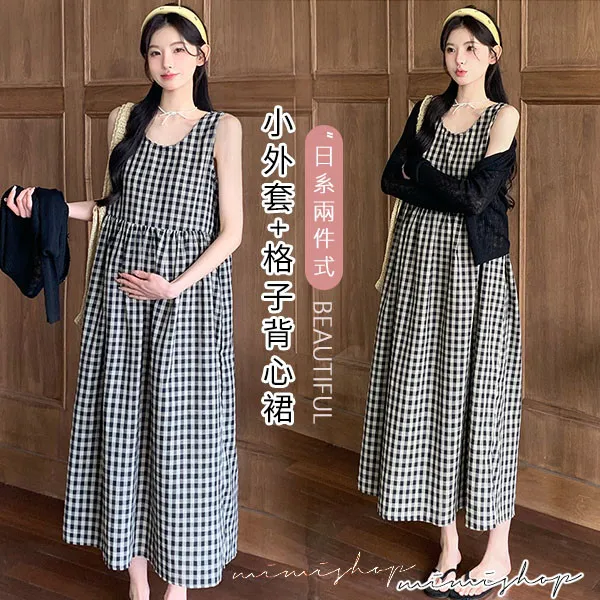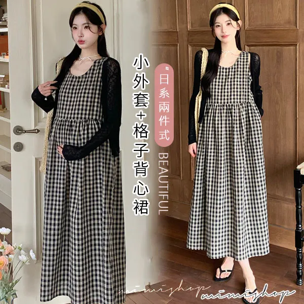 【P31756】自然日系 兩件式 小外套+復古格子背心裙 孕婦套裝