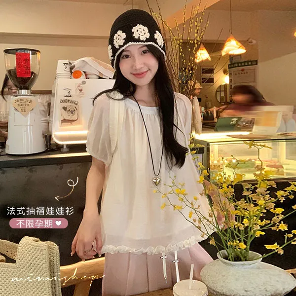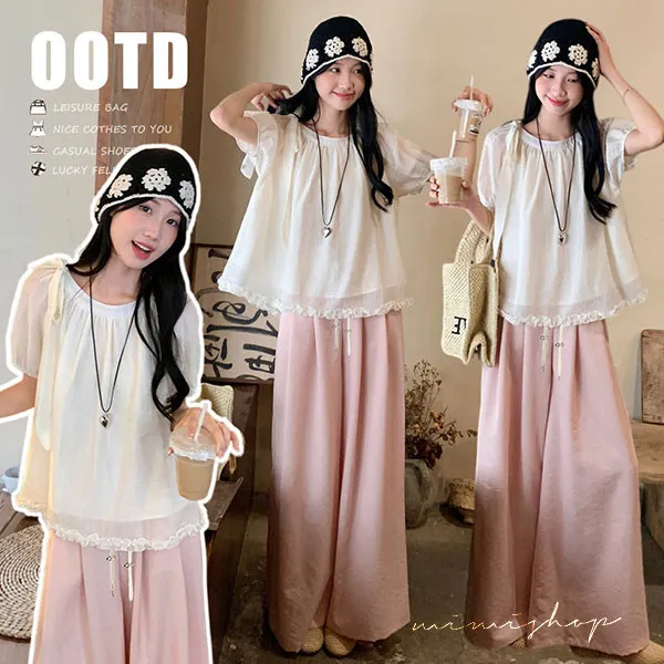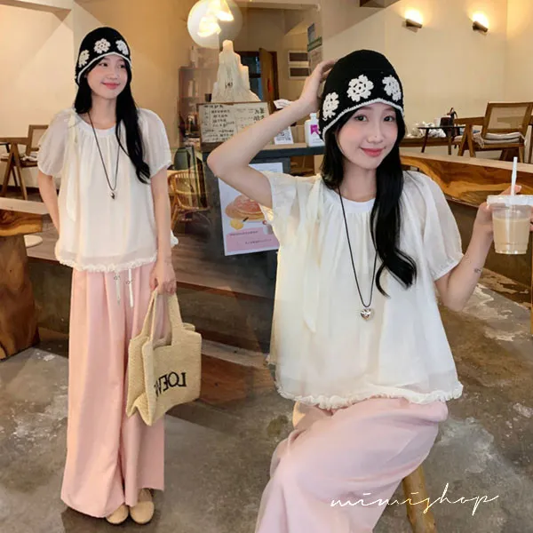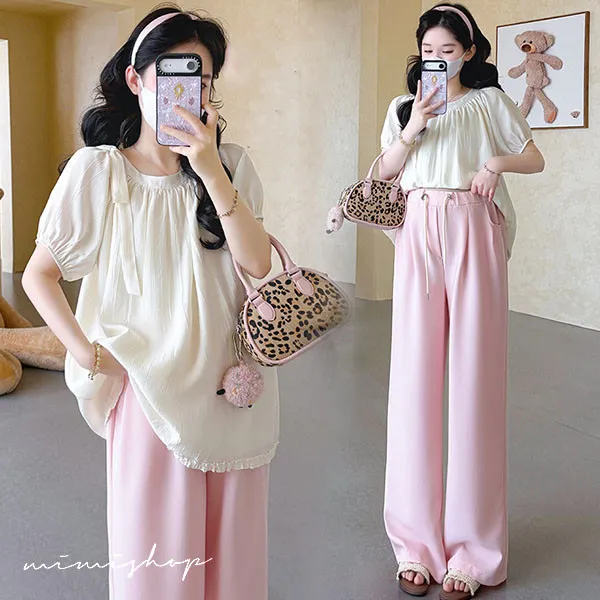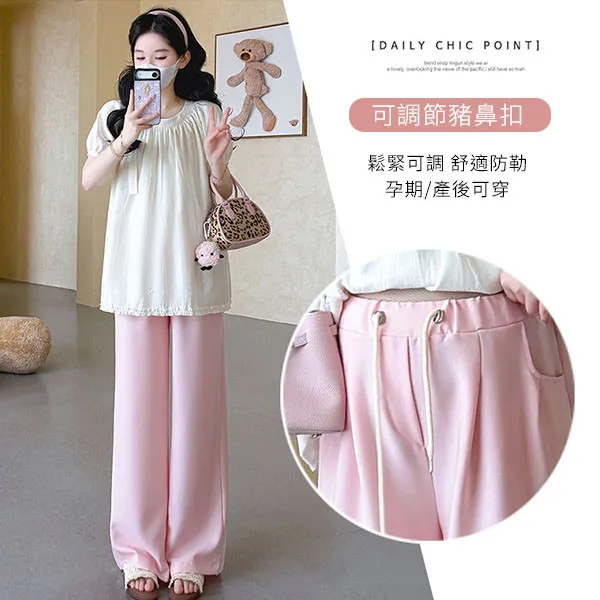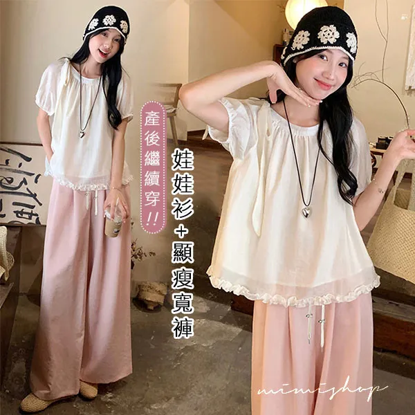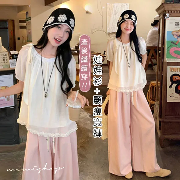 【P31757】淺淺溫柔 兩件式 法式抽褶娃娃衫+垂墜顯瘦寬褲 孕婦套裝