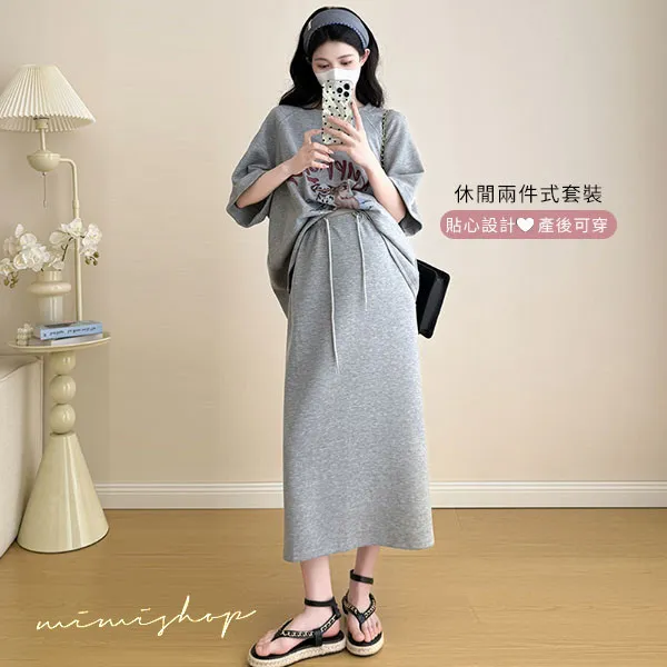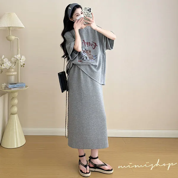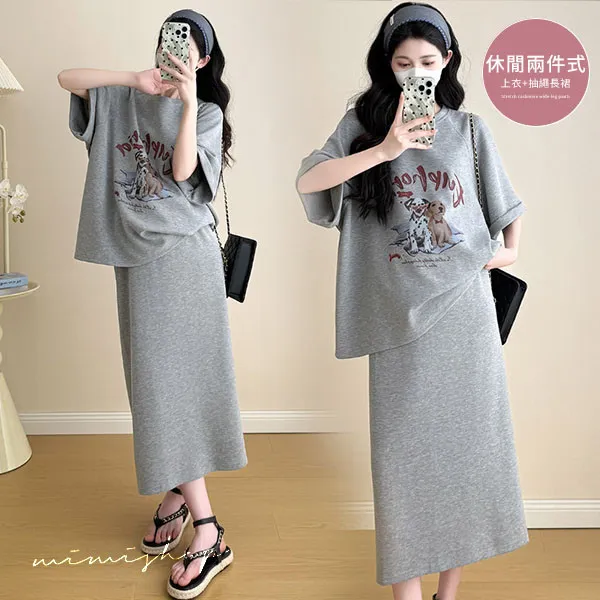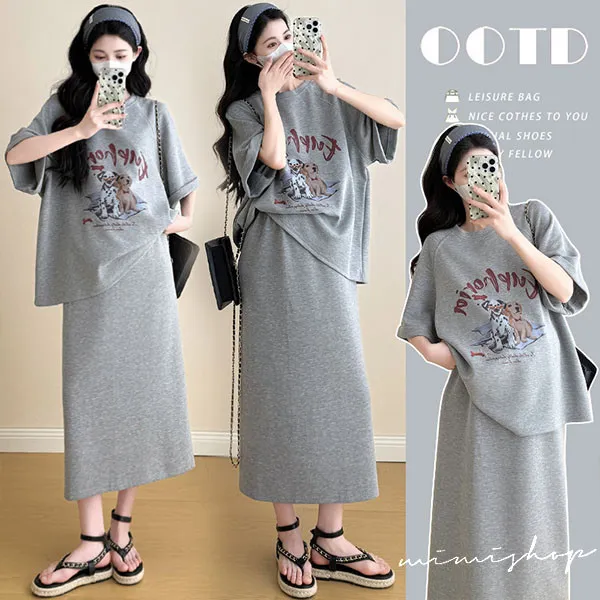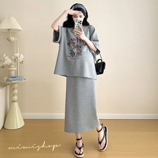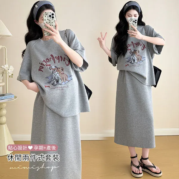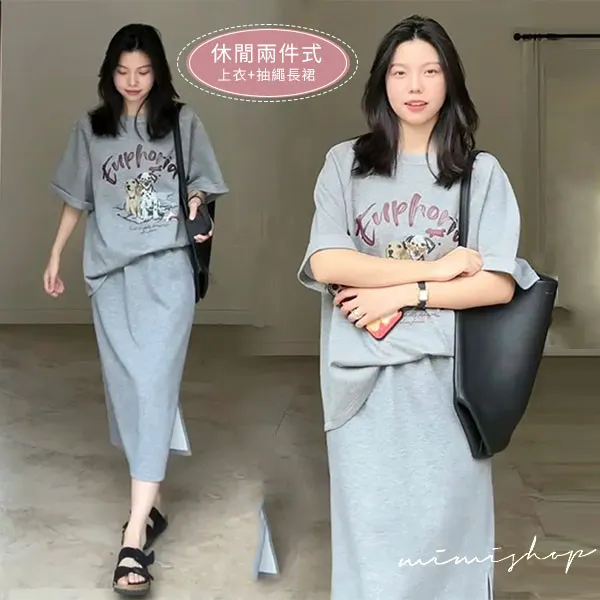 【P31759】美式日常 寬鬆狗狗印花休閒套裝 兩件式 上衣+長裙