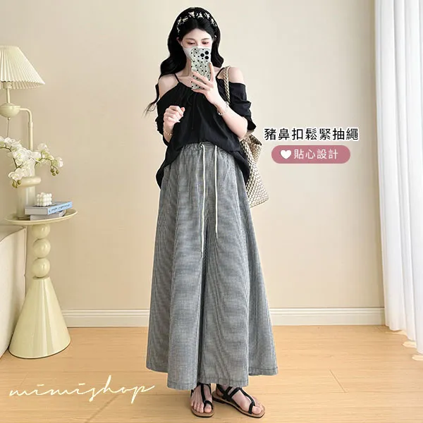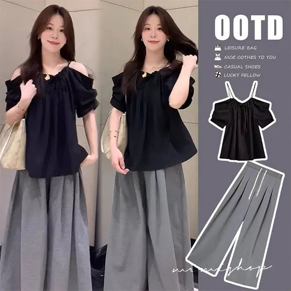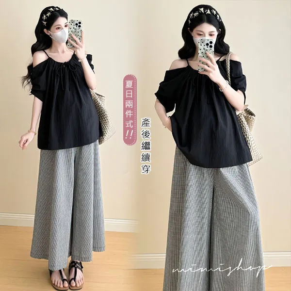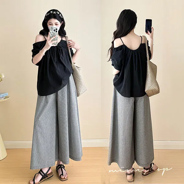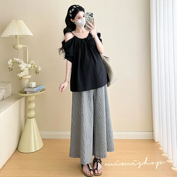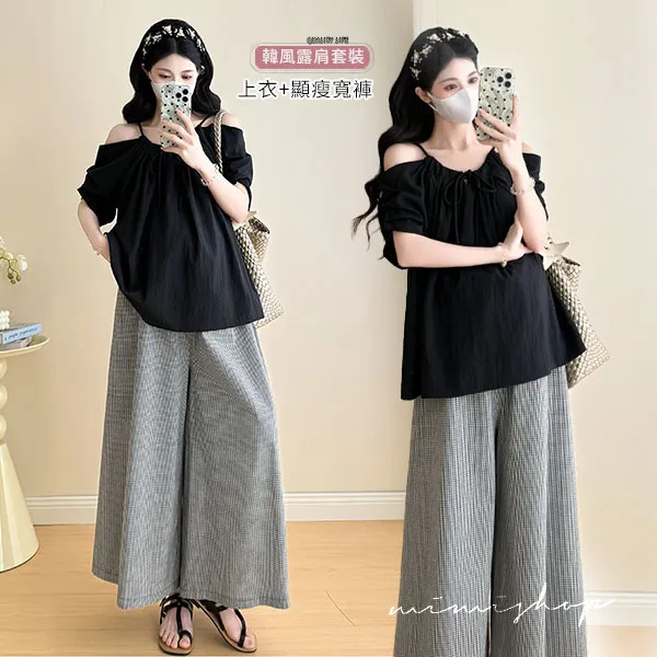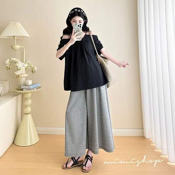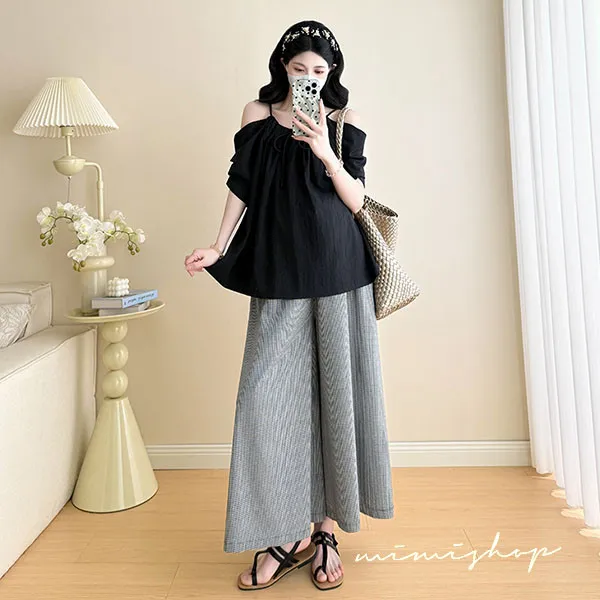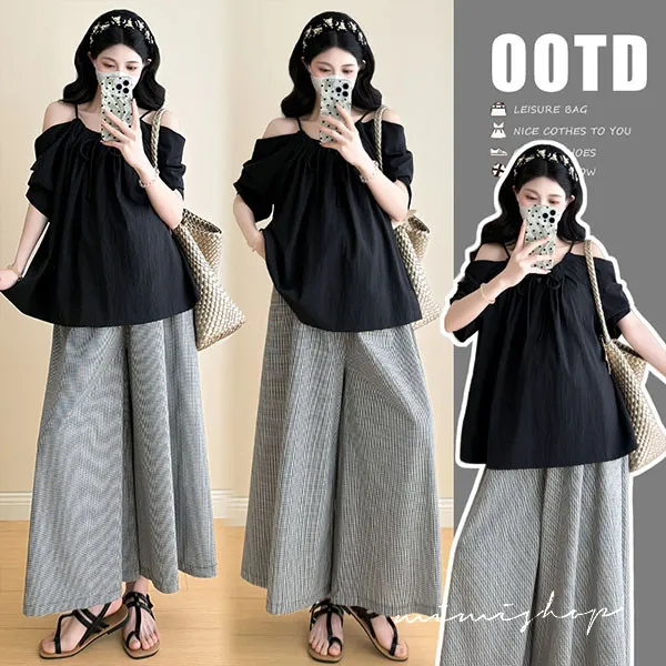 【P31760】夏日兩件套 韓系露肩黑衫+顯瘦寬褲 孕婦套裝 不限孕期
