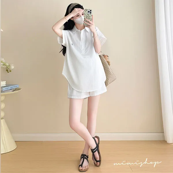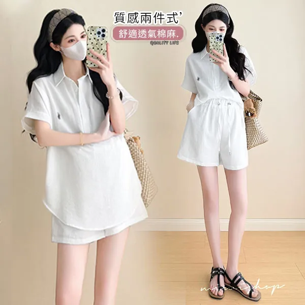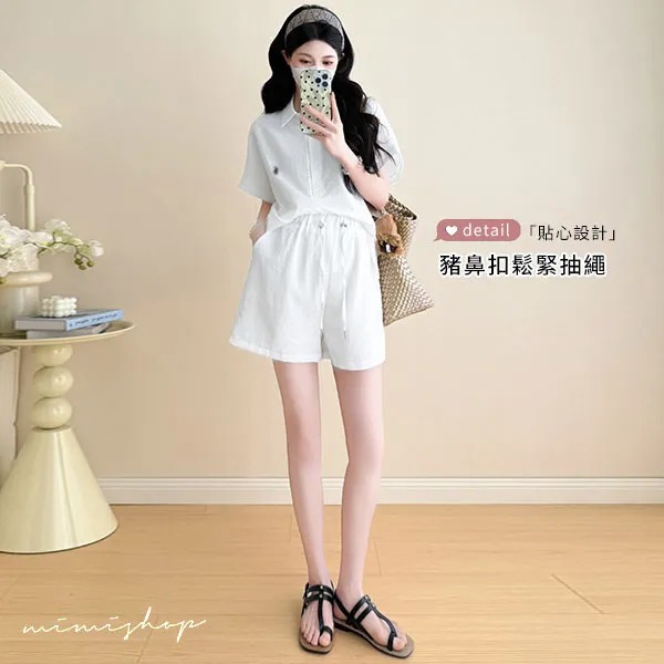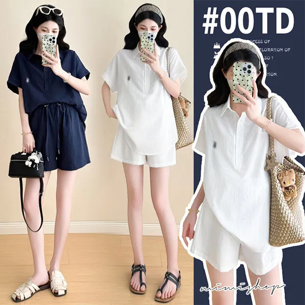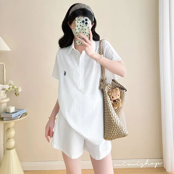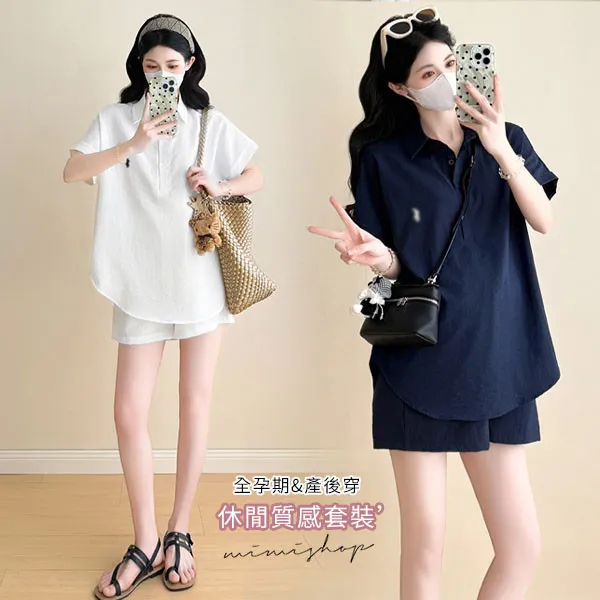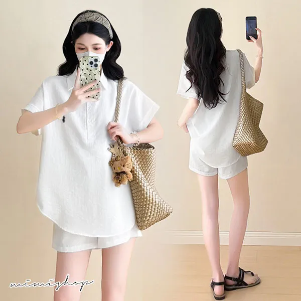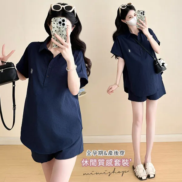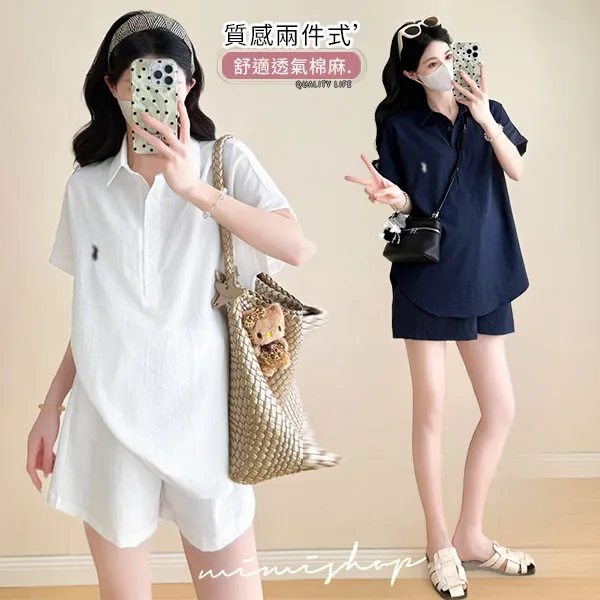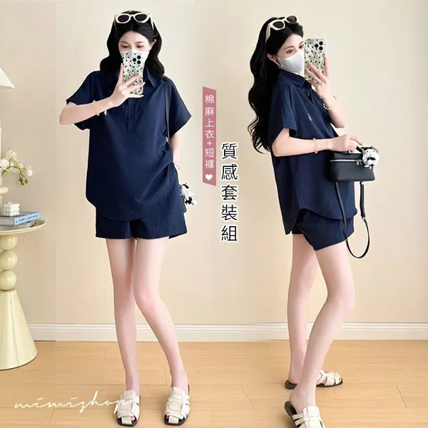 【P31762】質感兩件套 透氣棉麻polo上衣+短褲 孕婦套裝