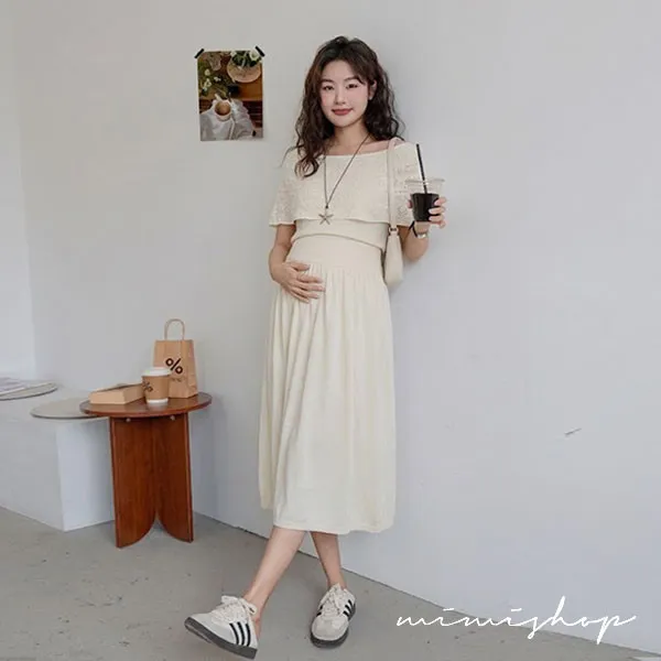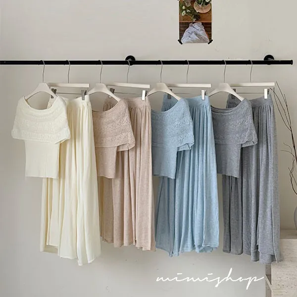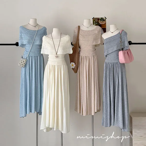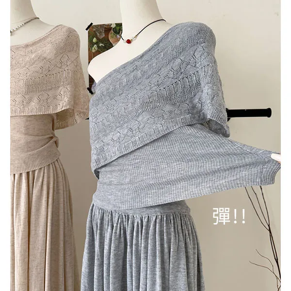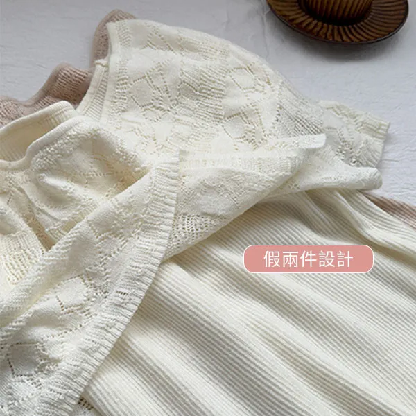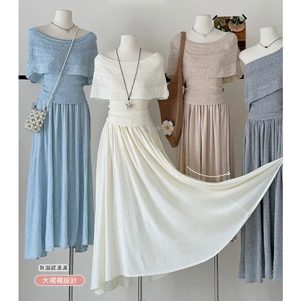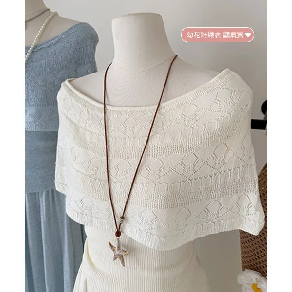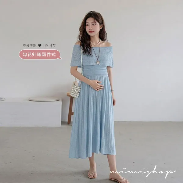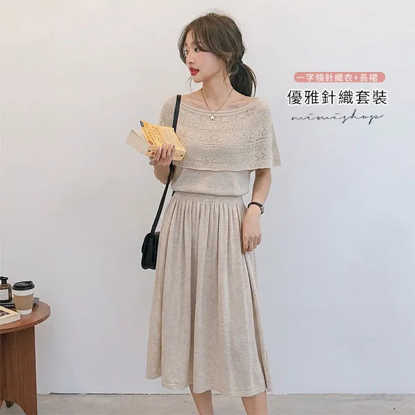 【P31763】優雅寵愛 兩件式 一字領勾花針織衣+彈力針織長裙 套裝