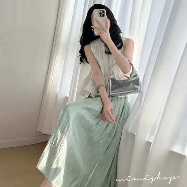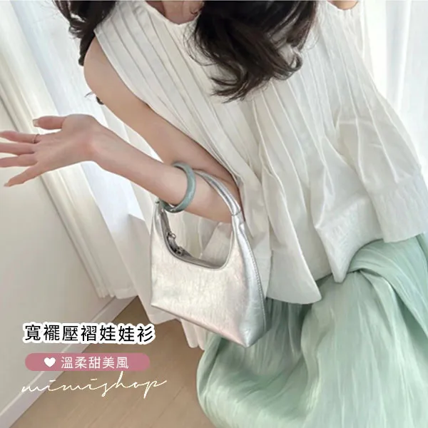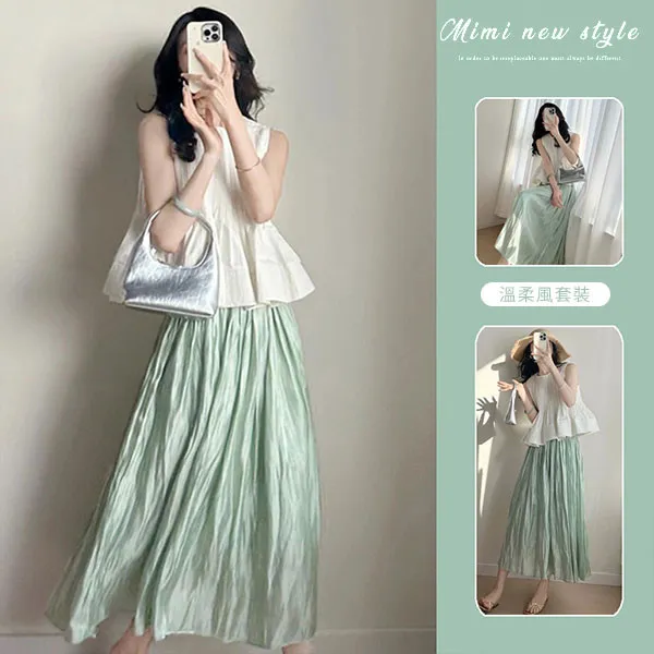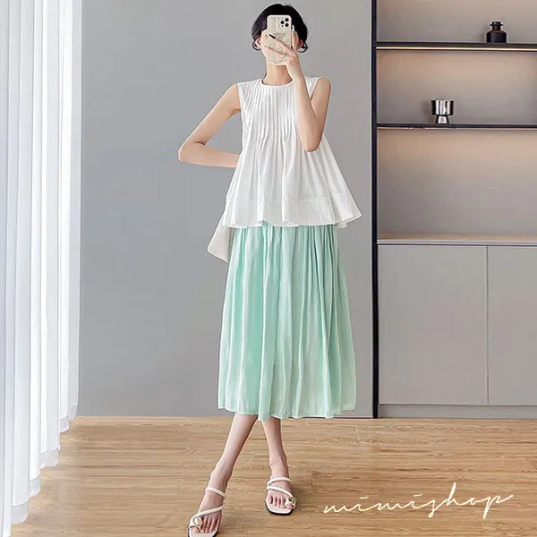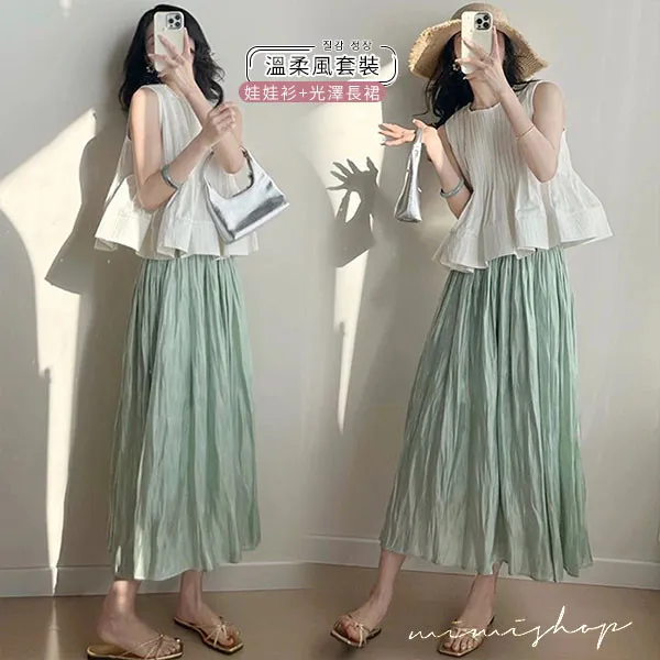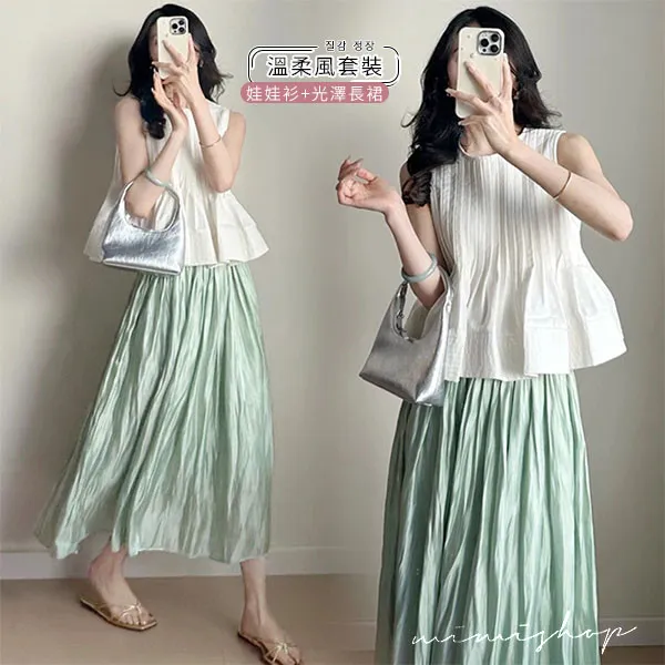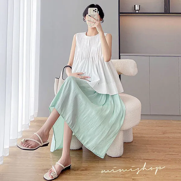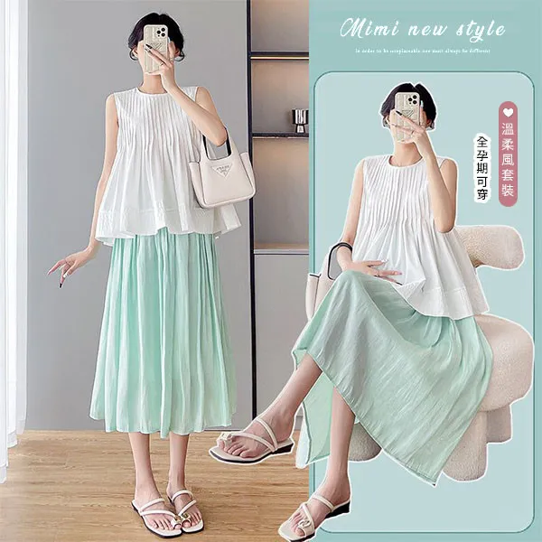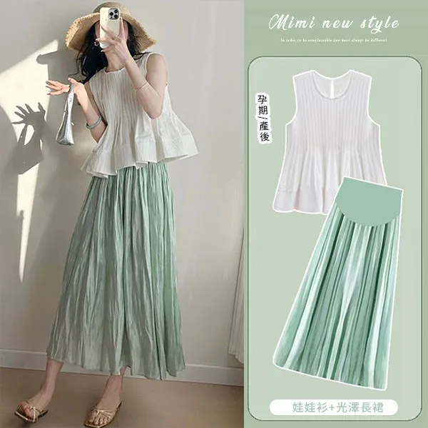 【P31766】法式午後 溫柔風壓褶娃娃衫+光澤長裙 孕婦套裝