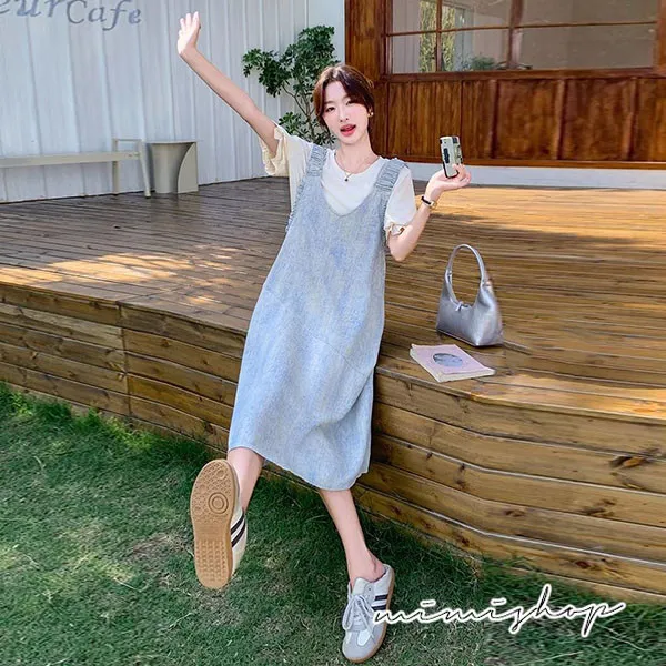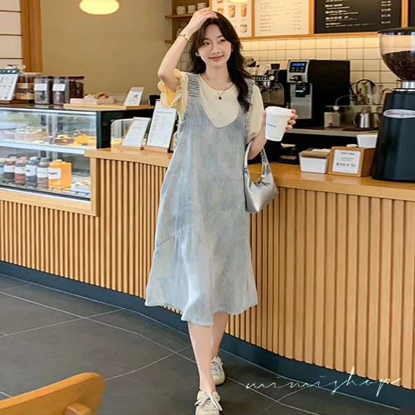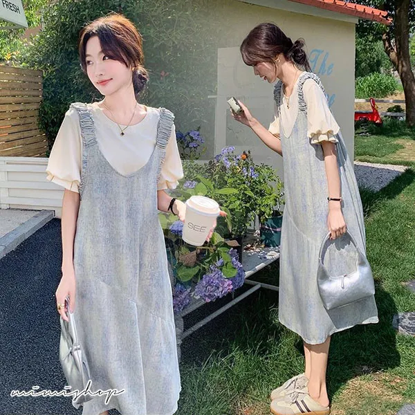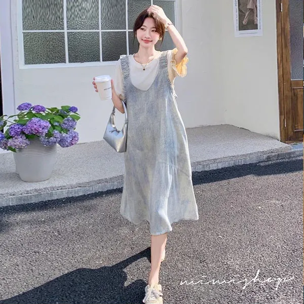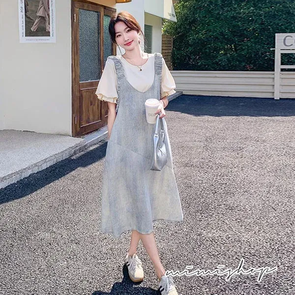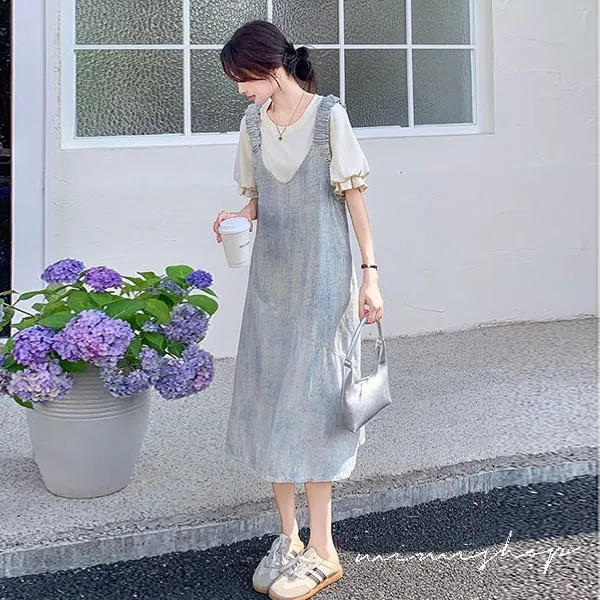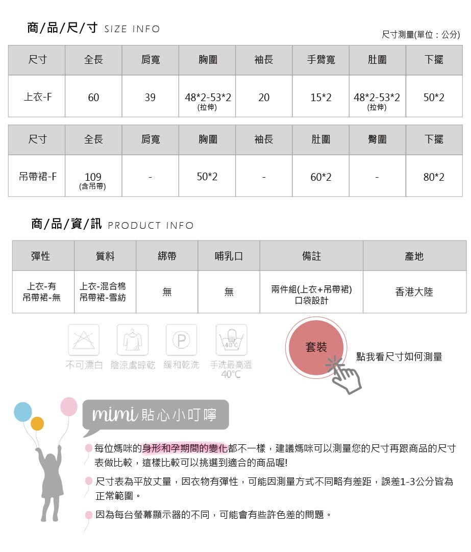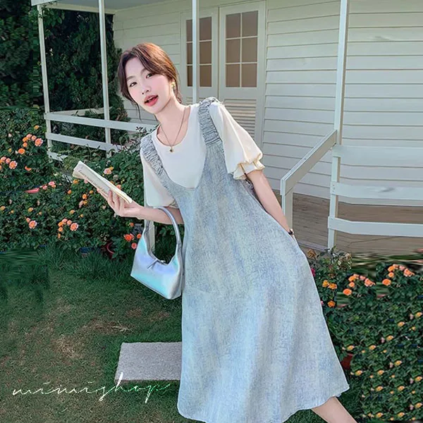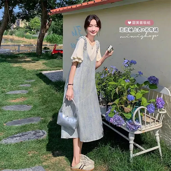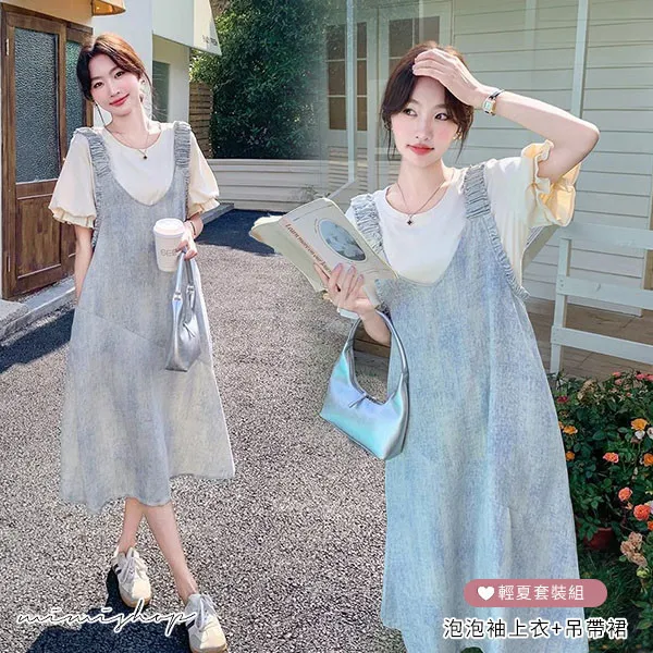 【P31768】輕夏旋律 兩件式 泡泡袖上衣+吊帶裙 孕婦洋裝 套裝