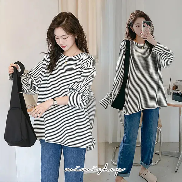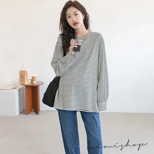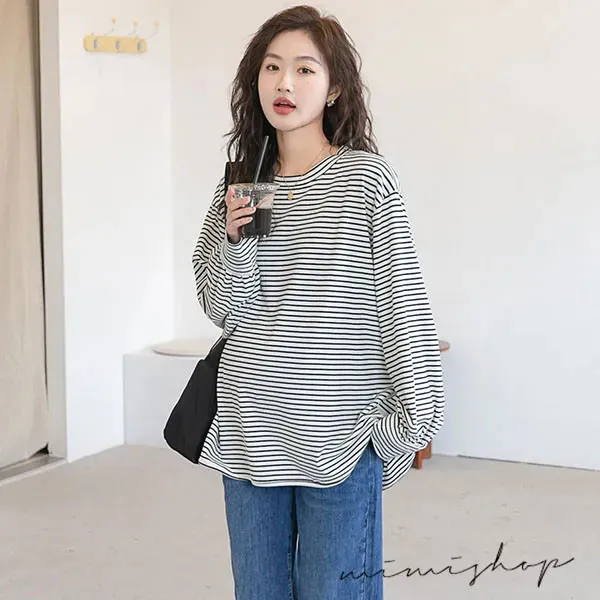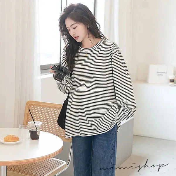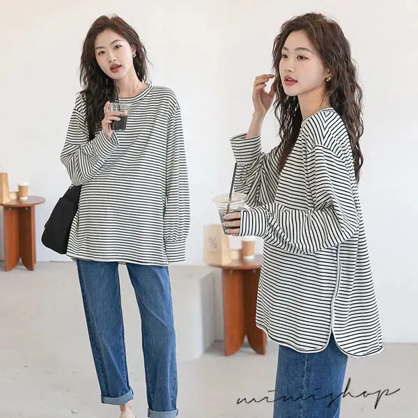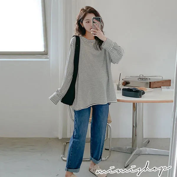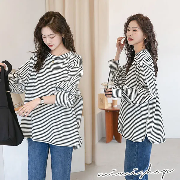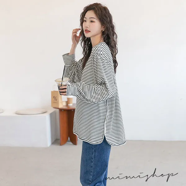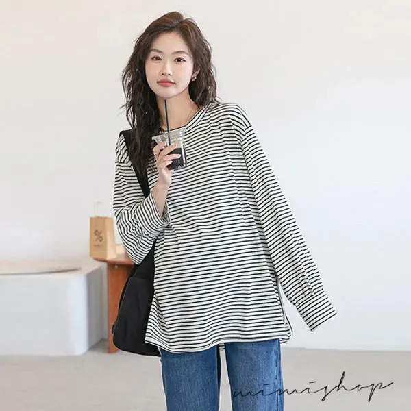 【P511137】簡單質感 長袖條紋寬版上衣 自在舒適
