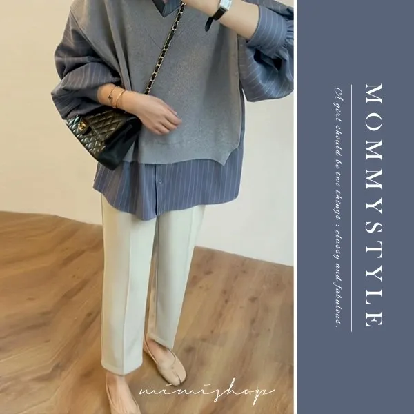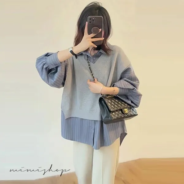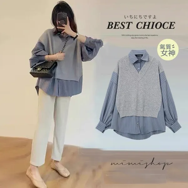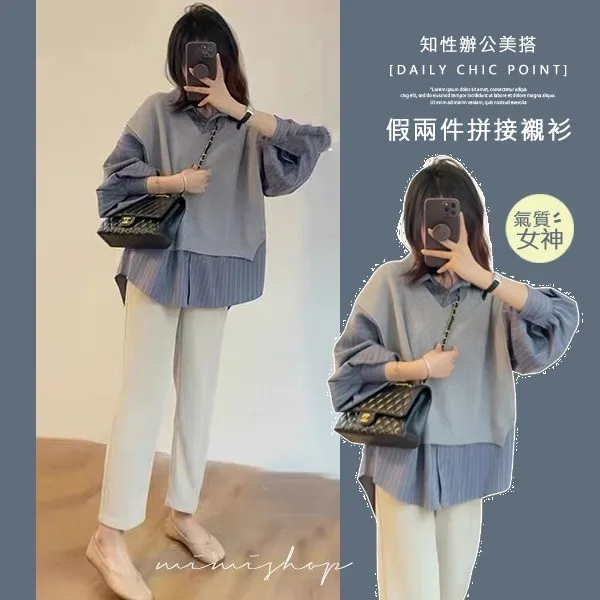 【P511154】顯瘦設計感 假兩件拼接針織襯衫 孕婦上衣 不限孕期