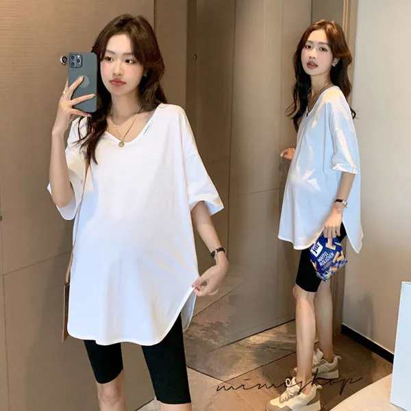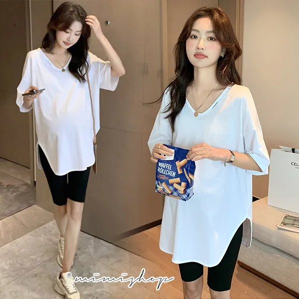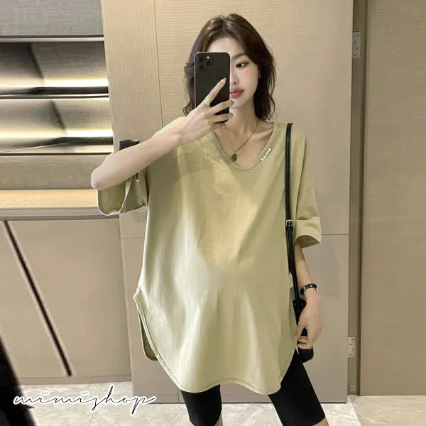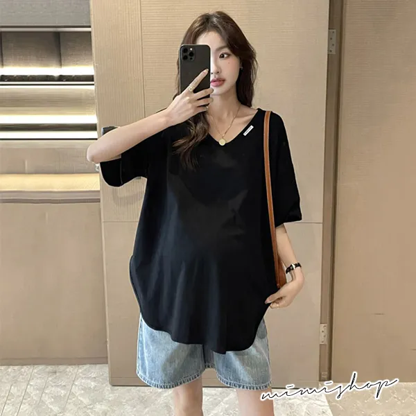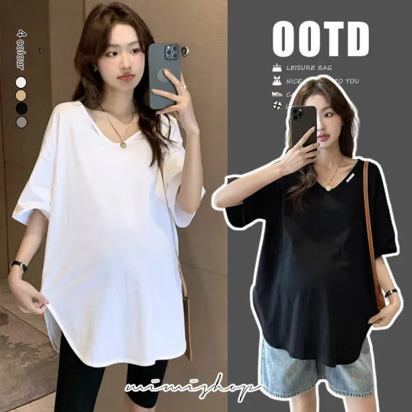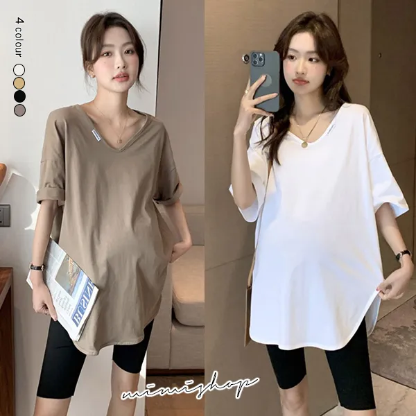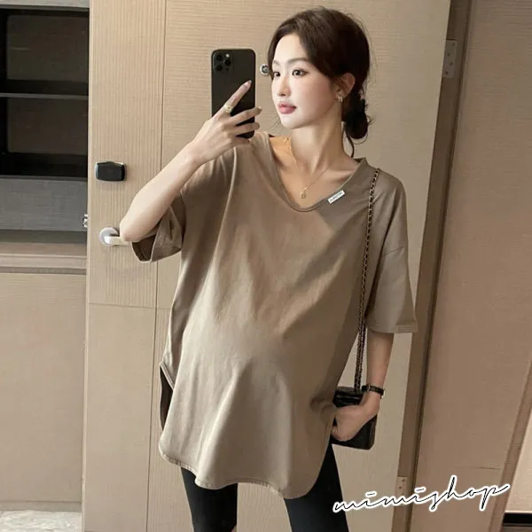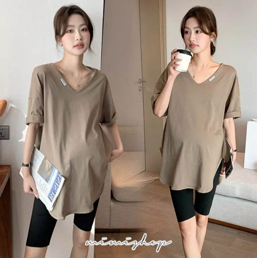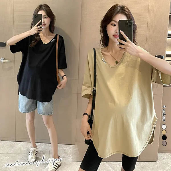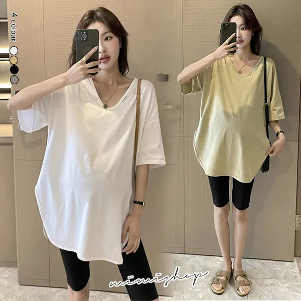 【P511194】率性百搭 純色V領長上衣 寬版修飾 不限孕期