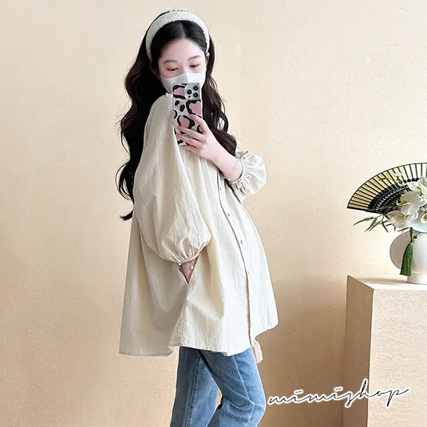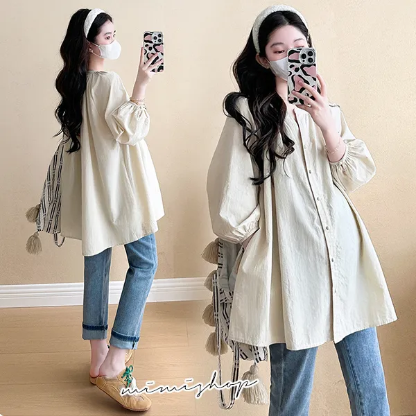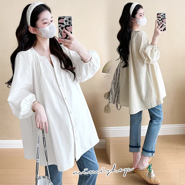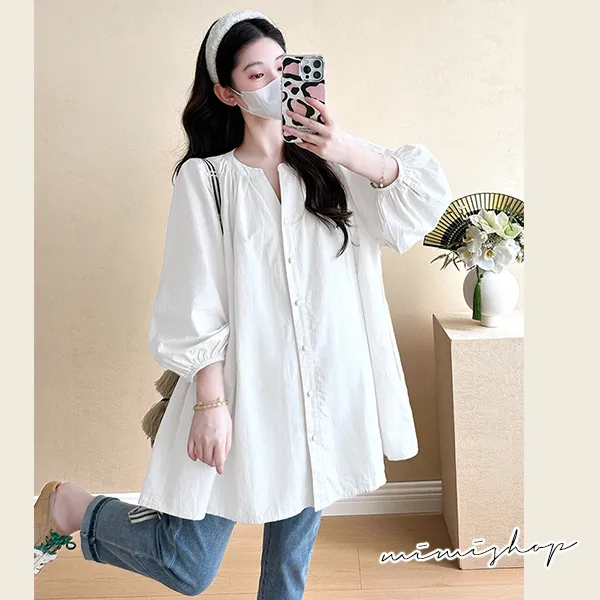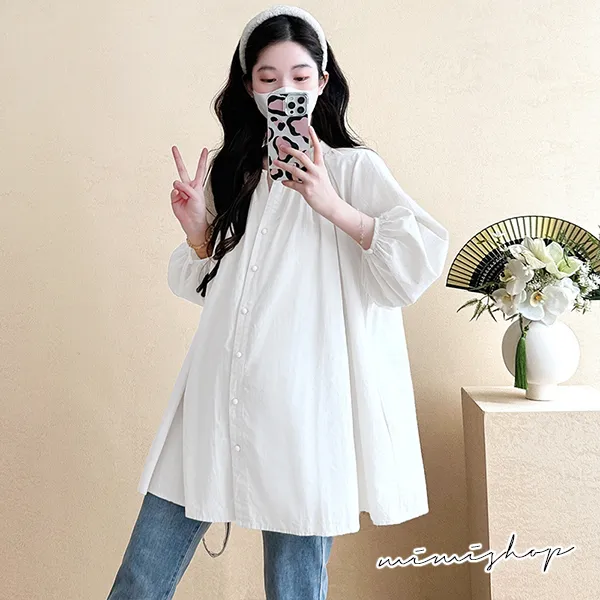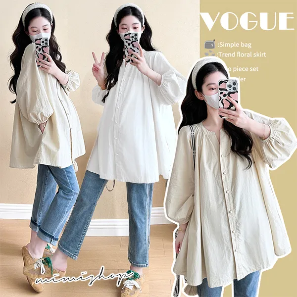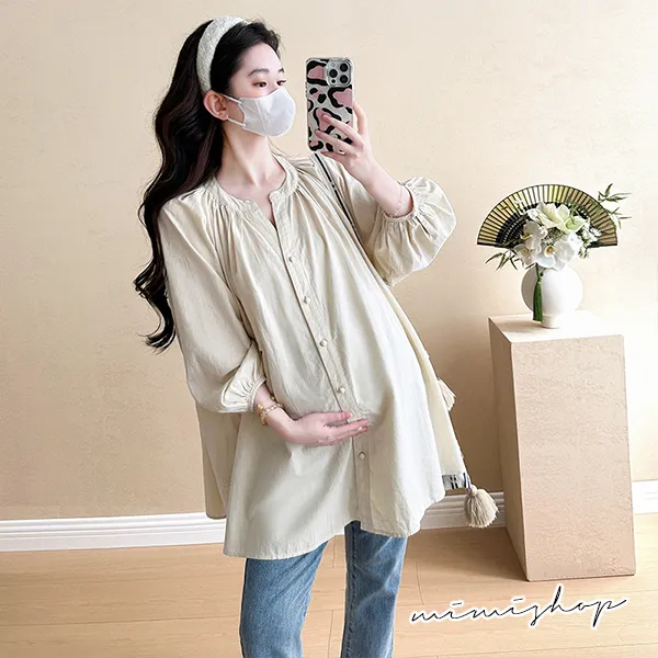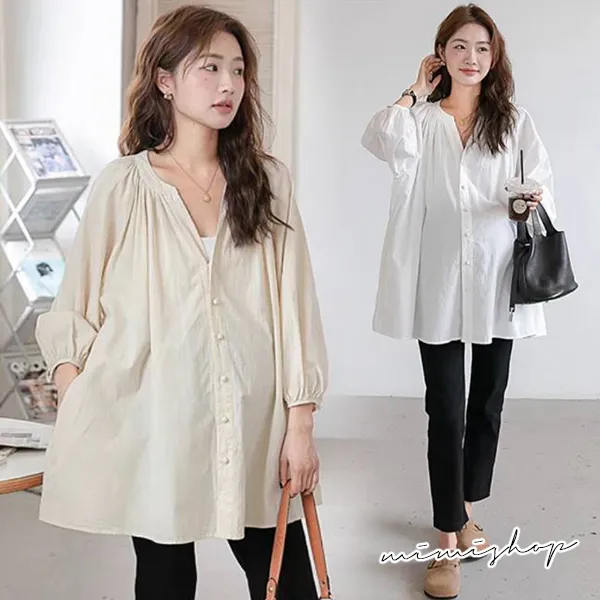 【P511201】清新雅緻 小V領口袋襯衫 長版上衣 孕婦裝