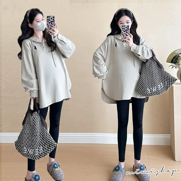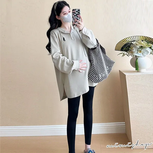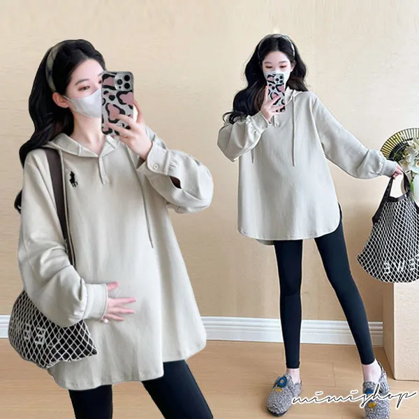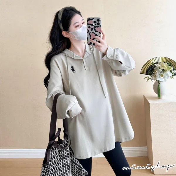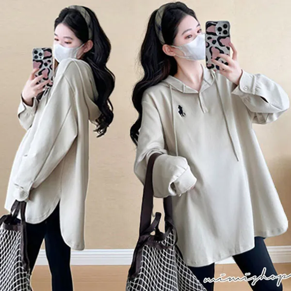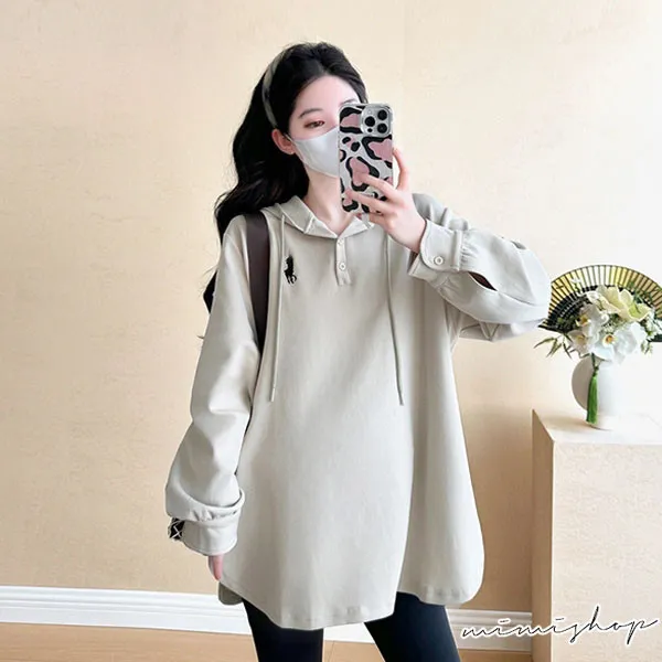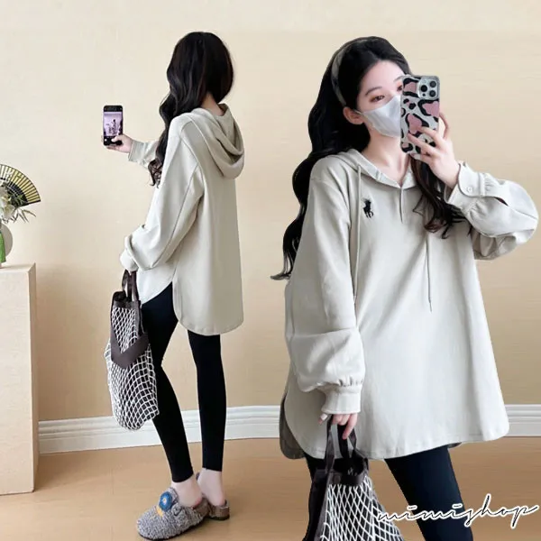 【P511210】好搭質感 寬鬆連帽刺繡長上衣 不限孕期