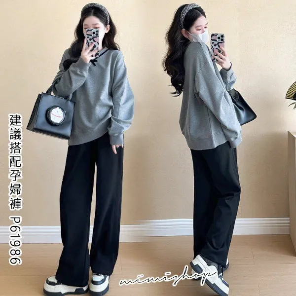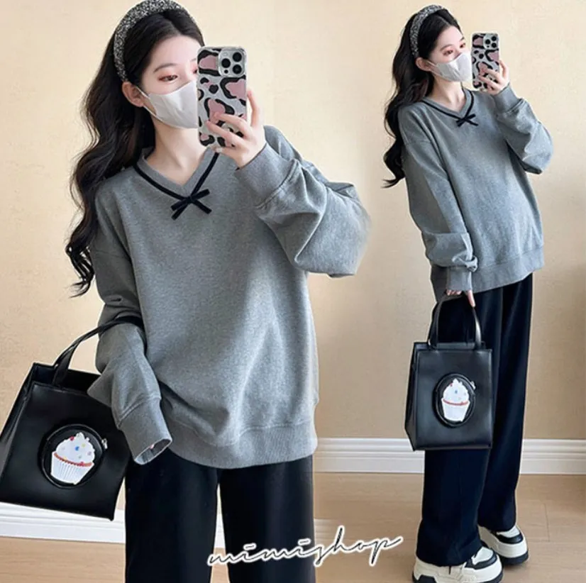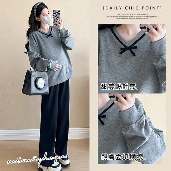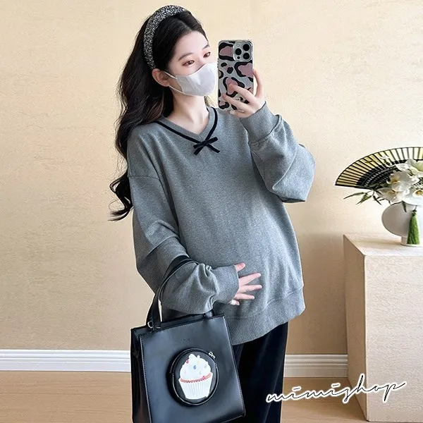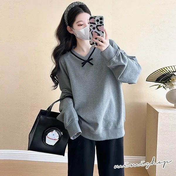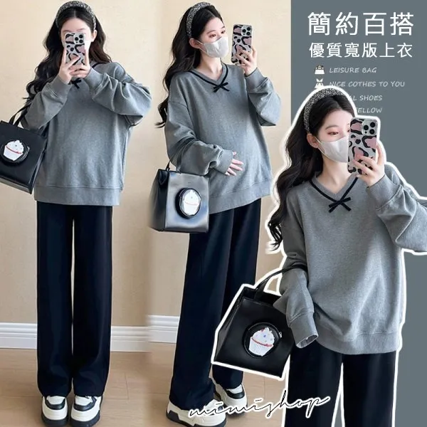 【P511225】簡約百搭 小v領蝴蝶結加厚寬版上衣 孕婦裝 不限孕期