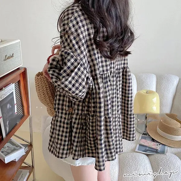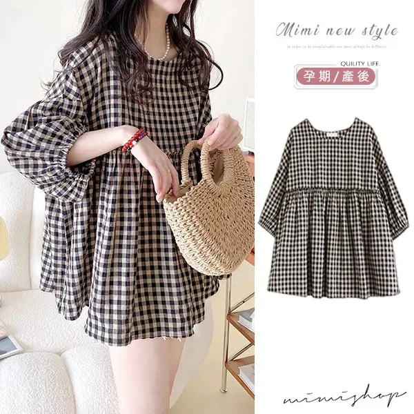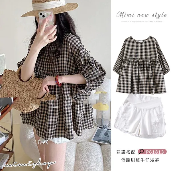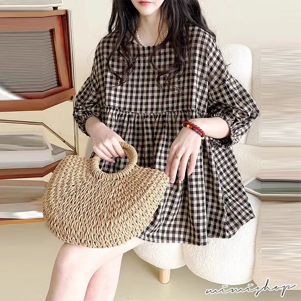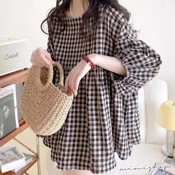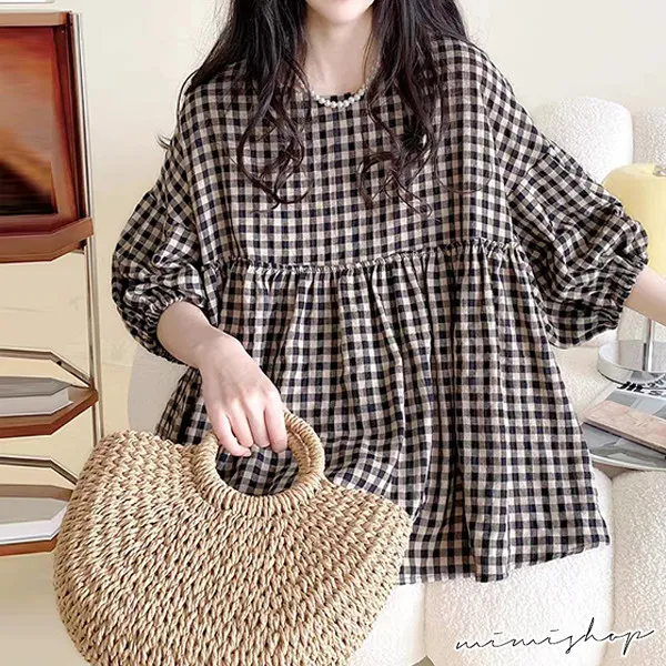 【P511284】簡單好搭 經典格子棉麻上衣 寬襬娃娃衫