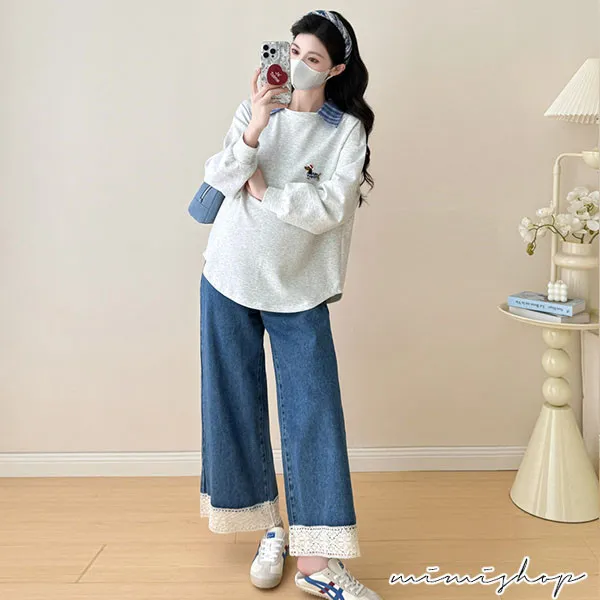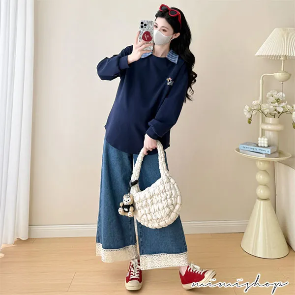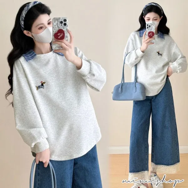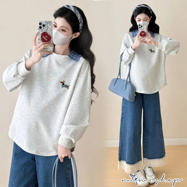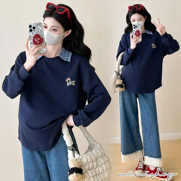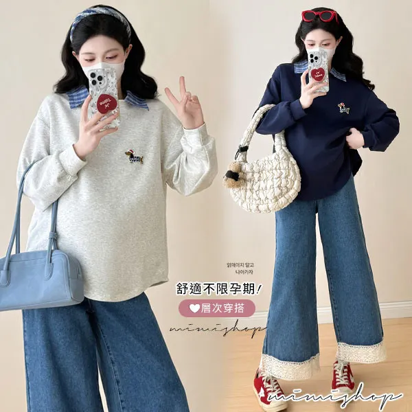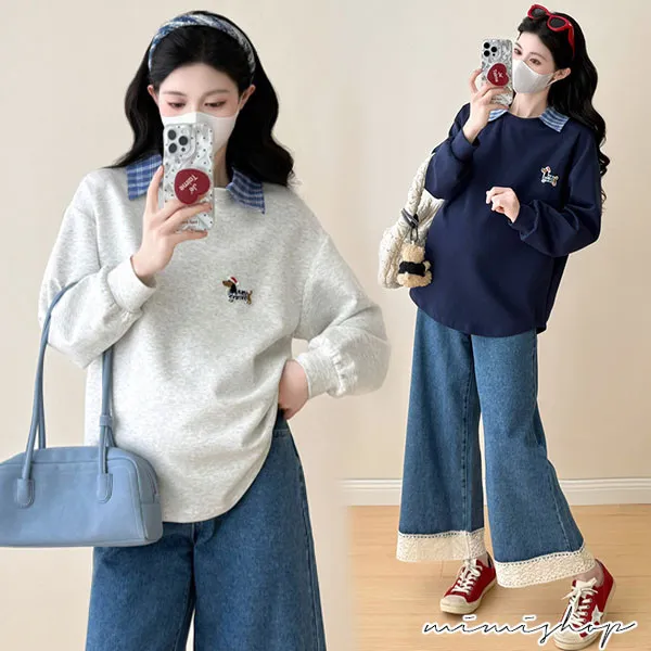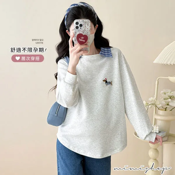 【P511311】完美舒適 假兩件格子領寬版上衣 刺繡狗狗 不限孕期