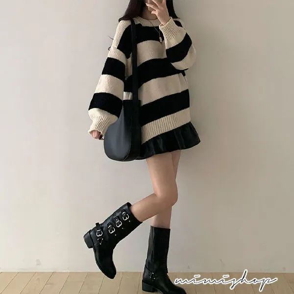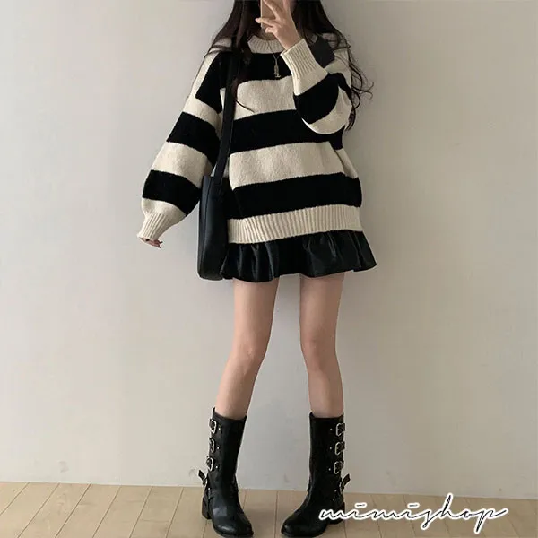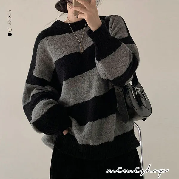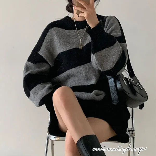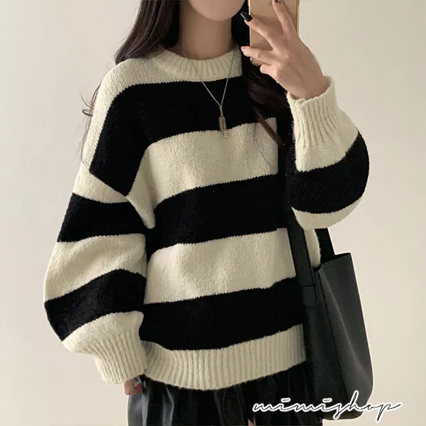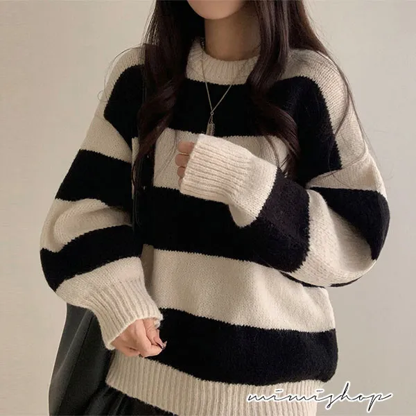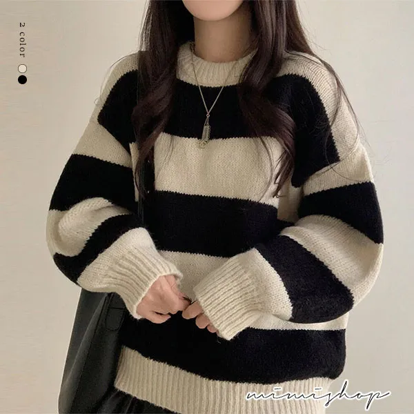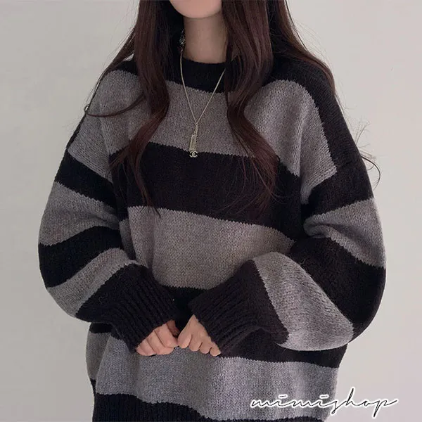 【P511331】簡約質感 圓領條紋針織衣 寬版毛衣